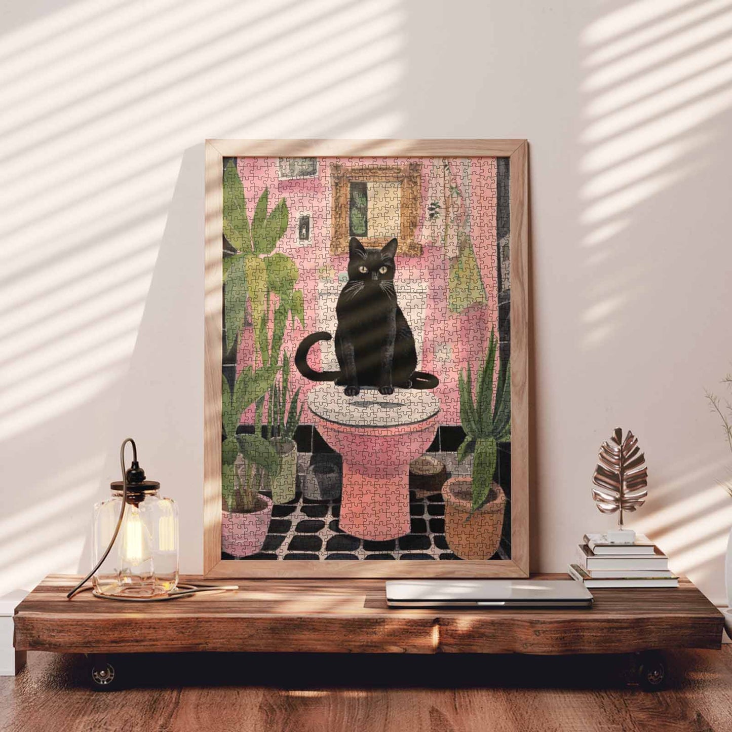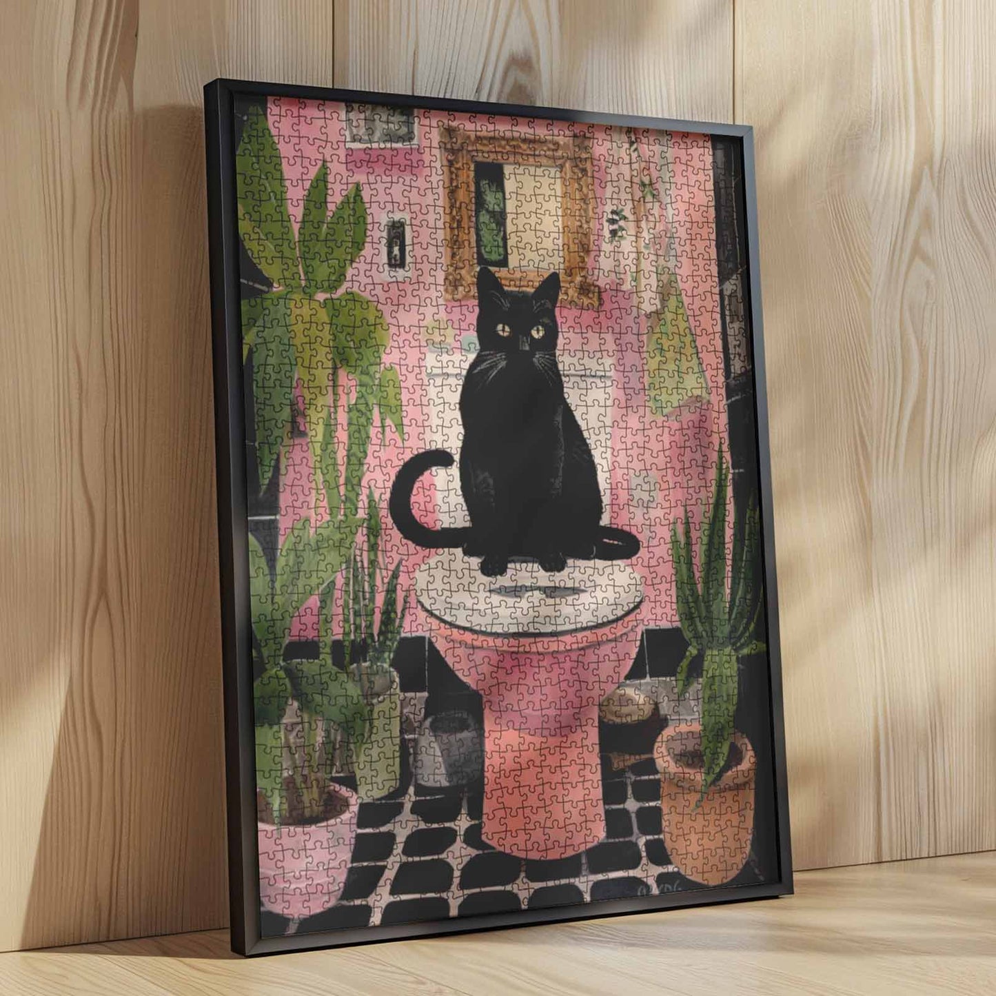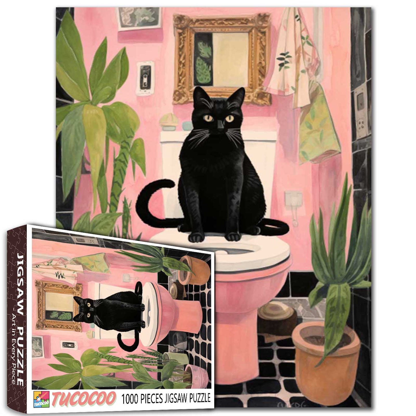 A black cat with piercing yellow eyes sits on a pink toilet, surrounded by plants and soft pink hues. This quirky scene captures feline mischief in a playful, colorful setting. Perfect for cat lovers and fans of unique bathroom decor. Enjoy piecing together this amusing and charming artwork that will brighten up any room.
