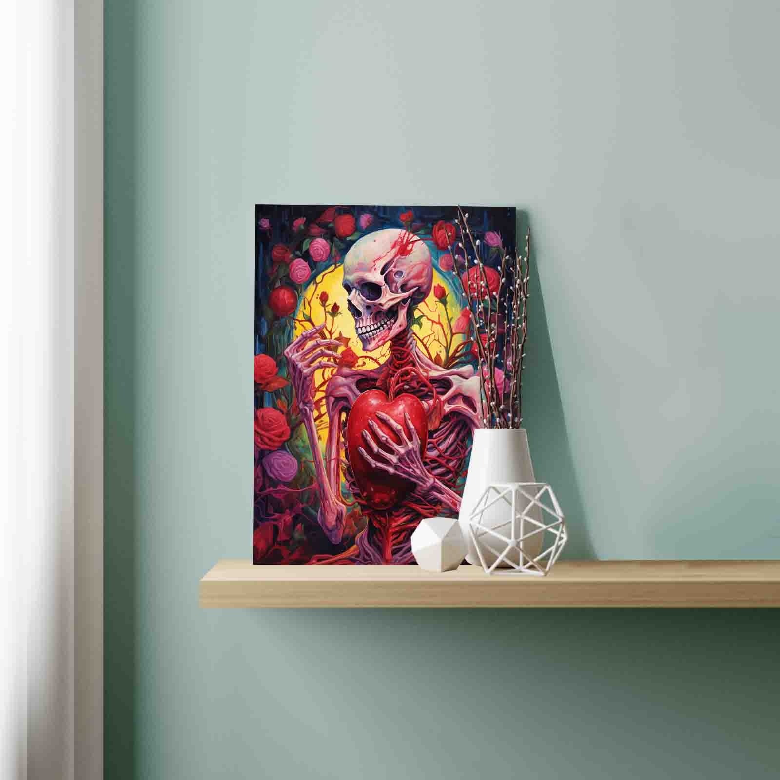 A skeleton clutches a vivid red heart, veins and arteries still entwined, pulsing with the remnants of emotion. Surrounded by blooming roses and bathed in golden light, it smiles—perhaps from a memory, perhaps from eternal longing. In one bony hand, it gently holds a petal, as if savoring the tenderness of life once felt. This painting captures the haunting beauty of undying love, where passion defies even the grave. It's a visceral, poetic tribute to the idea that love, in all its rawness, survives beyond flesh and time.