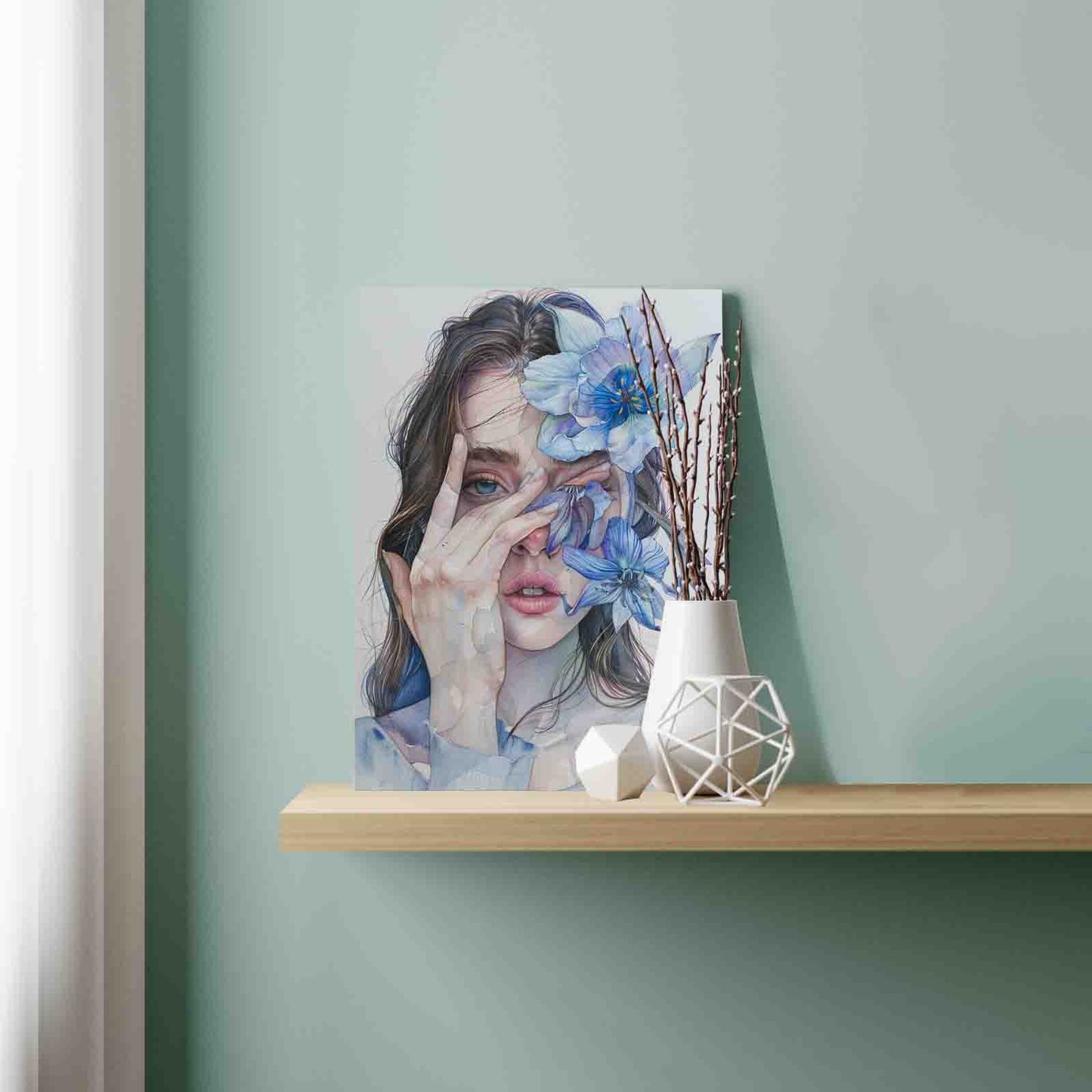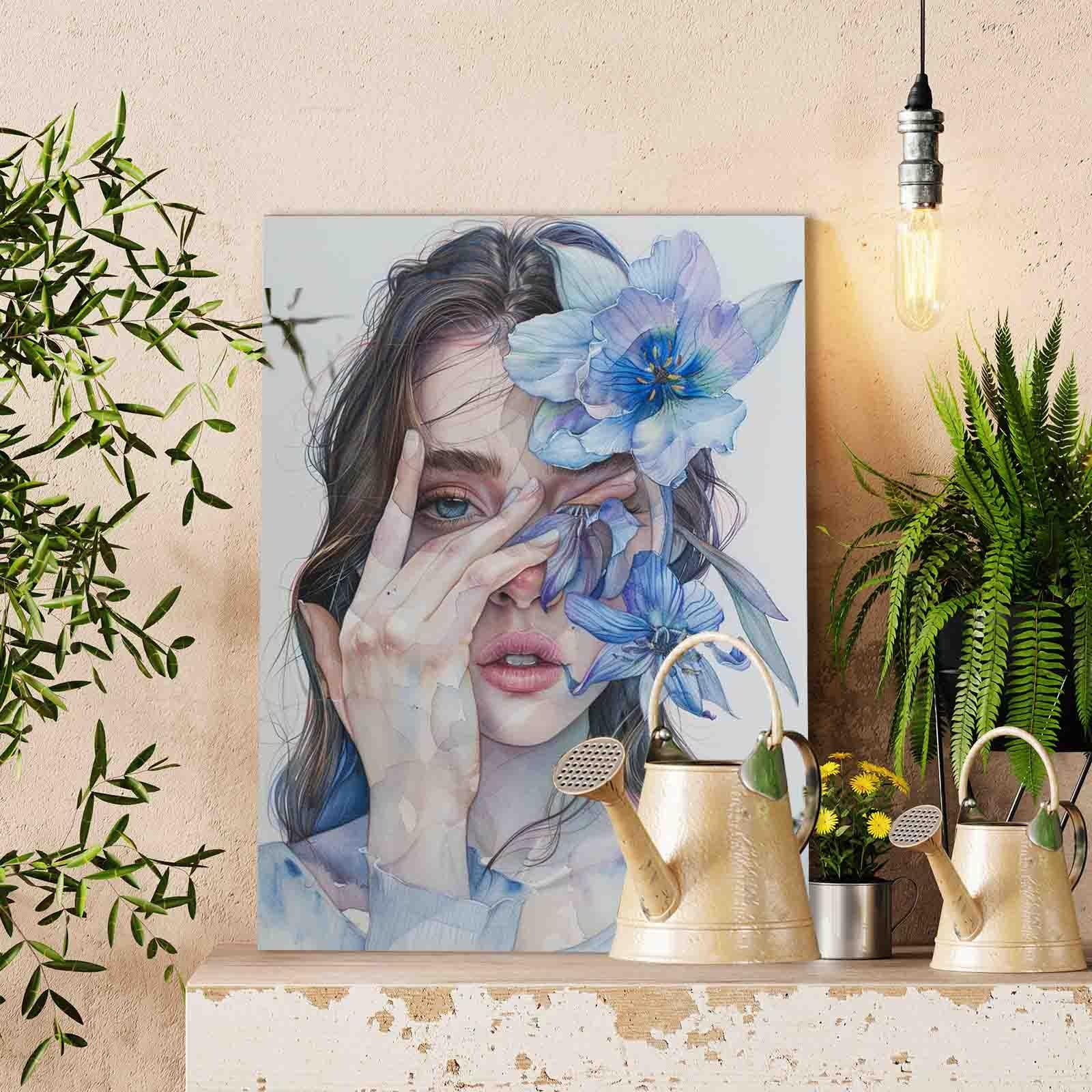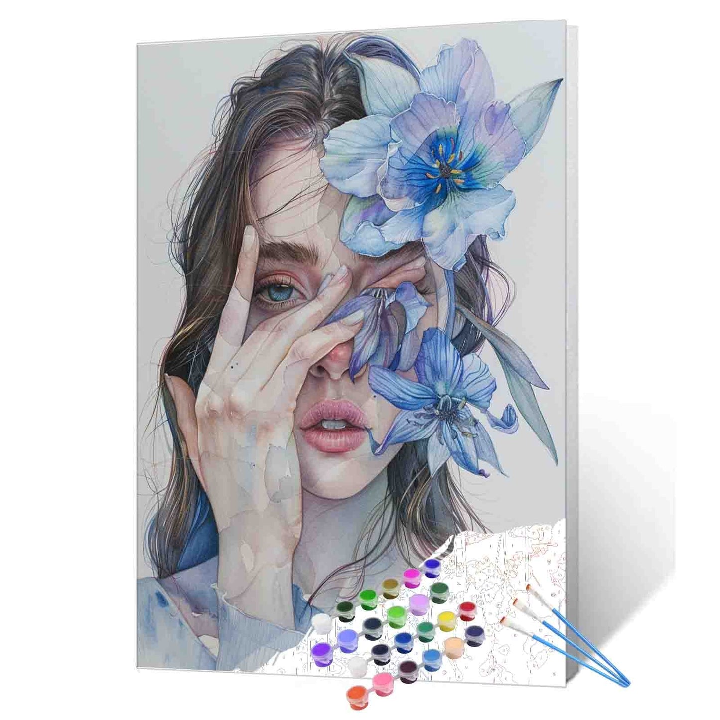 Half her face hidden behind her delicate hand, she peers through a cascade of blooming blue flowers. Soft petals brush against her skin, blurring the line between beauty and nature. Each detail in this artwork invites you to explore the fragile balance of vulnerability and strength. As you paint, you'll breathe life into this moment of stillness, where emotion and elegance intertwine on canvas.