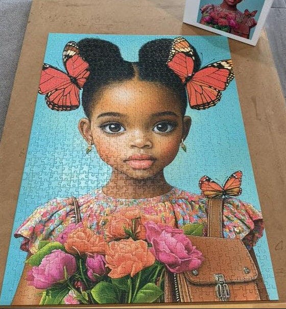 This enchanting puzzle features a young girl with radiant eyes, surrounded by vibrant flowers and vivid red butterflies in her hair. Her delicate expression and the intricate details make this puzzle both captivating and heartwarming. Can you bring this stunning scene to life, piece by piece?