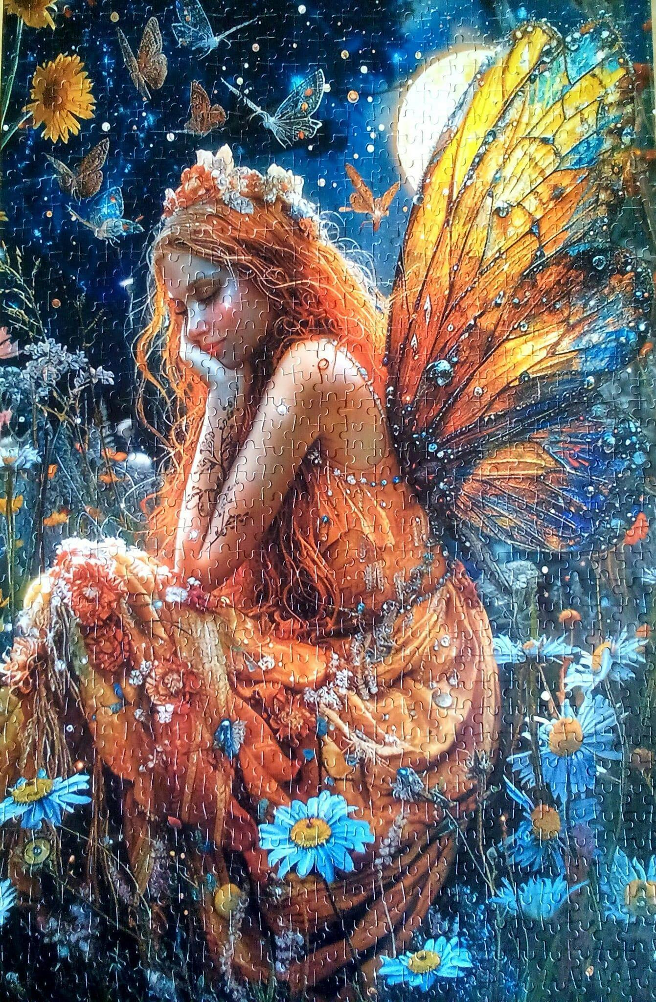 Enter a magical world with this enchanting jigsaw puzzle, featuring a delicate fairy resting in a moonlit field of wildflowers. Her glowing butterfly wings shimmer in the night sky, surrounded by fluttering companions. Perfect for fantasy lovers and dreamers, this puzzle blends elegance with wonder.