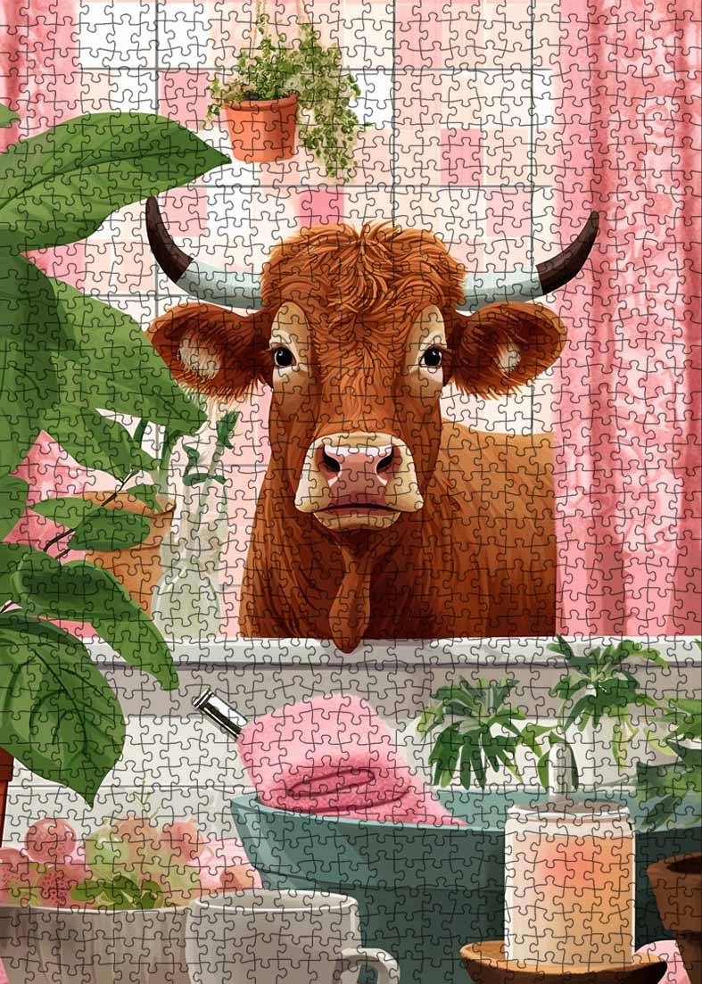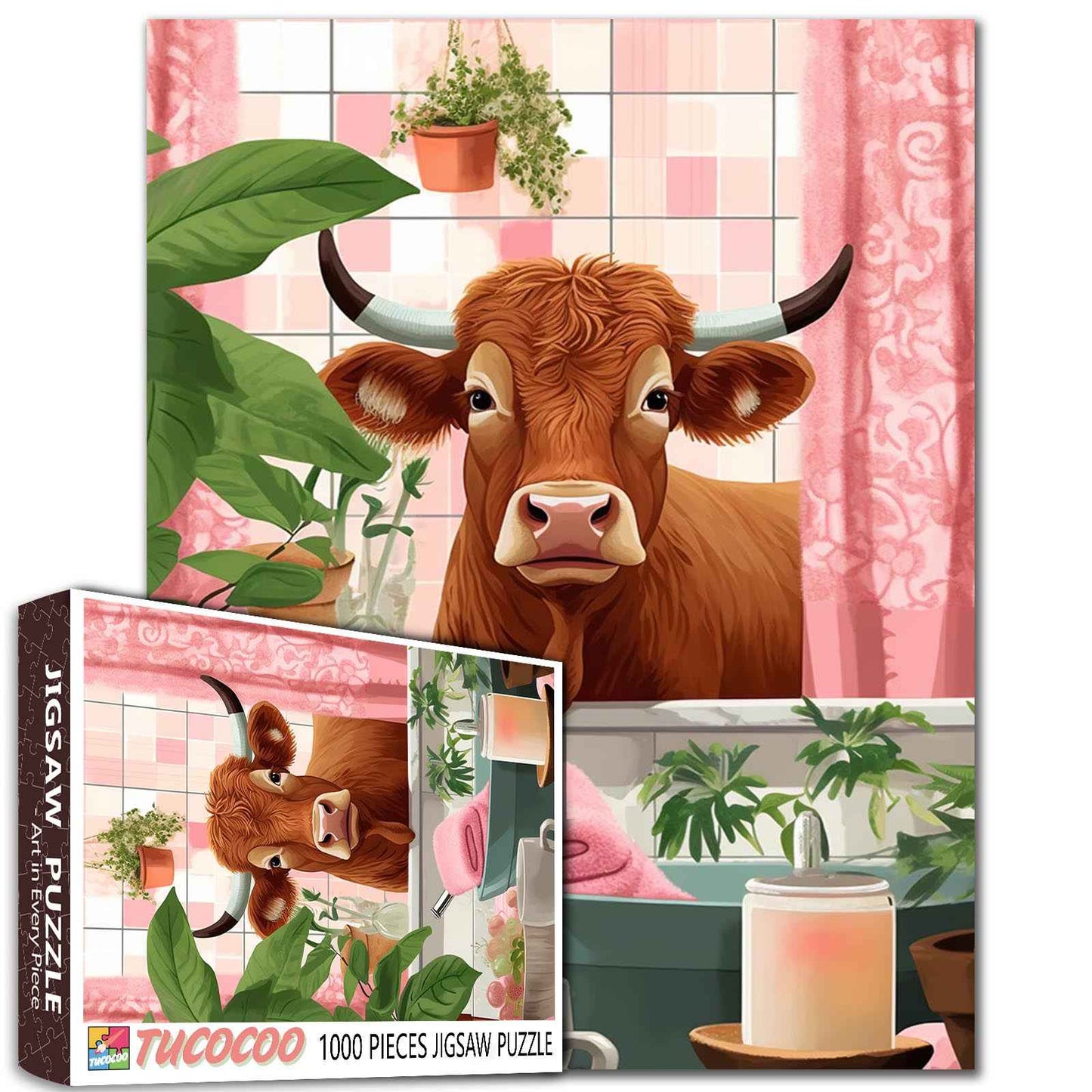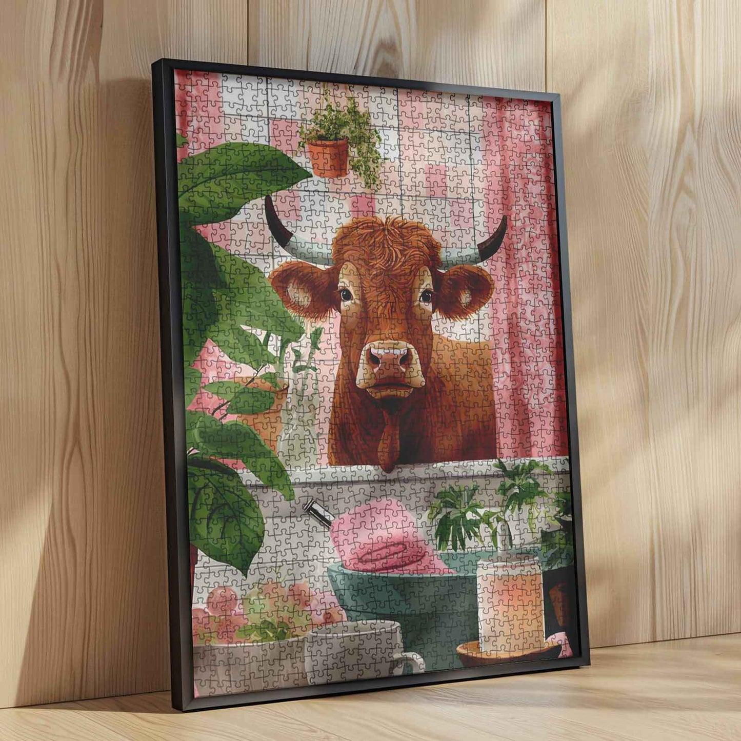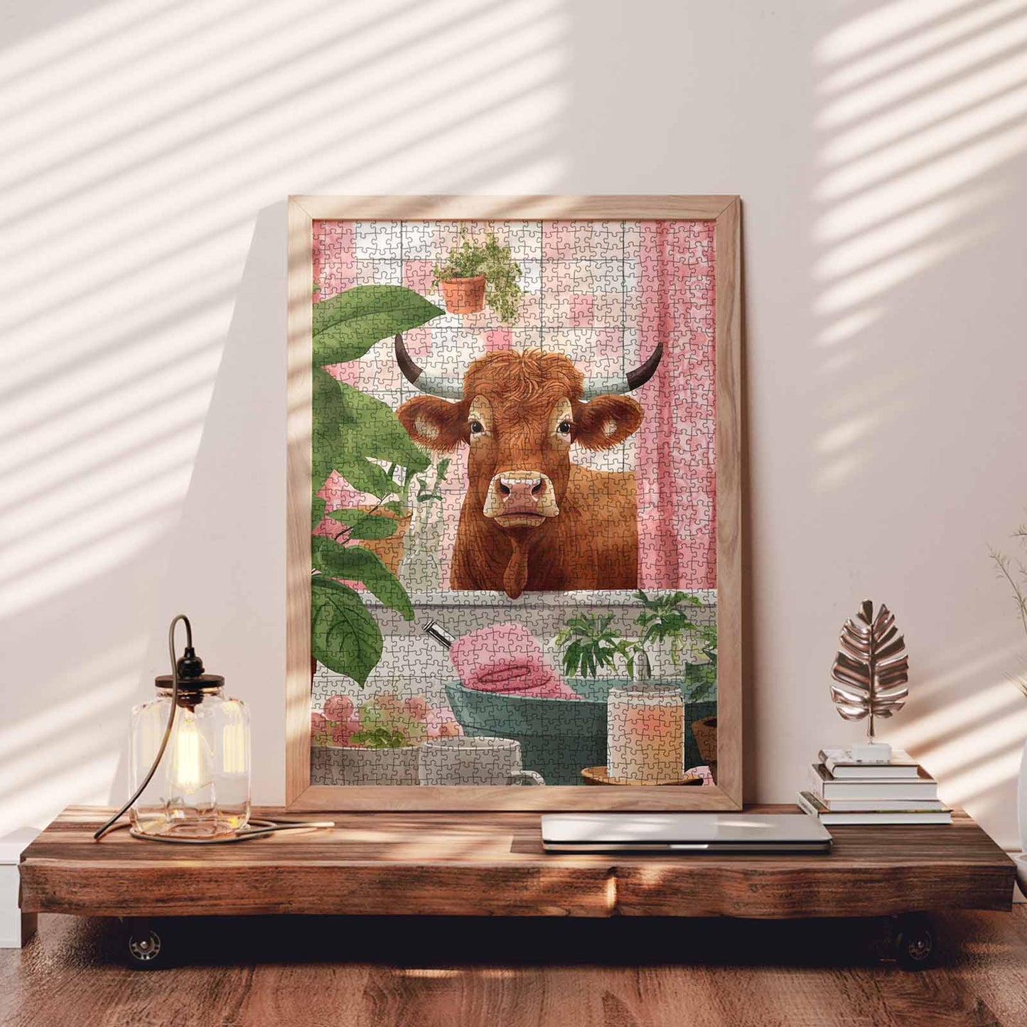 A playful cow peeks over the edge of a pastel pink bathtub, creating an amusing and endearing scene in a cozy bathroom. Surrounded by lush green plants and soft towels, this puzzle offers a delightful challenge with its charming combination of animal whimsy and serene bathroom decor. The cow's curious gaze adds an unexpected touch of humor, making it the perfect puzzle for animal lovers and those who enjoy quirky, fun artwork. As you piece together this joyful scene, let the relaxing atmosphere and unique subject transport you to a peaceful, yet amusing world.