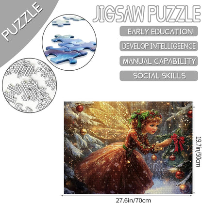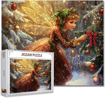 - This enchanting Christmas jigsaw puzzle features a beautiful fairy adorned with twinkling lights, carefully decorating a snowy Christmas tree with shimmering ornaments. The scene is filled with festive details, creating a magical and heartwarming atmosphere. Perfect for holiday fun!