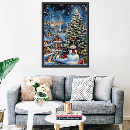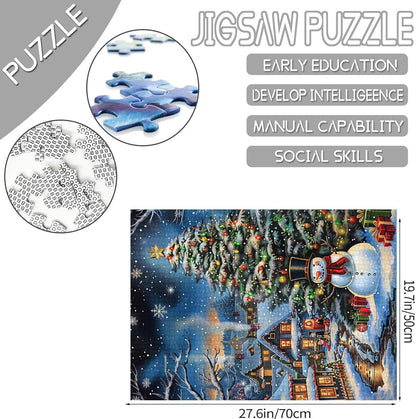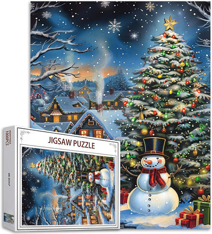 - This charming Christmas jigsaw puzzle features a cozy winter village scene with a beautifully decorated Christmas tree, a friendly snowman, and twinkling lights. It's the perfect way to add some holiday cheer to your home this season!