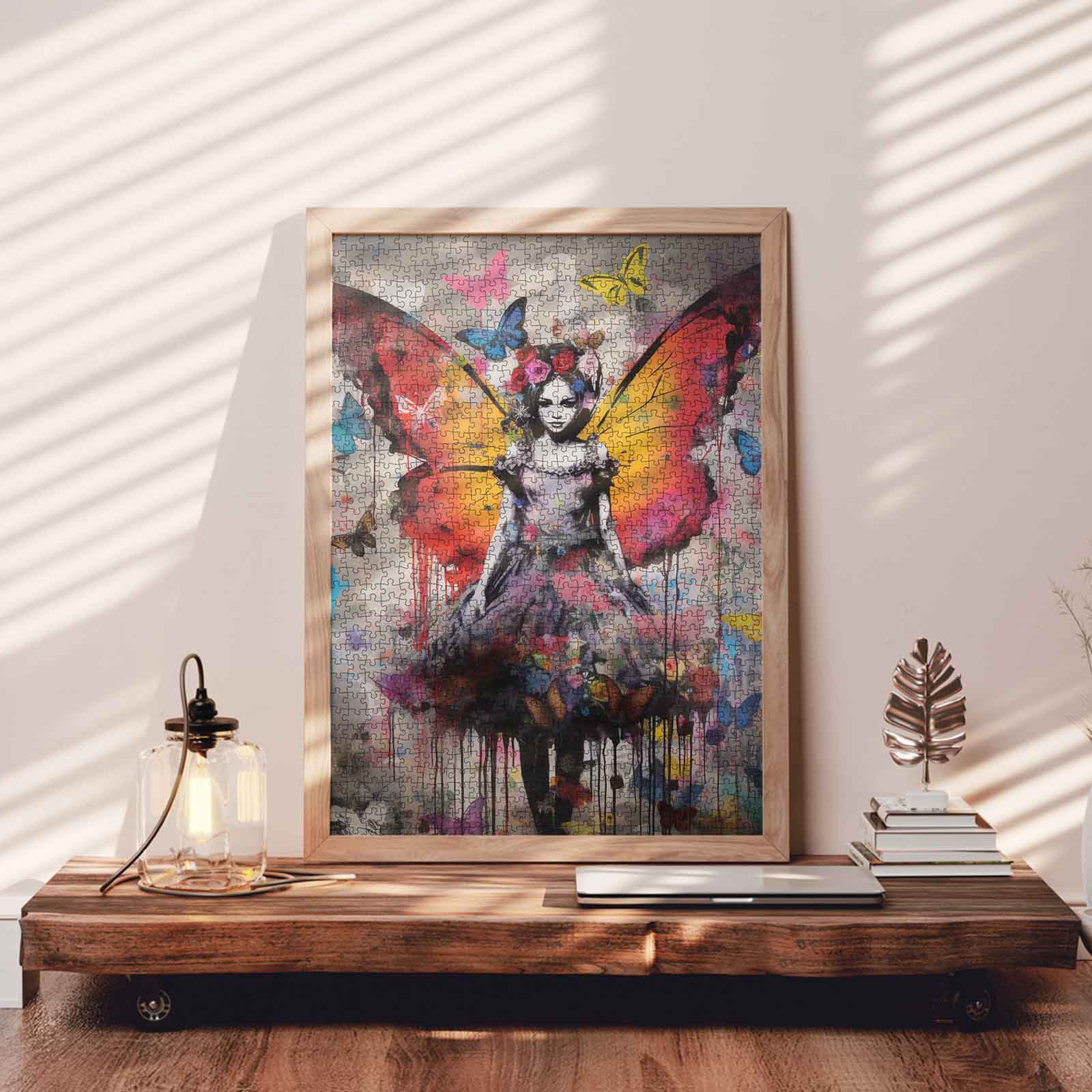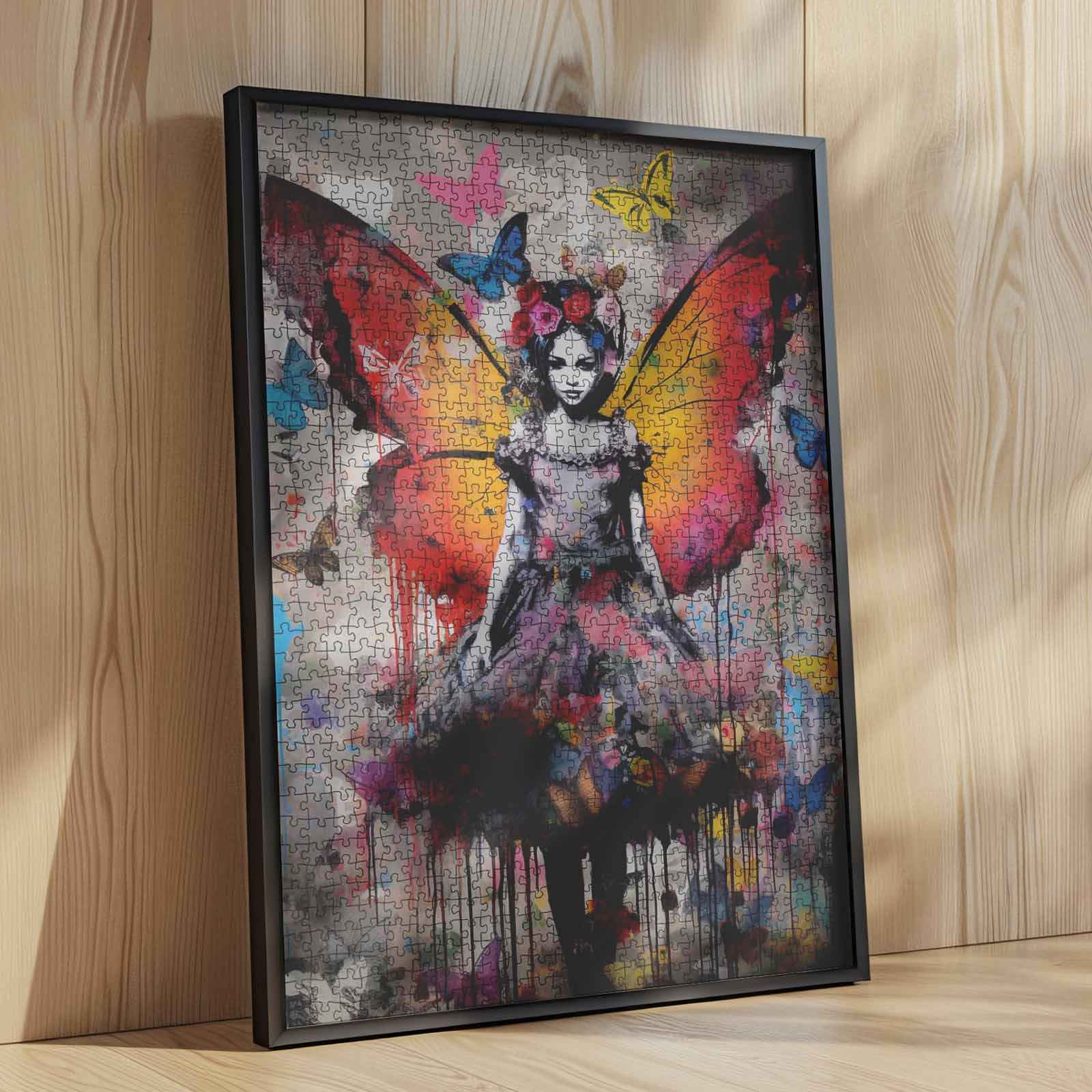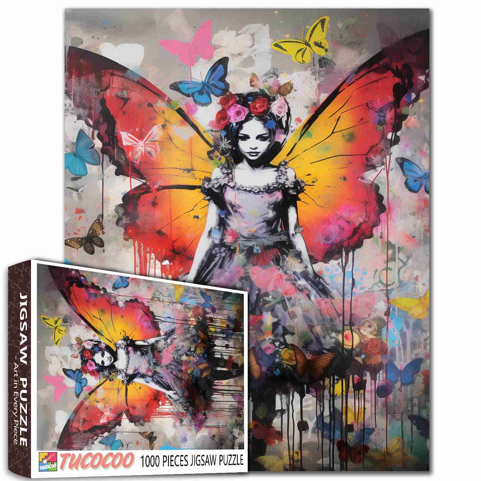 A mesmerizing image of a girl with butterfly wings, surrounded by vibrant colors and flowers. Her wings radiate with hues of yellow, orange, and pink, while butterflies flutter around her. The girl stands confidently with a hint of mystery in her expression, offering a unique blend of beauty and imagination. As you piece together this puzzle, you’ll bring this enchanting scene to life, full of color and whimsy. The bright colors and striking imagery make it a challenging yet rewarding puzzle for any art lover.