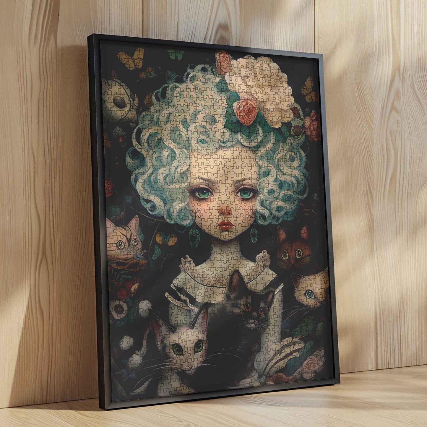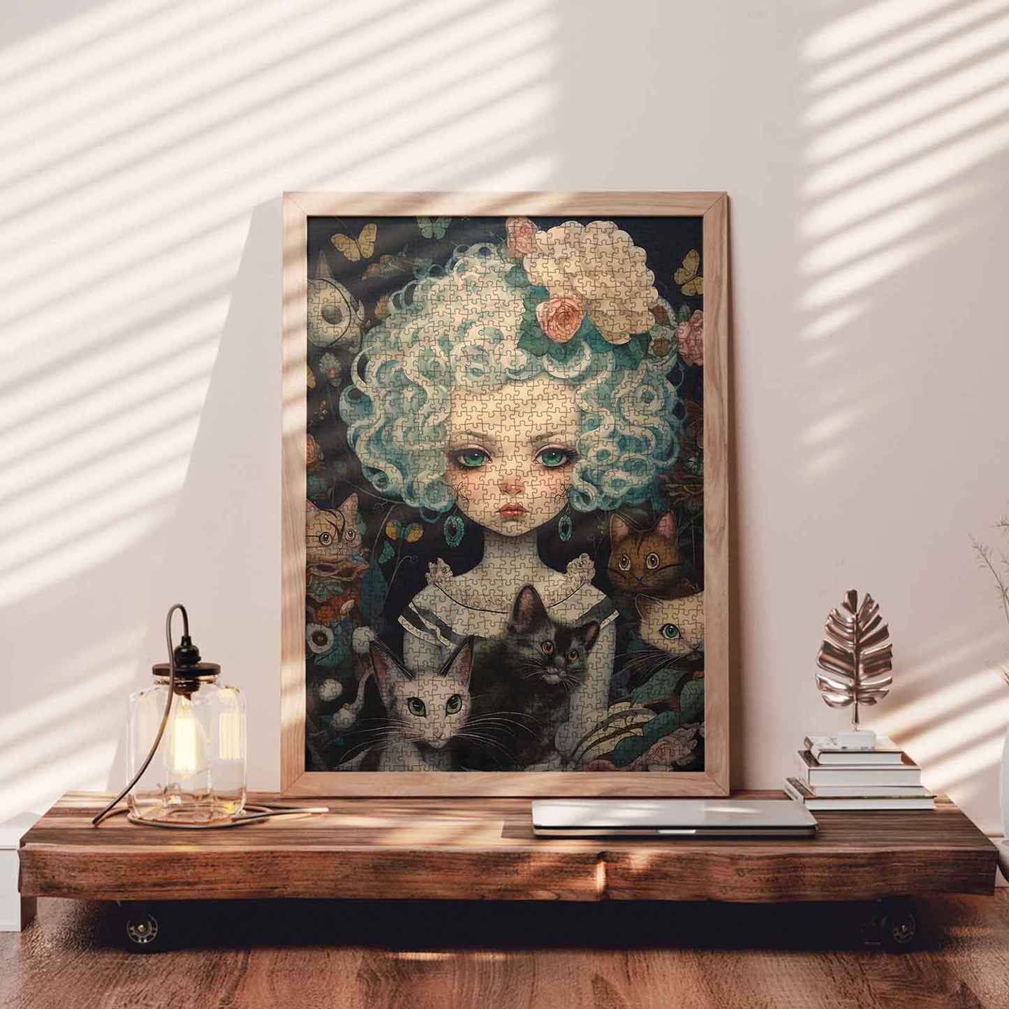 A beautiful girl with curly blue hair, surrounded by three curious cats and delicate flowers. Her large eyes and enchanting expression draw you into a dreamy world. The soft pastel colors and intricate details of her outfit and the background will keep you engaged as you piece together this lovely, imaginative scene. A perfect puzzle for those who appreciate fantasy art, feline charm, and whimsical beauty.
