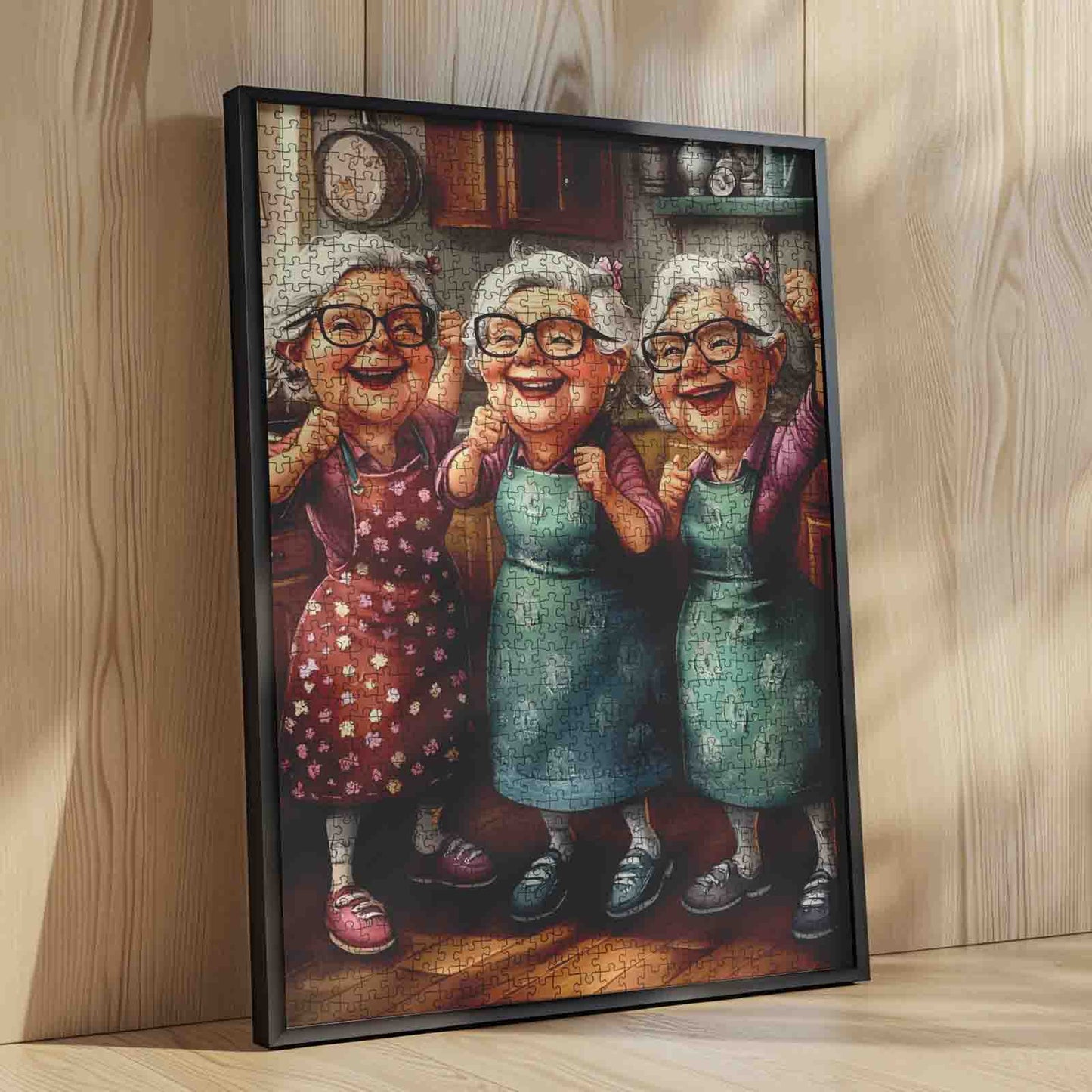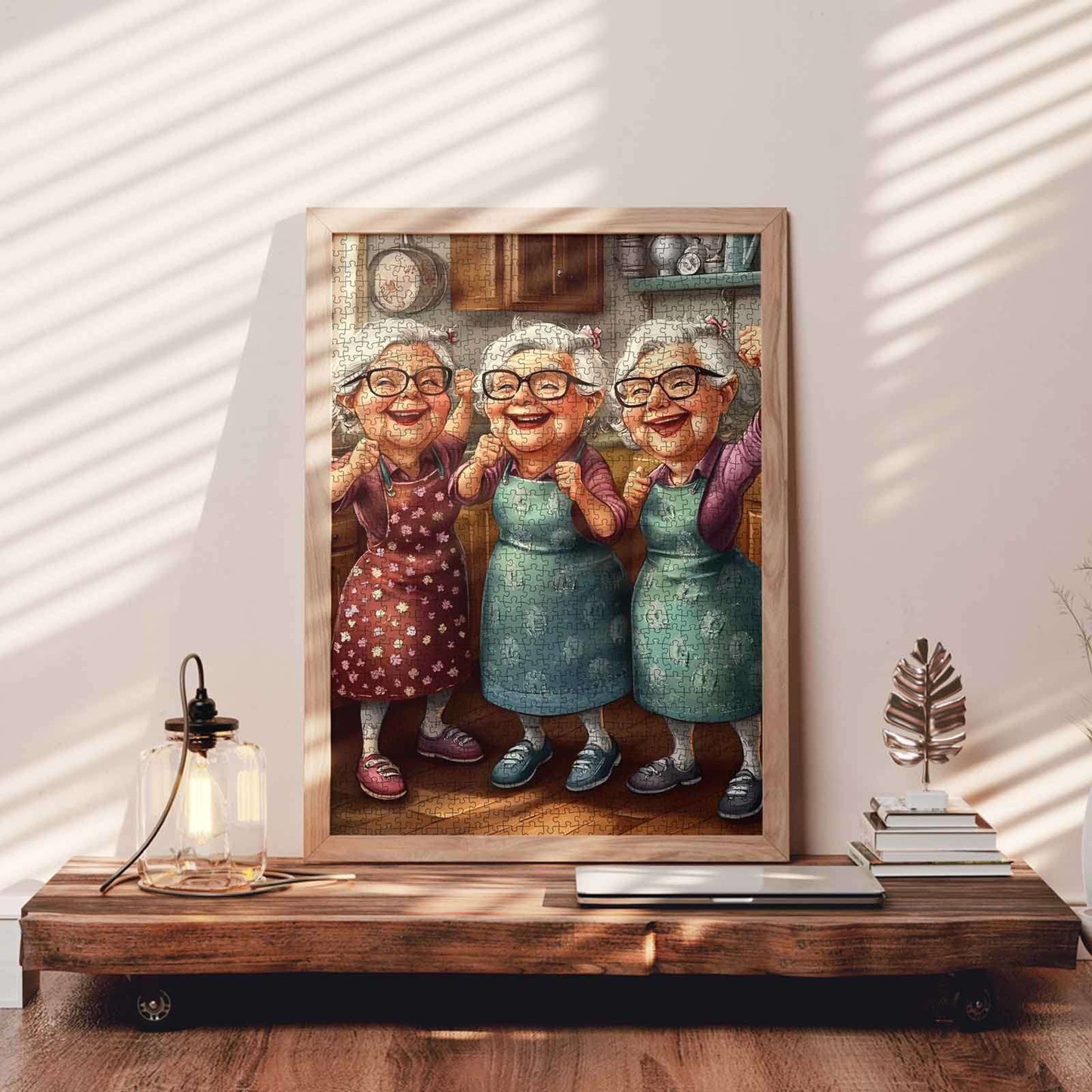 Three cheerful grandmas wearing colorful aprons and bright smiles throw their arms up in glee as they dance together in a cozy kitchen. Their matching glasses, rosy cheeks, and joyful energy fill the room with laughter and warmth. This playful puzzle celebrates friendship, aging with joy, and the magic of simple moments. A delightful image to piece together with family, sparking smiles at every turn.