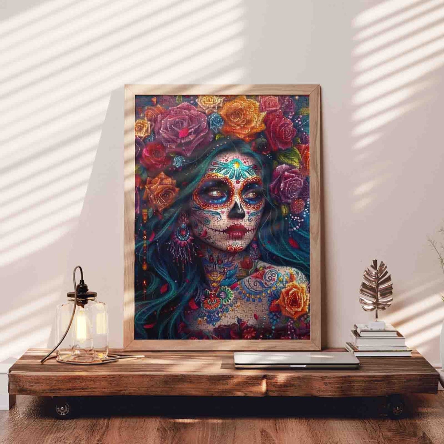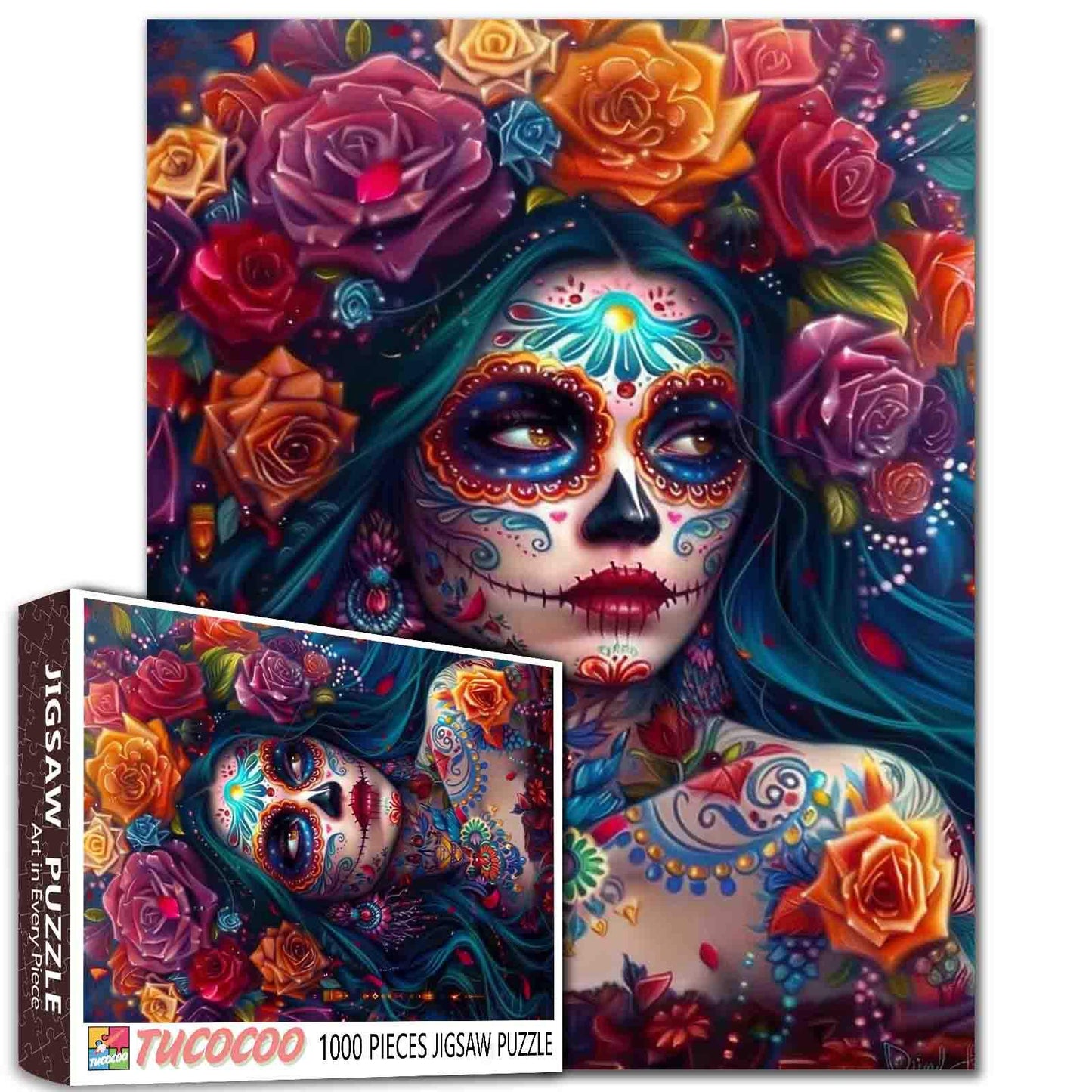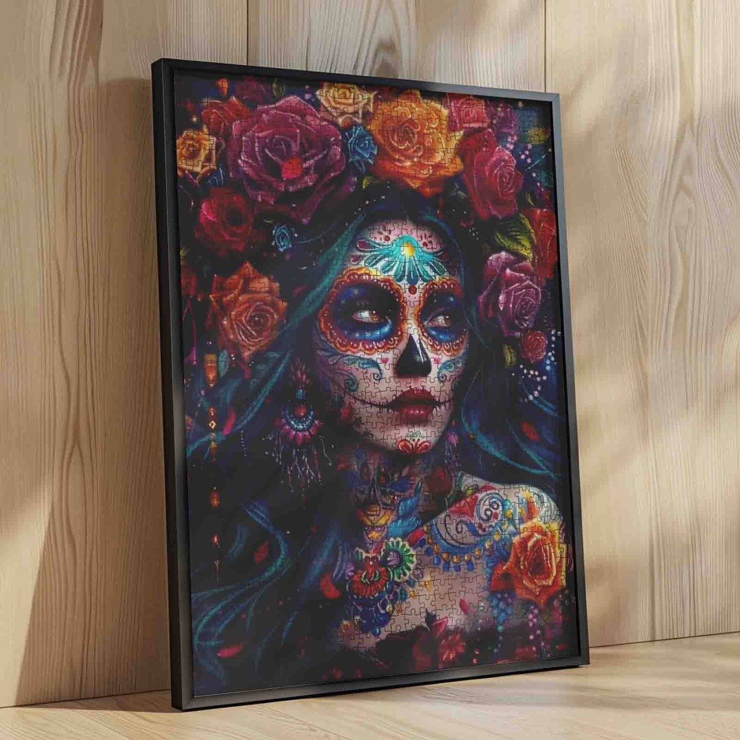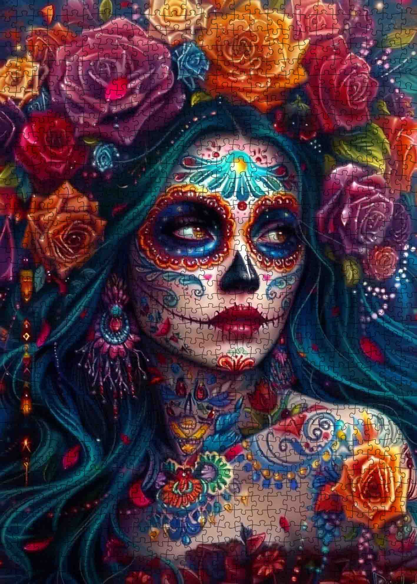 A hauntingly beautiful woman with sugar skull makeup gazes into the distance, her face covered in vibrant patterns and shimmering gems. Surrounding her are blooming roses in crimson, gold, and violet, woven through her dark flowing hair like a crown of celebration and remembrance. Inspired by Día de los Muertos, this puzzle honors life and memory with bold, dramatic color and intricate details that invite you to pause and appreciate every piece.