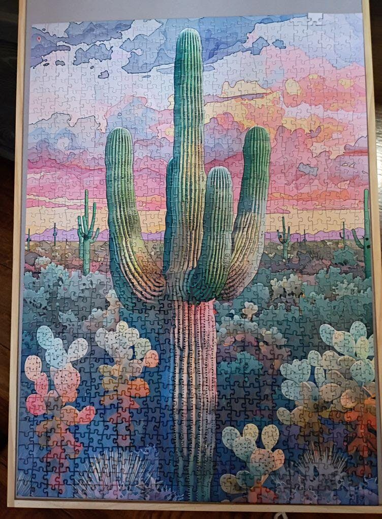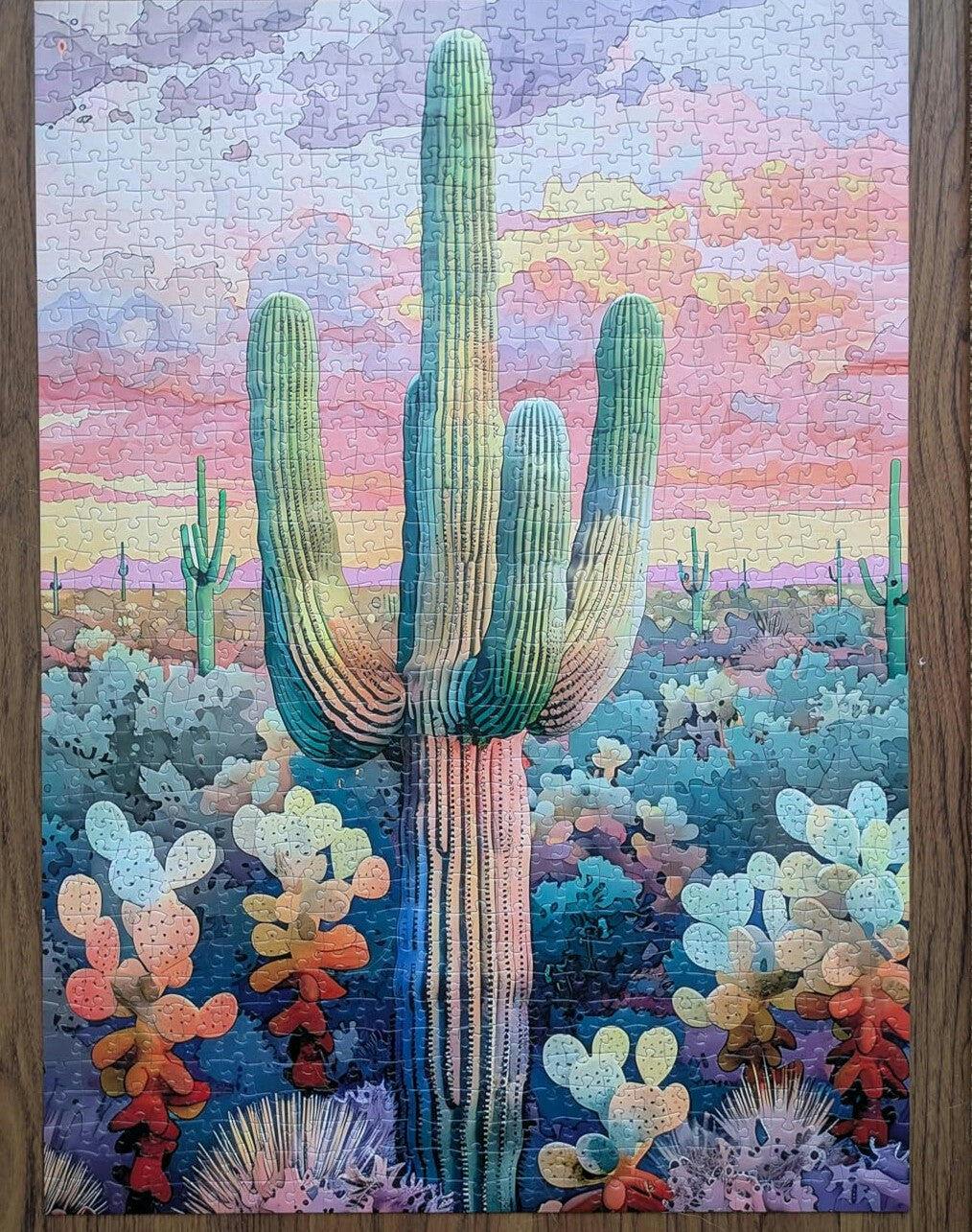 A towering saguaro cactus rises proudly under a dreamy southwestern sky, surrounded by desert blooms and warm evening light. Shades of violet, peach, and coral brush the horizon, setting the stage for a quiet yet powerful desert moment. Prickly companions dot the foreground while the sky whispers the last words of the day. It's more than just a puzzle—it's a stroll through the soul of the Sonoran Desert, one piece at a time.