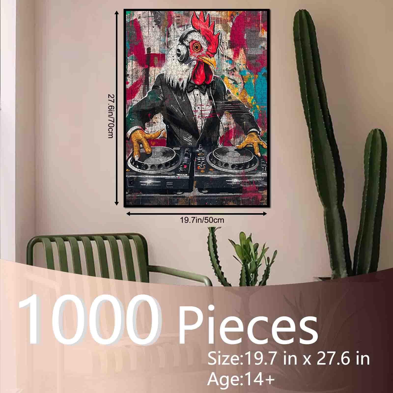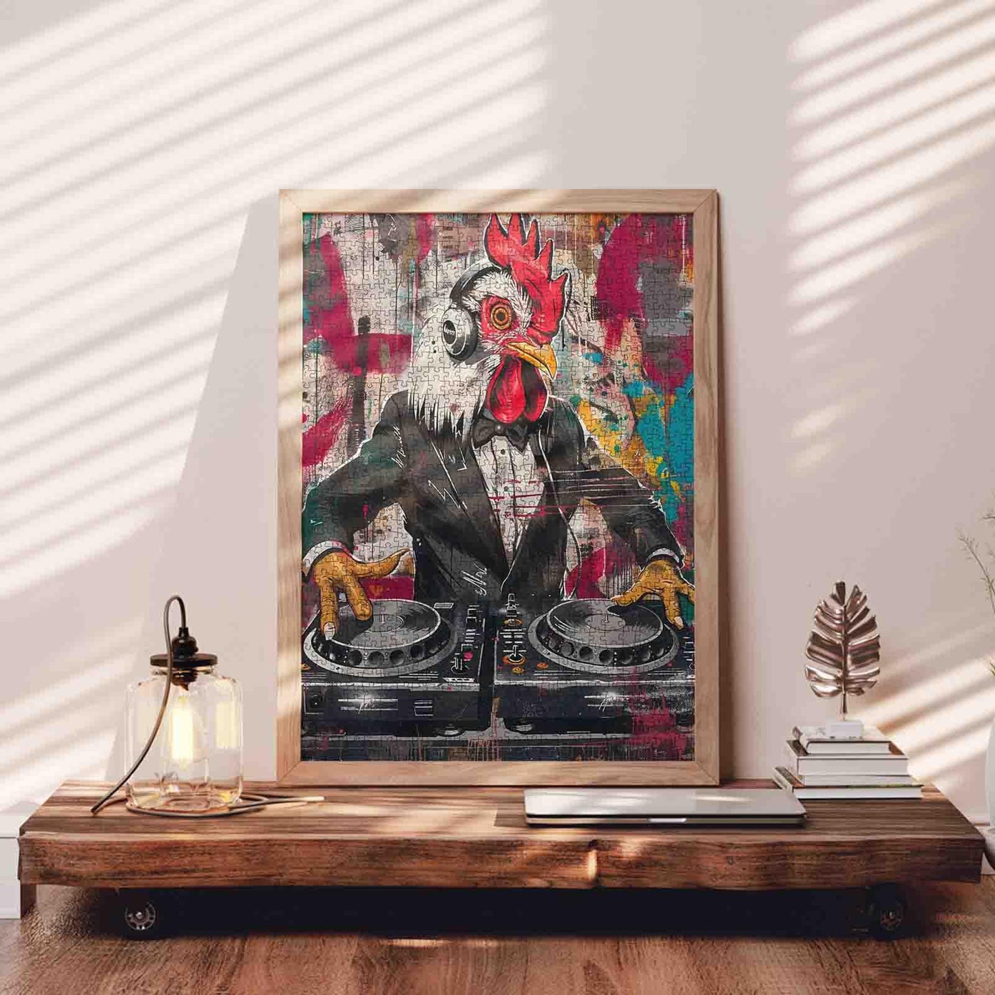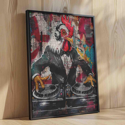 In a world where feathers meet funk, a rooster dons a tuxedo and headset, taking command of the DJ booth with fiery flair. Splashes of graffiti explode behind him, matching the rhythm in his eyes. His talons spin the decks like a seasoned master, transforming the alleyway into an electrifying street party. Every piece captures the cluck of confidence and beats of boldness.