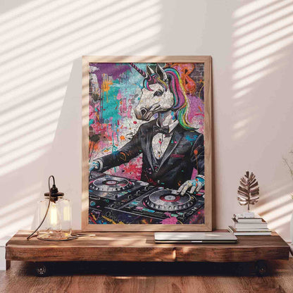 Amidst a riot of neon sprays and urban street tags, a unicorn in a tuxedo takes center stage behind the DJ deck. With rainbow mane glowing under the graffiti lights, it drops beats as wild as its style. The mix of fantasy and street art gives this scene a surreal, energetic pulse. Every puzzle piece draws you deeper into this fantastical rave moment frozen in ink and color.