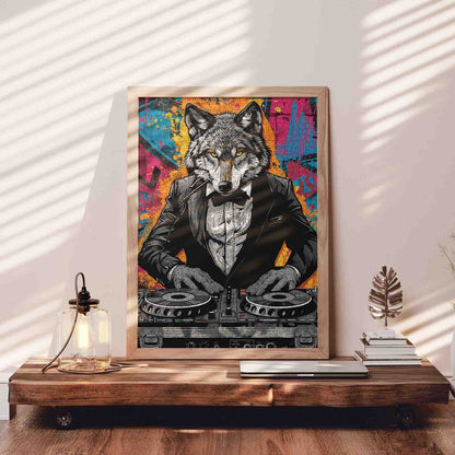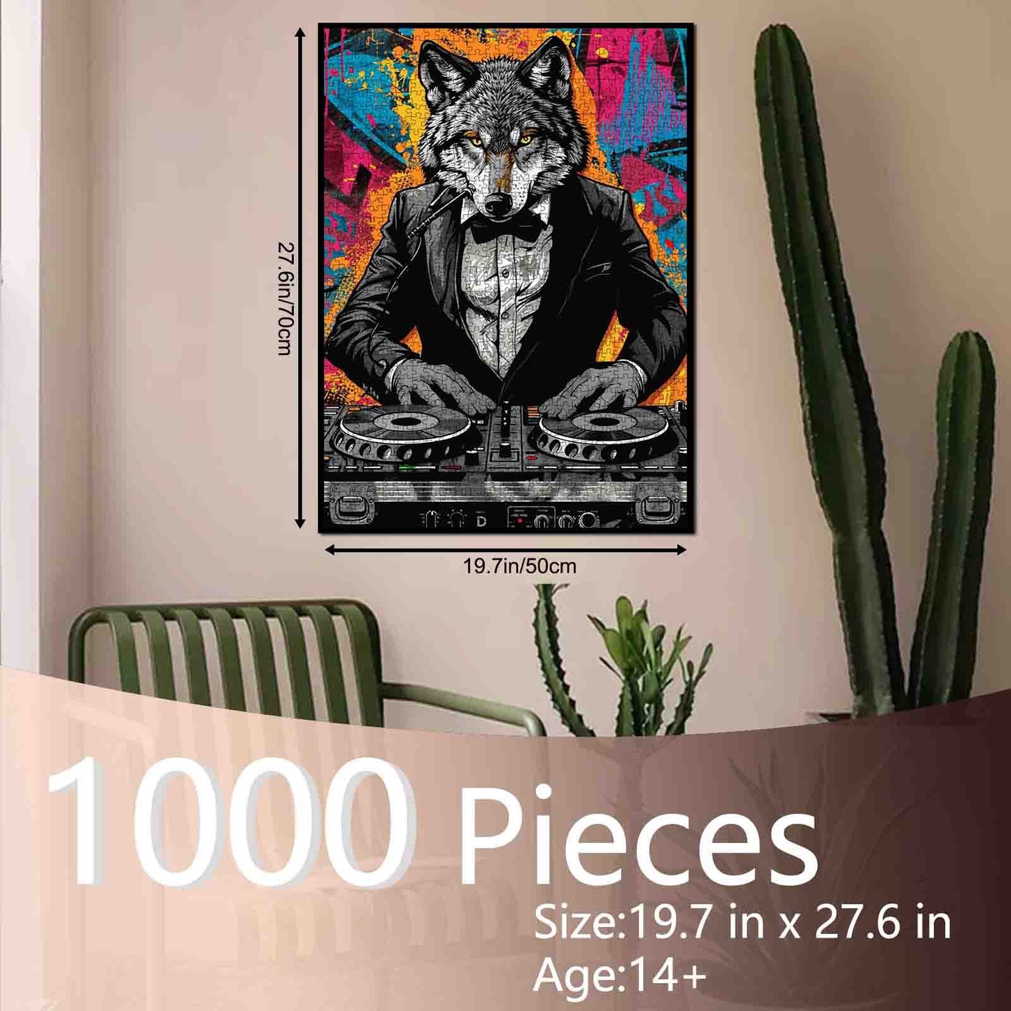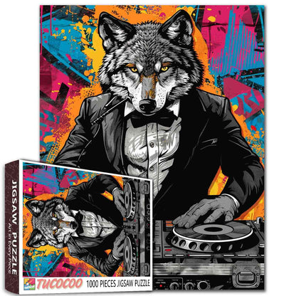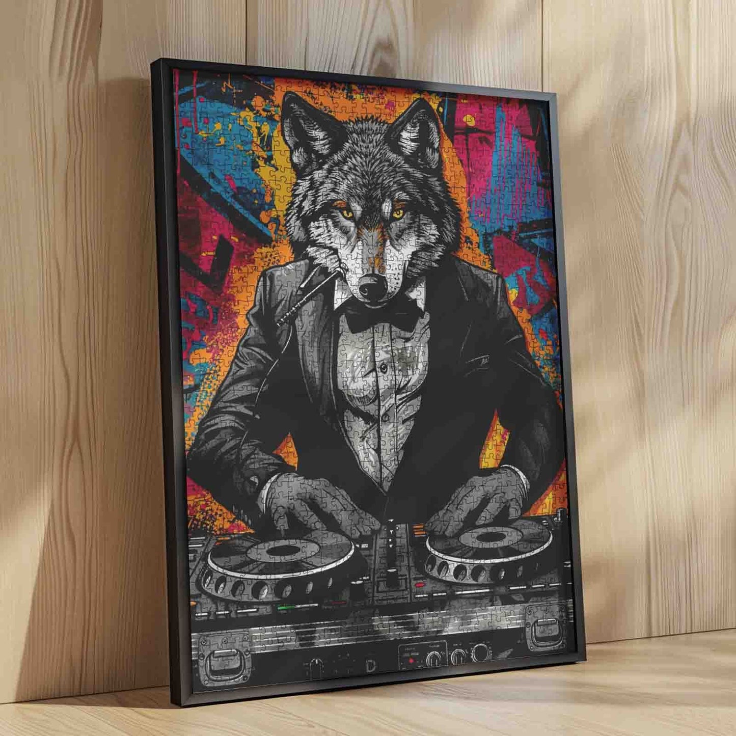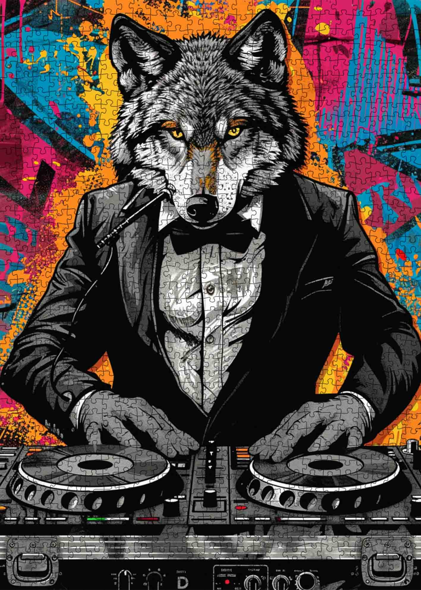 Amid bursts of orange and neon pink, a wolf in a tuxedo locks eyes with the crowd, microphone in place and paws poised over the turntables. The mix of wild instincts and street flair turns this scene into a visual rhythm. His silver fur contrasts with the vivid graffiti behind him, while every element—from his calm authority to the urban chaos—feels perfectly timed. It's more than a puzzle; it's a story of cool control in the middle of a roaring street rave.