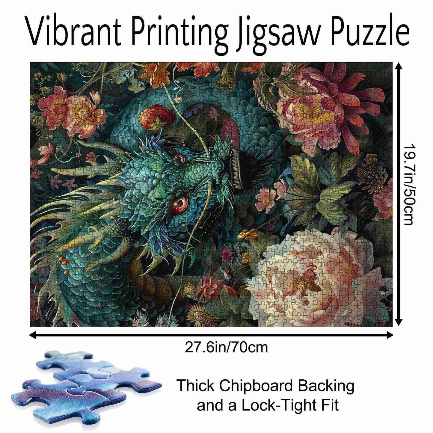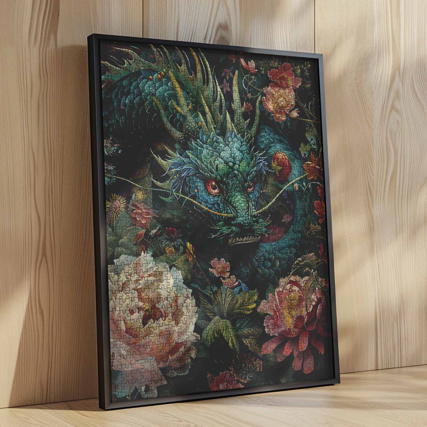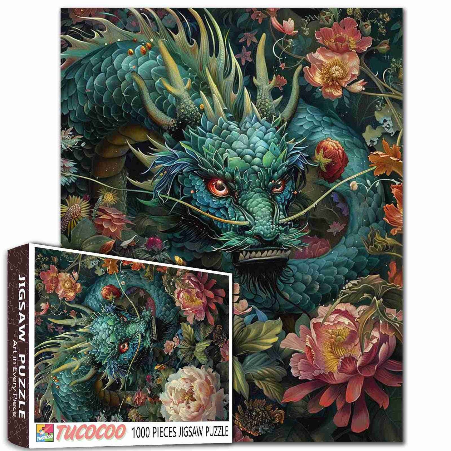 A majestic dragon coils through lush blooms, its piercing eyes watching as it guards the vibrant flora surrounding it. The deep greens of its scales contrast beautifully with the soft petals of the flowers, creating a scene filled with mystery and beauty. This intricate puzzle brings the mythical world to life, offering a relaxing challenge for puzzle lovers.