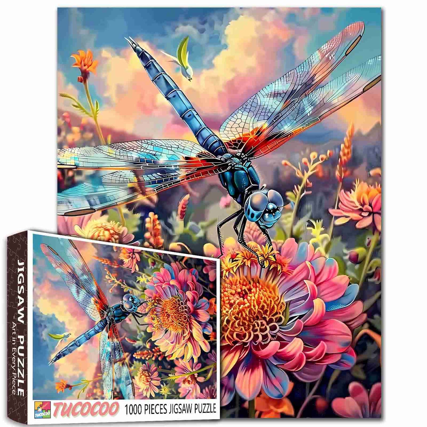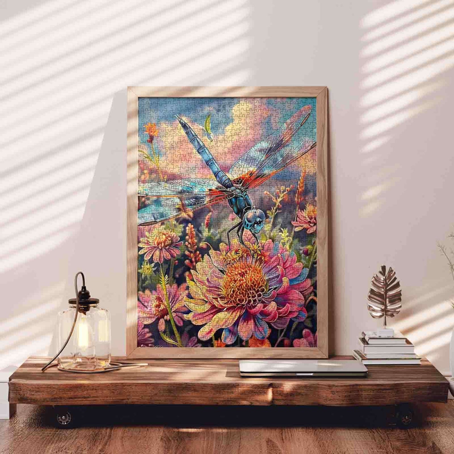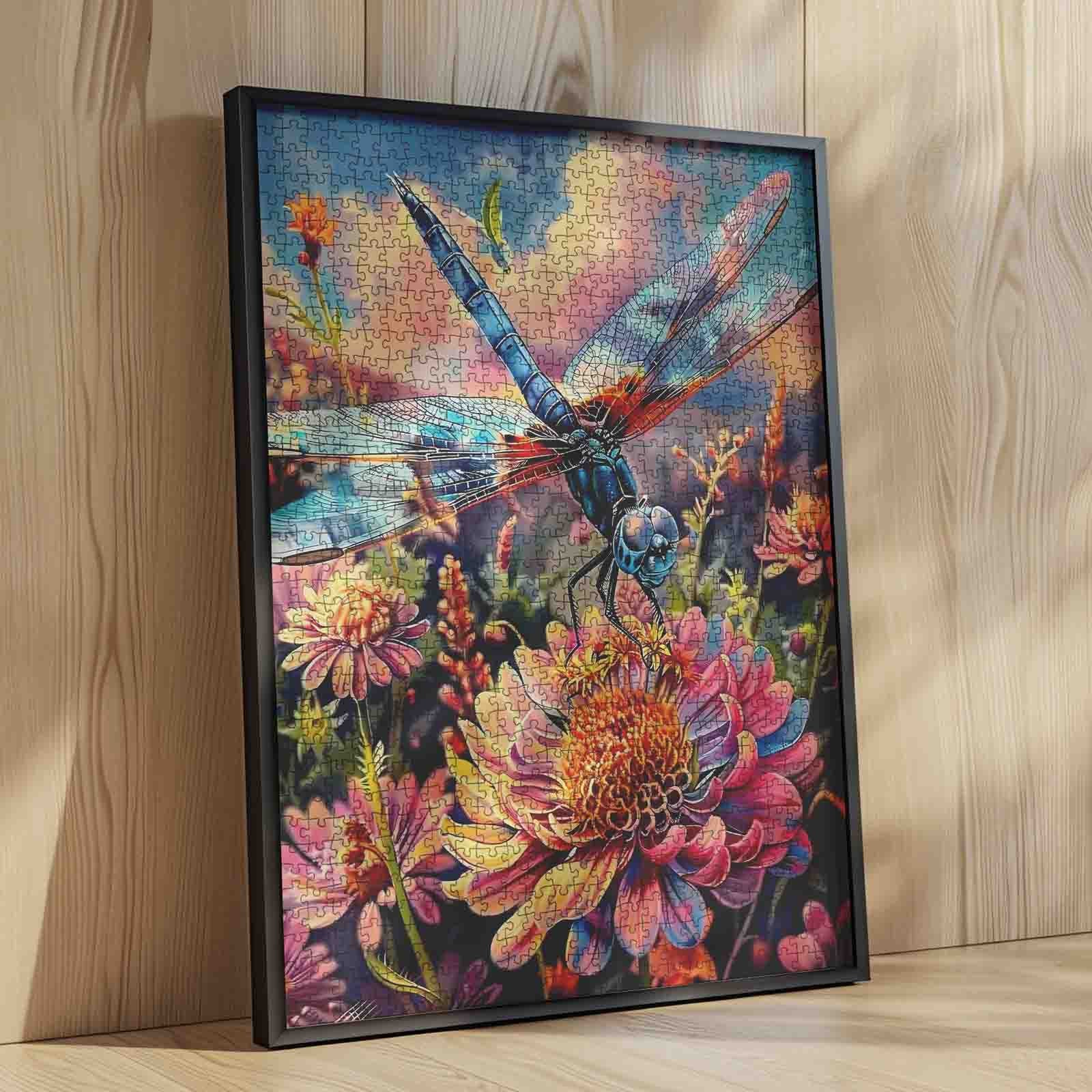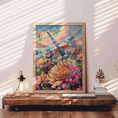 A radiant blue dragonfly hovers gracefully over a garden bursting with wildflowers in full bloom. Its delicate wings catch the golden sunlight, revealing a shimmering network of veins as it gently perches on a richly layered blossom. Around it, soft pinks, vibrant oranges, and lush greens create a dreamy meadow scene filled with warmth and vitality. The puzzle captures a fleeting moment in nature—the stillness before the dragonfly takes flight again. Every piece you place brings to life the intricate balance between insect and flower, sky and earth, stillness and motion.