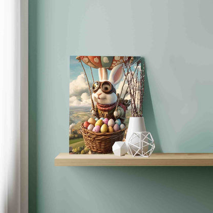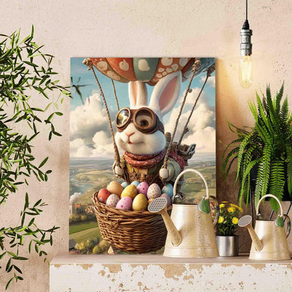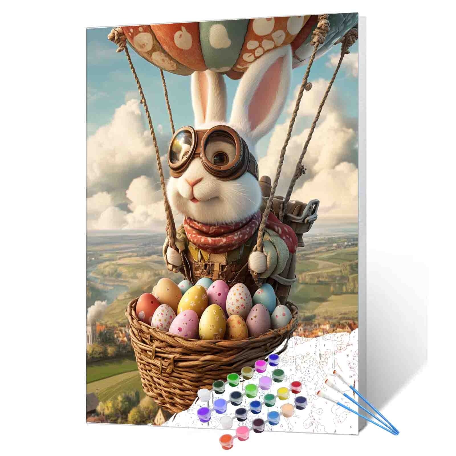 High above the countryside, a brave little bunny floats gently in a hot air balloon basket brimming with colorful Easter eggs. Wearing classic aviator goggles and a red scarf fluttering in the breeze, he seems to be on a joyful mission to deliver springtime cheer. With soft clouds behind him and a quaint village far below, this heartwarming scene captures a spirit of adventure, innocence, and seasonal delight—all ready to be brought to life with your brush.