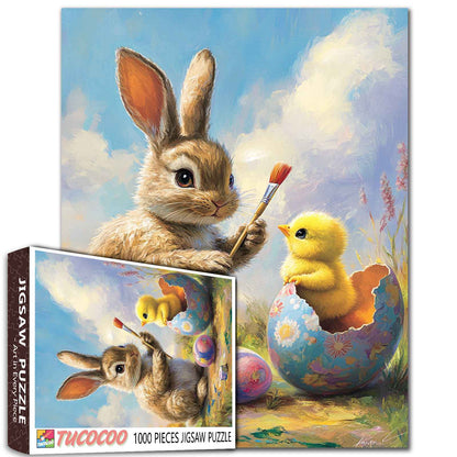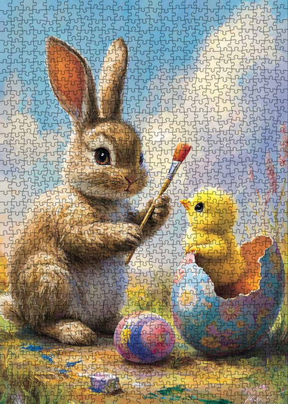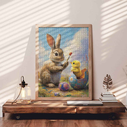 In this adorable scene, a fluffy Easter bunny gently holds a brush, painting colorful Easter eggs alongside a freshly hatched baby chick. The playful moment captures the joy of spring as the little chick eagerly watches the bunny's artistic touch. It's a perfect puzzle for families to enjoy together, bringing the Easter spirit to life.