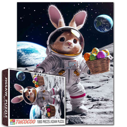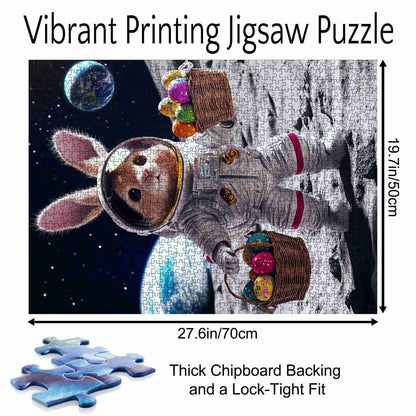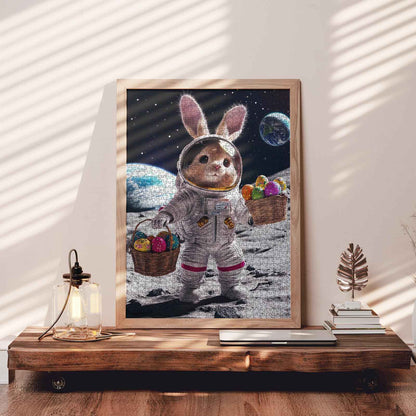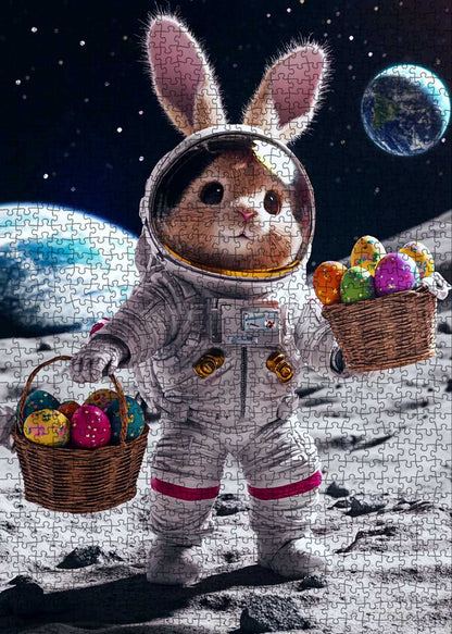 Hop into the Easter spirit with a twist of space adventure! This jigsaw puzzle features an adorable bunny astronaut holding baskets full of colorful Easter eggs while standing on the moon. With Earth shining in the background, the bunny’s space suit adds a unique touch to this cheerful Easter scene. This puzzle is the perfect combination of fun, creativity, and holiday spirit!