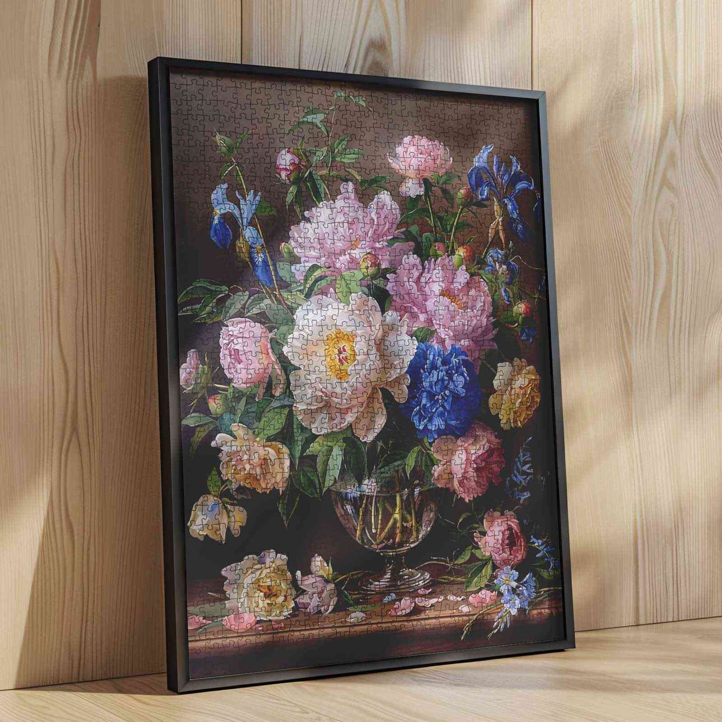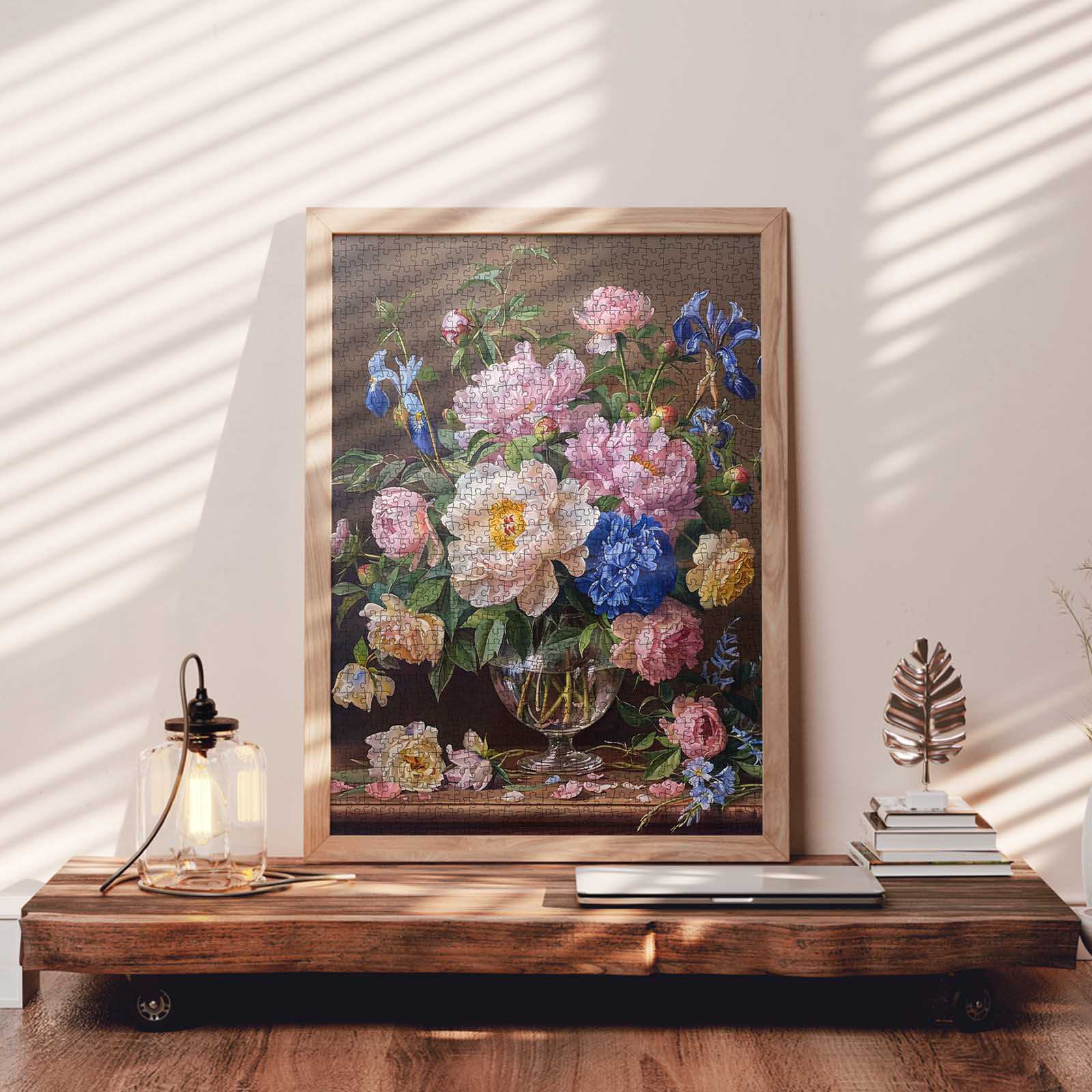 A crystal vase overflows with lush peonies in shades of blush, ivory, and blue, accented by delicate irises and soft greenery. Each petal catches the gentle light, creating a timeless still life full of elegance and natural beauty. Scattered petals rest on the wooden table, adding to the charm and realism of the scene. Piece by piece, experience the art of classic floral arrangements and the peaceful atmosphere they bring to any space. Perfect for flower lovers and fans of traditional art.