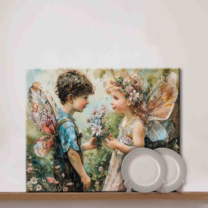 In a magical garden bursting with wildflowers, two little fairies share a tender moment. The boy holds out a fresh bouquet while the girl, adorned with a crown of blooms, beams with joy. Their delicate wings shimmer in the soft light, capturing a gentle scene of innocence and affection. This artwork invites you into a fairy-tale world full of charm and heartfelt beauty.