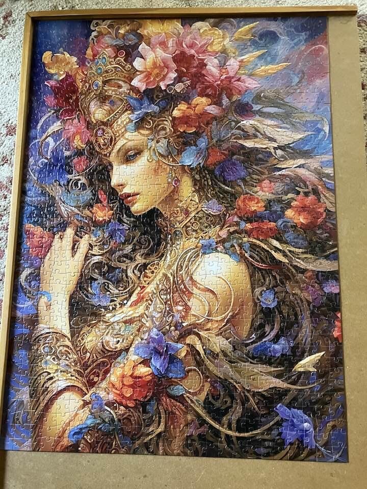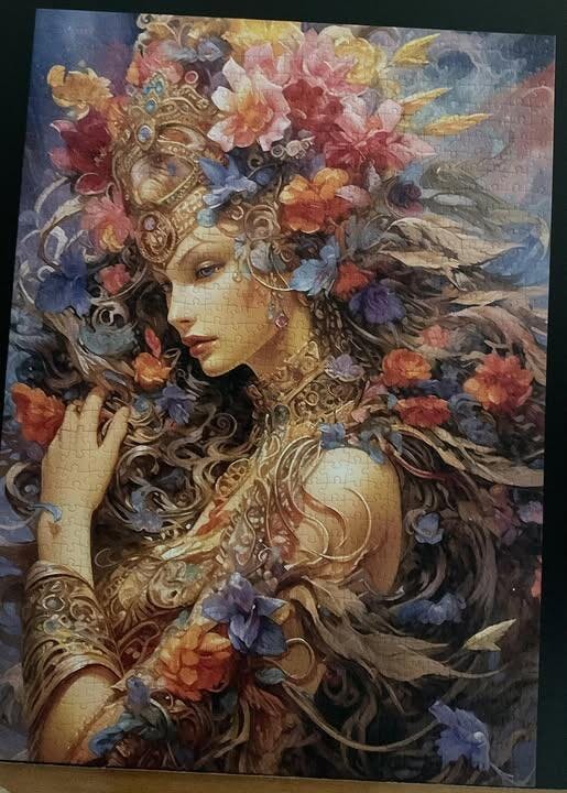 Step into a world of elegance and wonder with this Fairy Queen jigsaw puzzle. The artwork showcases a majestic queen surrounded by an explosion of vibrant flowers in shades of orange, pink, and blue, seamlessly intertwined with her flowing golden hair. Her crown, adorned with sparkling jewels, adds a regal touch, while her intricately detailed dress glimmers with gold embellishments. The soft blending of colors and textures brings the scene to life, creating an image that feels almost magical. Every piece reveals a new detail, making the assembly process as mesmerizing as the final image itself.