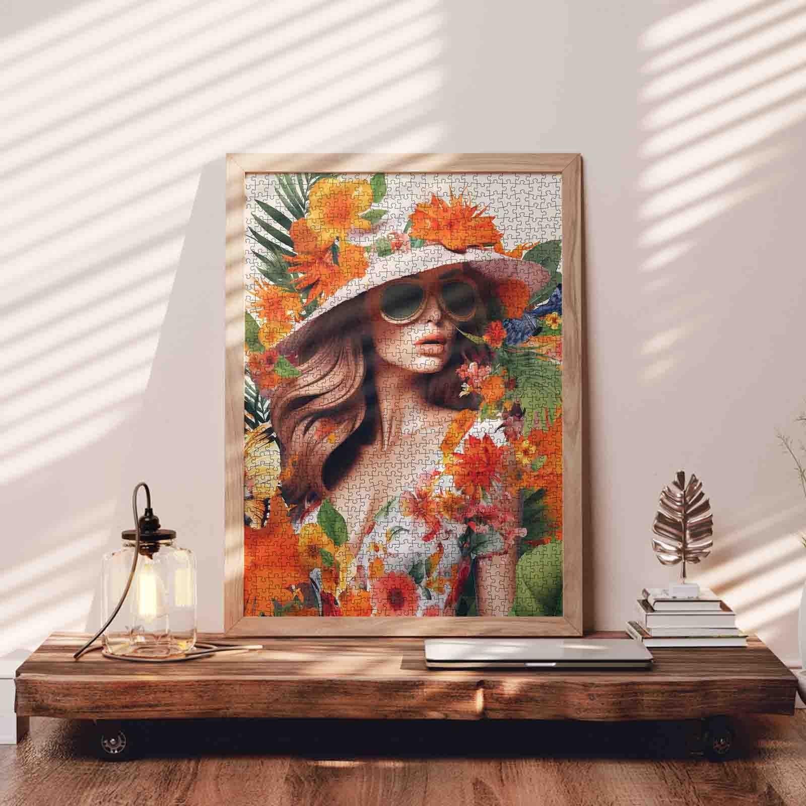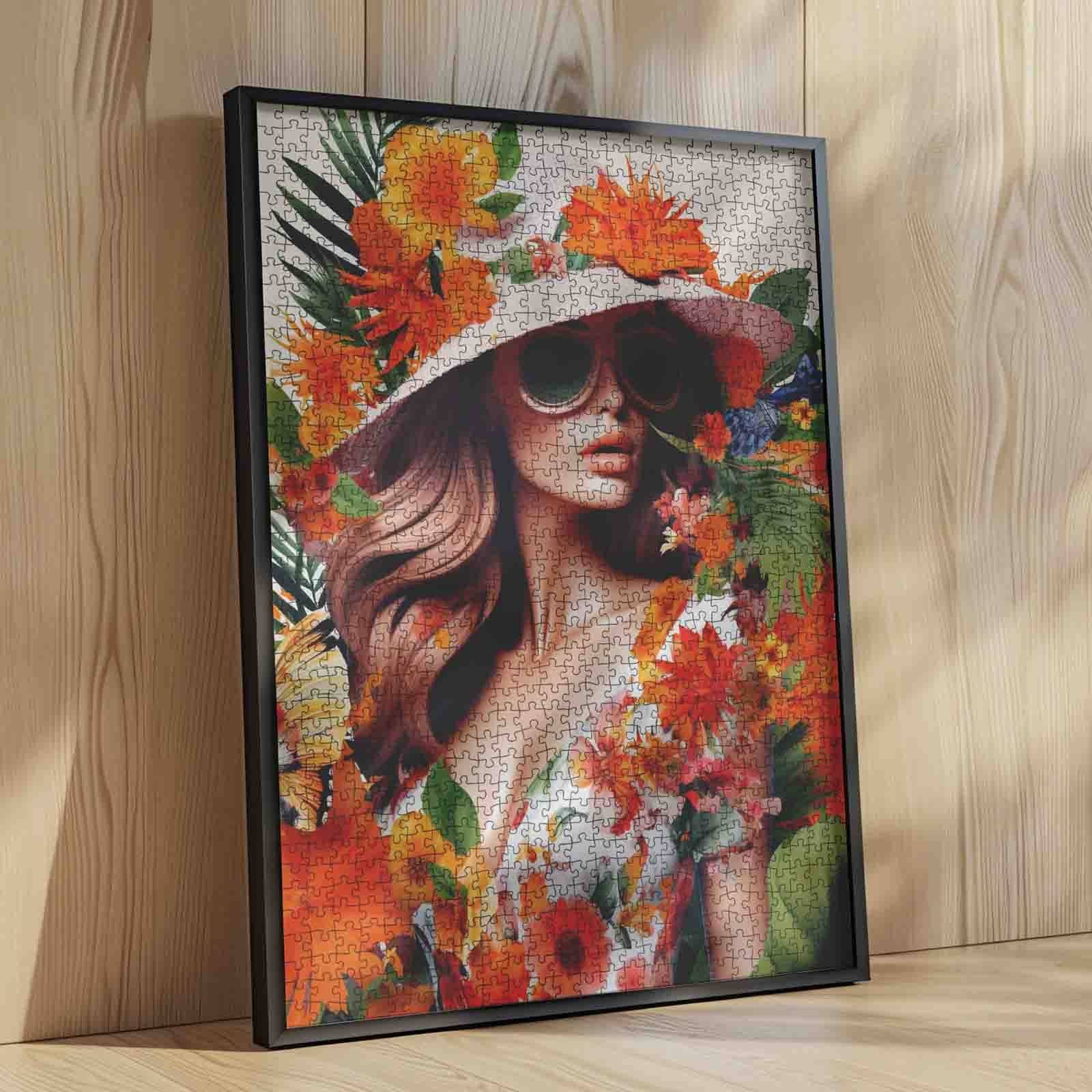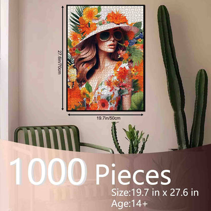 A stylish woman in a sunhat and sunglasses stands gracefully amidst a bloom of tropical flowers and fluttering butterflies. Her floral dress blends seamlessly with the vibrant jungle around her, creating a dreamlike scene that captures both fashion and nature in perfect harmony. The warm tones of orange, yellow, and green give the image a lush, summery atmosphere—like stepping into a fashion editorial set in paradise. A truly immersive puzzle that’s as elegant as it is relaxing to complete.