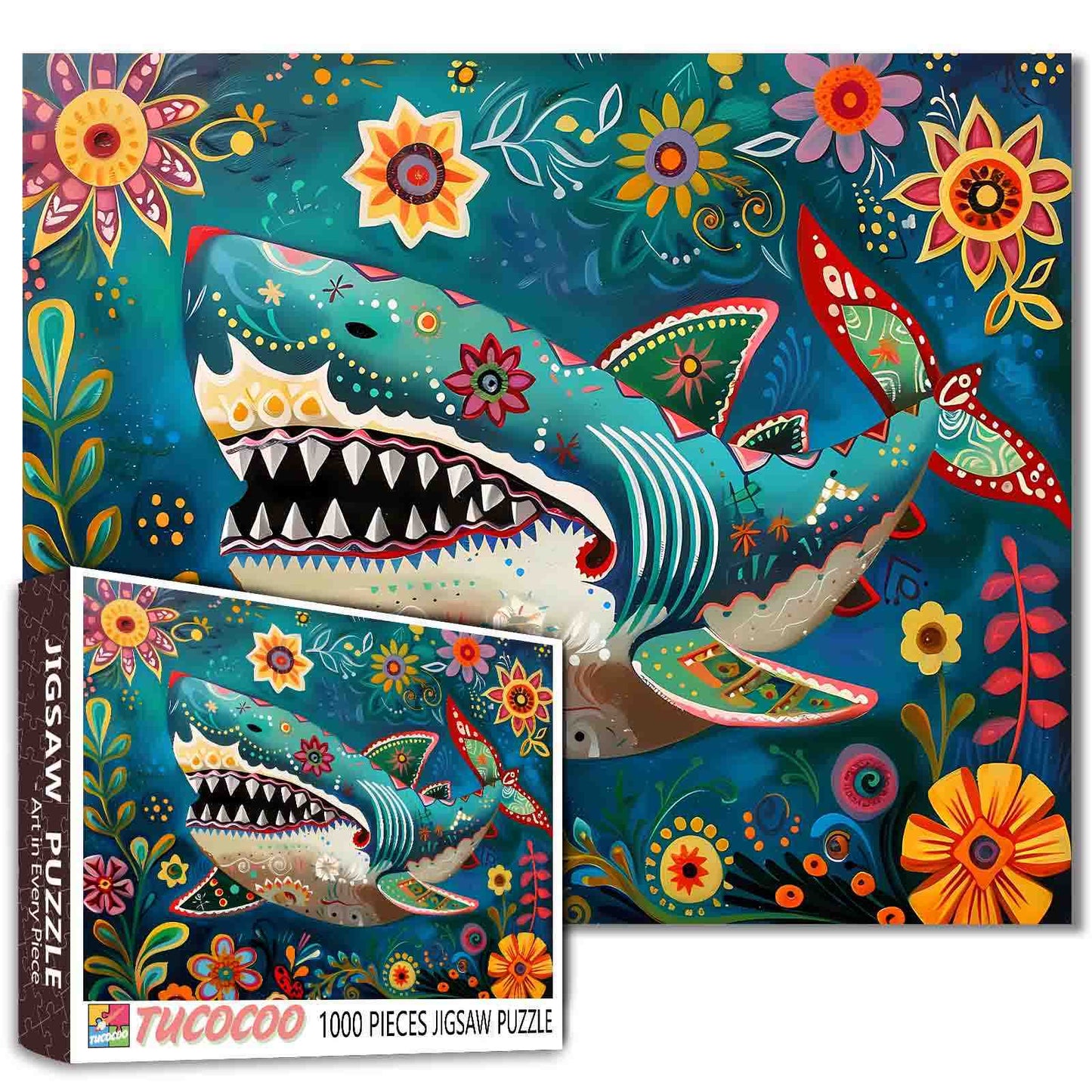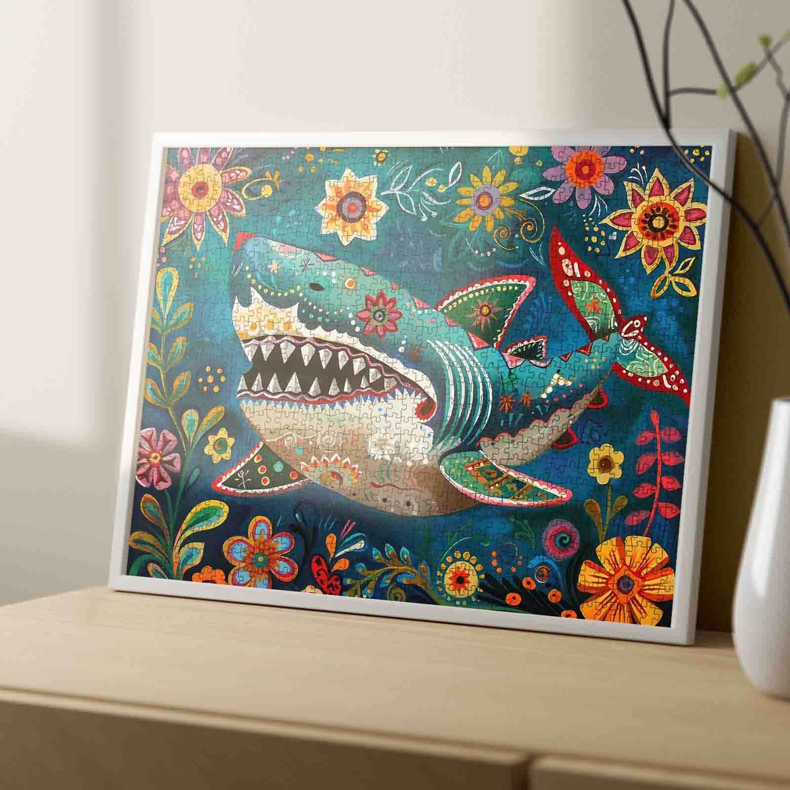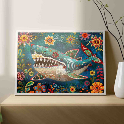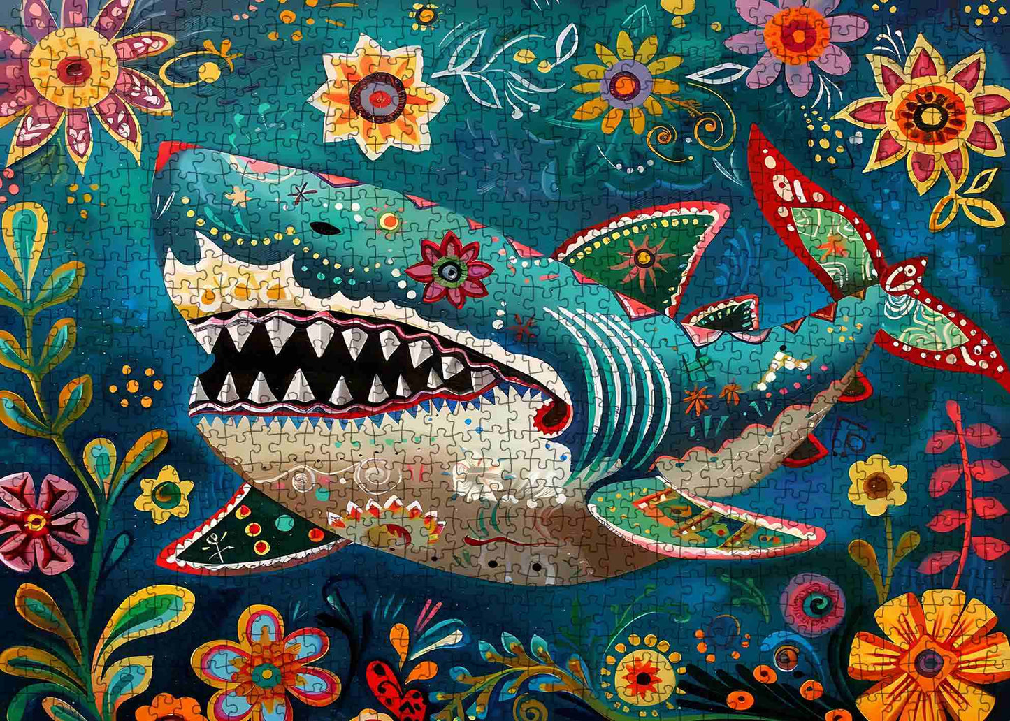 Beneath the colorful surface of the sea swims a fierce yet festive shark, adorned with whimsical patterns and surrounded by bright floral bursts. With its sharp teeth and bold expression, this creature brings a vibrant mix of danger and decoration to your puzzling experience. Playful details on its fins, face, and tail invite closer observation, while the swirling plants and blooming flowers add a layer of joy. Dive into this unusual ocean world where the wild meets the artistic.