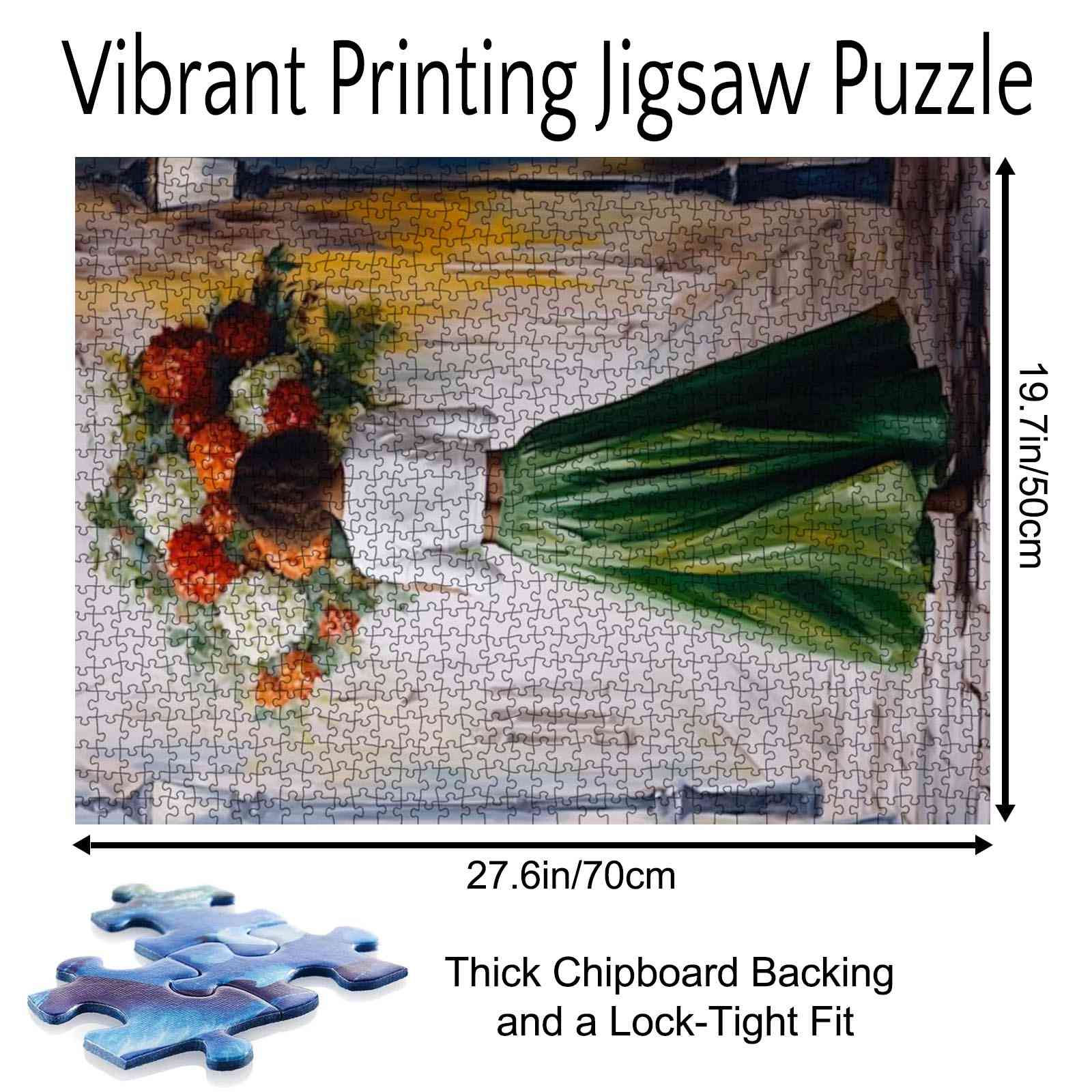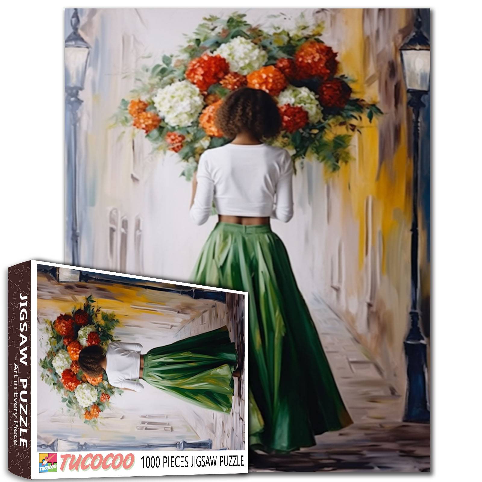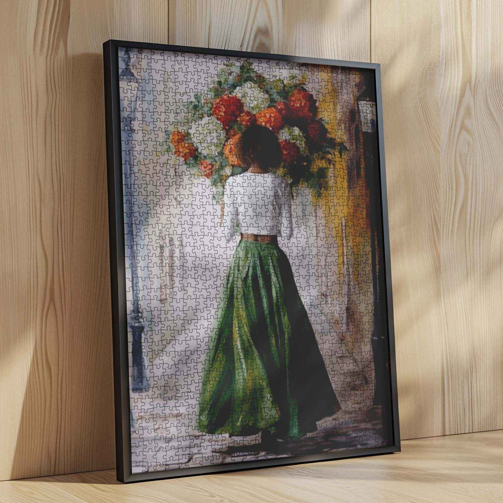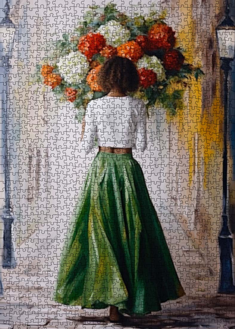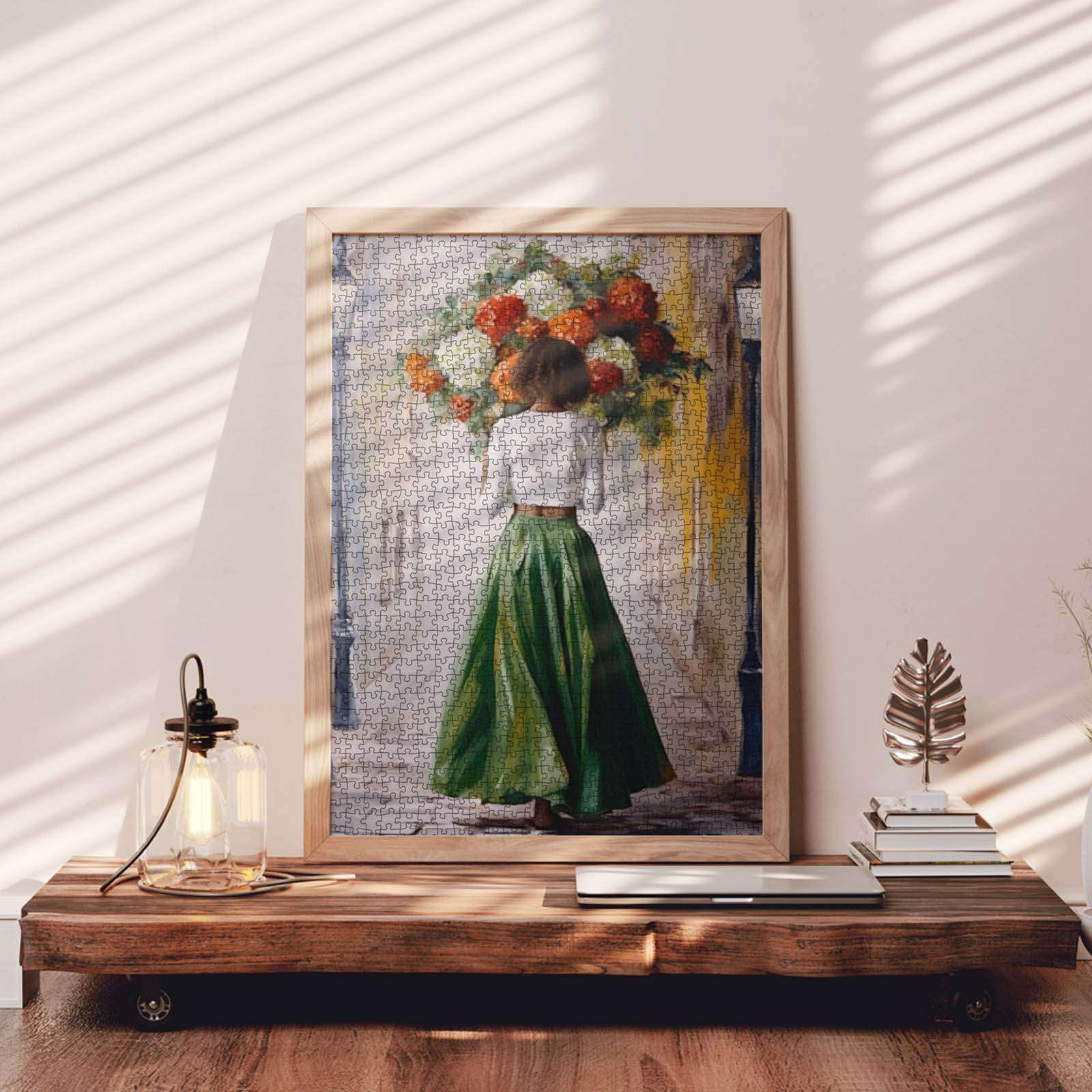 Immerse yourself in the beauty of nature with this stunning jigsaw puzzle, showcasing a woman gracefully walking with a large bouquet of vibrant flowers. The warm shades of orange and white flowers contrast beautifully with her soft green skirt, creating an image full of serenity and charm. This puzzle is perfect for anyone looking to unwind and enjoy the calmness of floral elegance. It offers both a challenge and a soothing experience, making it an ideal addition to your puzzle collection.