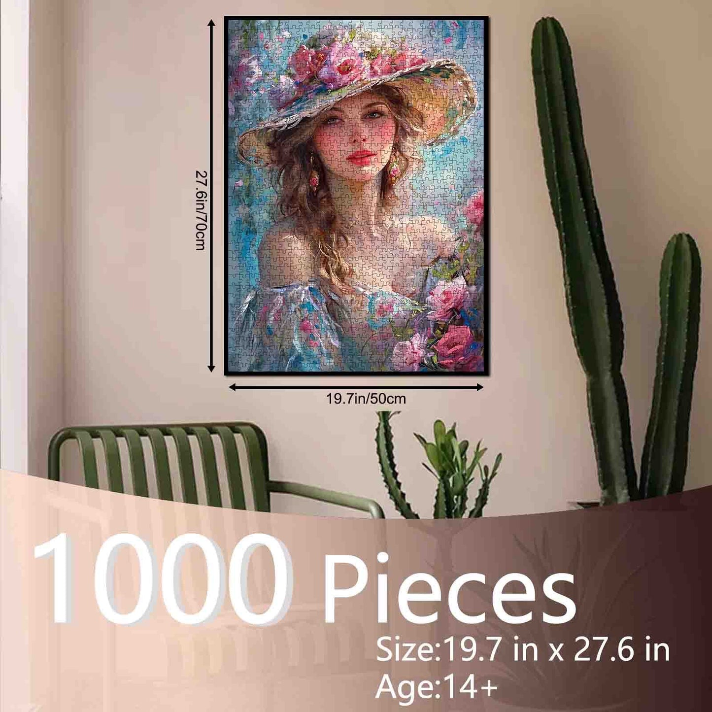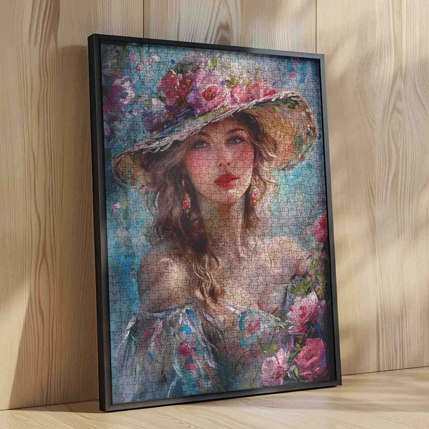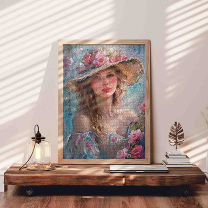 Beneath a wide-brimmed hat woven with roses and pastel petals, a young woman stands in quiet grace. Her gaze, soft yet confident, meets the light with a serene glow. Dangling rose earrings catch the breeze as delicate curls fall over her shoulders. Surrounding her are hints of spring in full bloom—every detail painted with a dreamy brushstroke. The puzzle captures a moment suspended between nature and timeless beauty, inviting you to assemble elegance piece by piece.