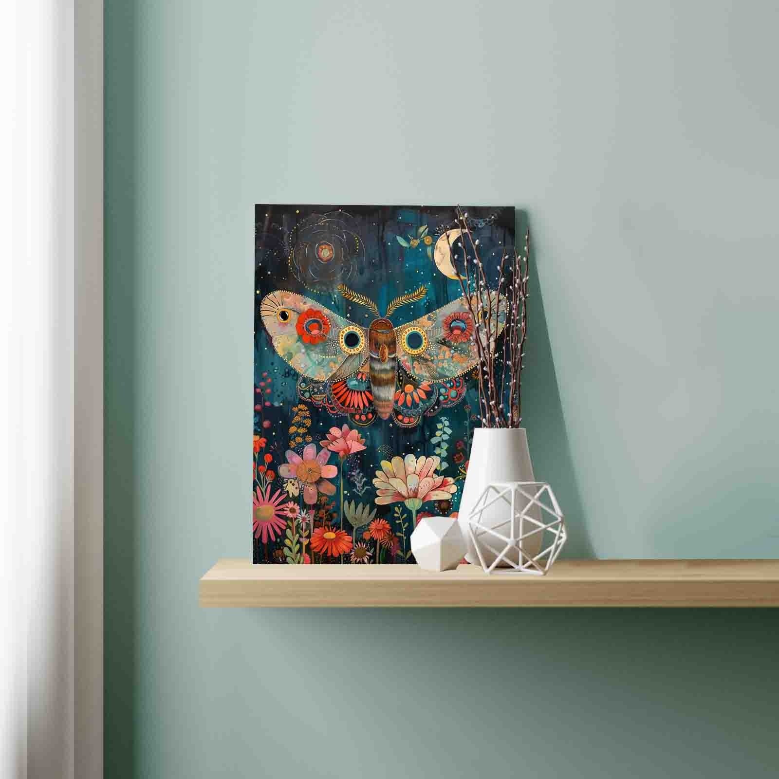 Under the crescent moon and glowing stars, a majestic moth spreads its ornate wings above a field of wildflowers. Its wings are adorned with embroidered-like patterns and floral motifs that shimmer in the night sky. Below, blossoms in pinks, reds, and creams rise to greet it, turning the scene into a whimsical nighttime dance. Let your brush reveal the beauty hidden in this magical garden moment.