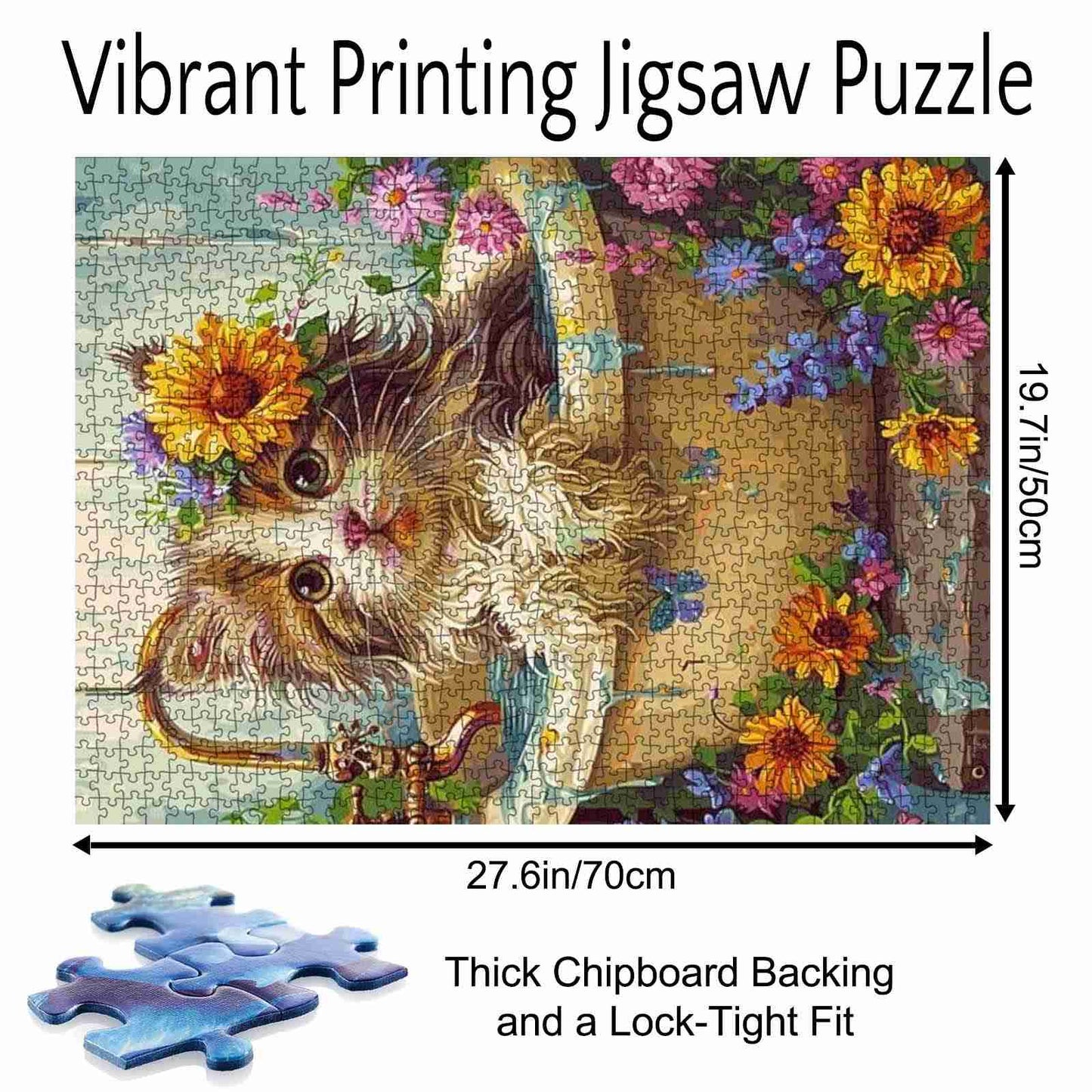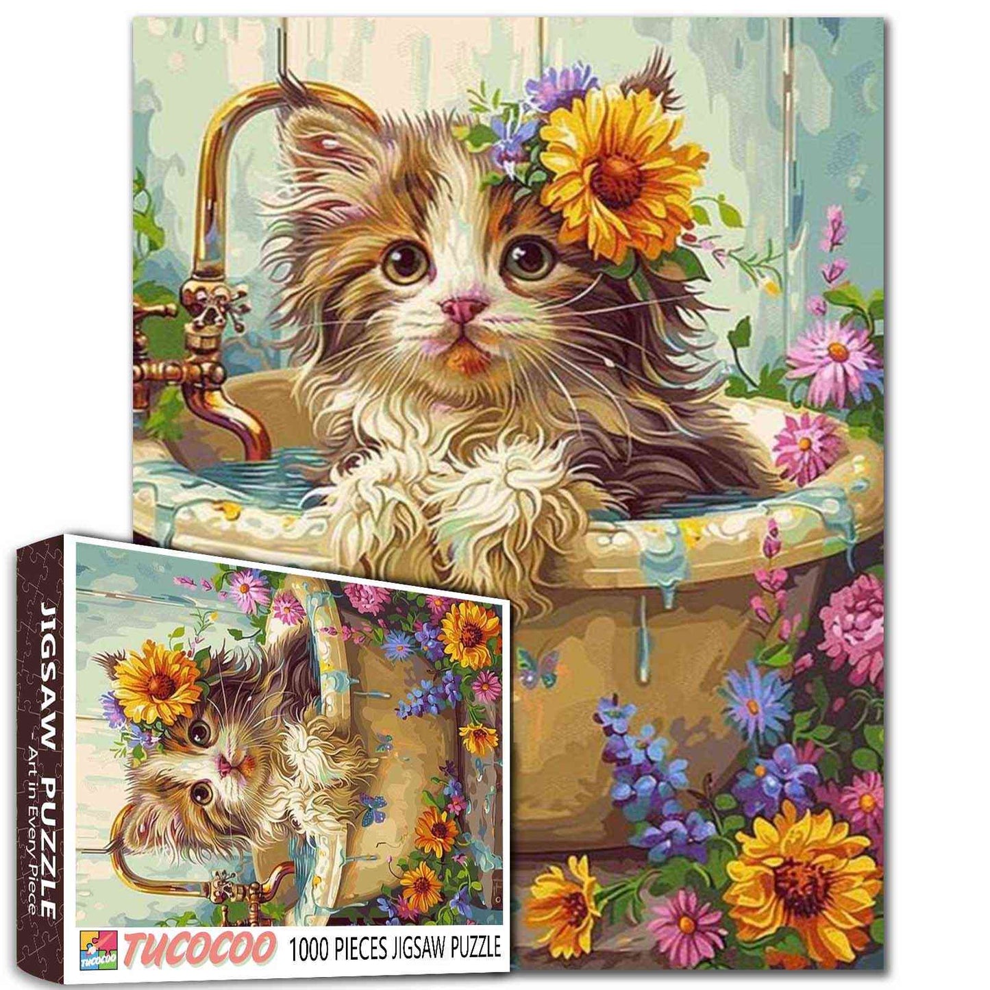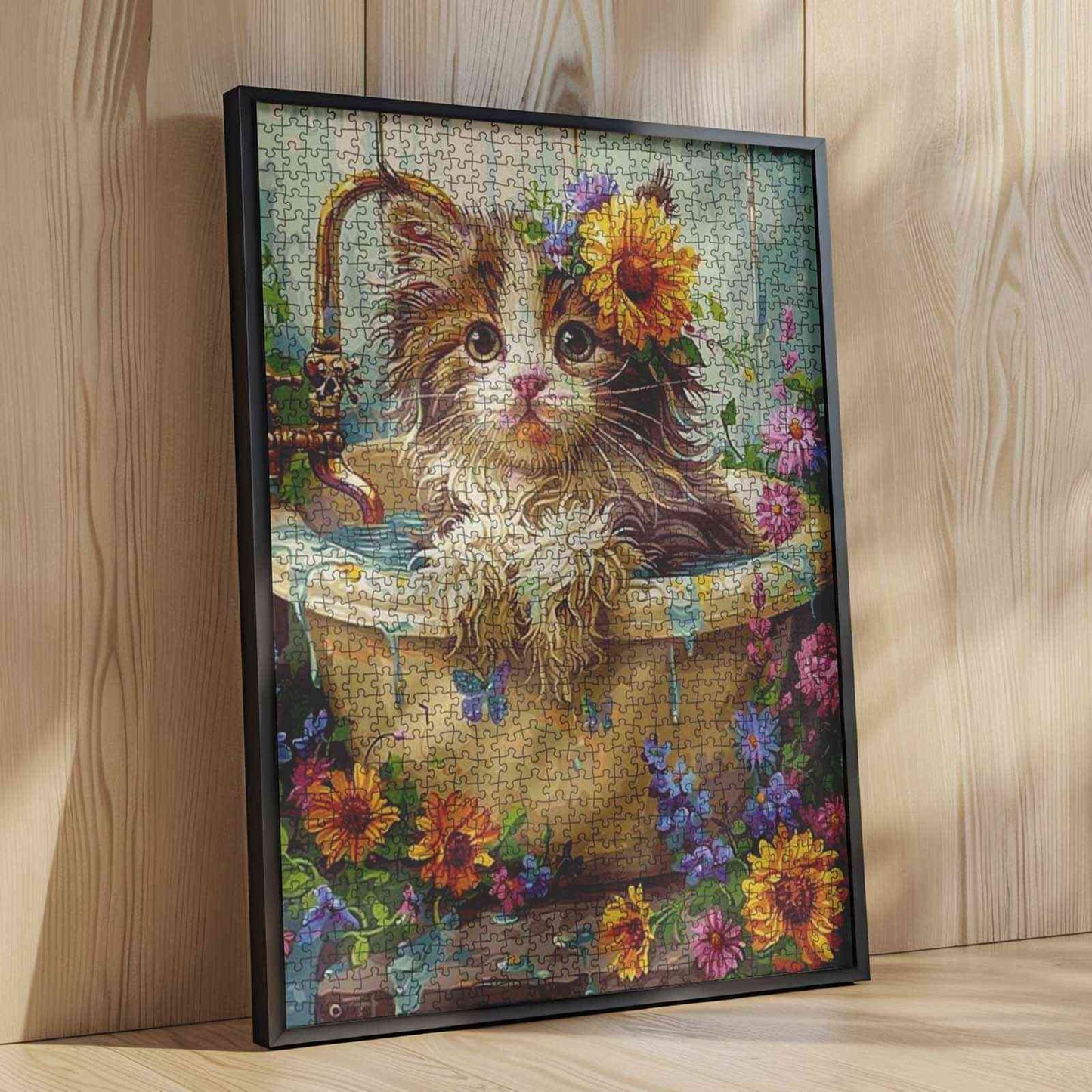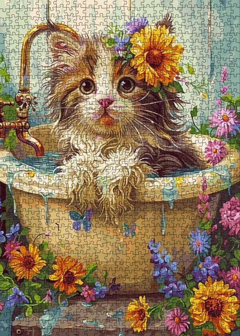 This adorable kitten enjoys a peaceful moment in a flower-filled bath. The cat, with a sunflower in its hair, gazes up with big, curious eyes. Surrounded by vibrant blossoms and dripping water from a vintage tap, this scene is full of charm and tranquility. The soft colors and whimsical design make this puzzle a delightful experience, perfect for animal lovers and fans of floral art.