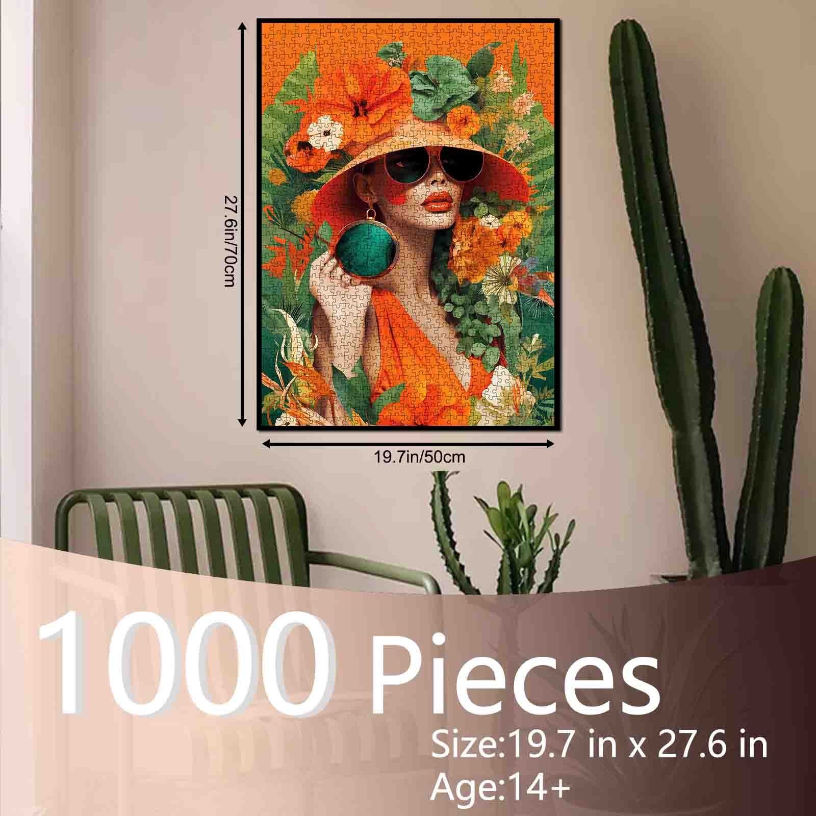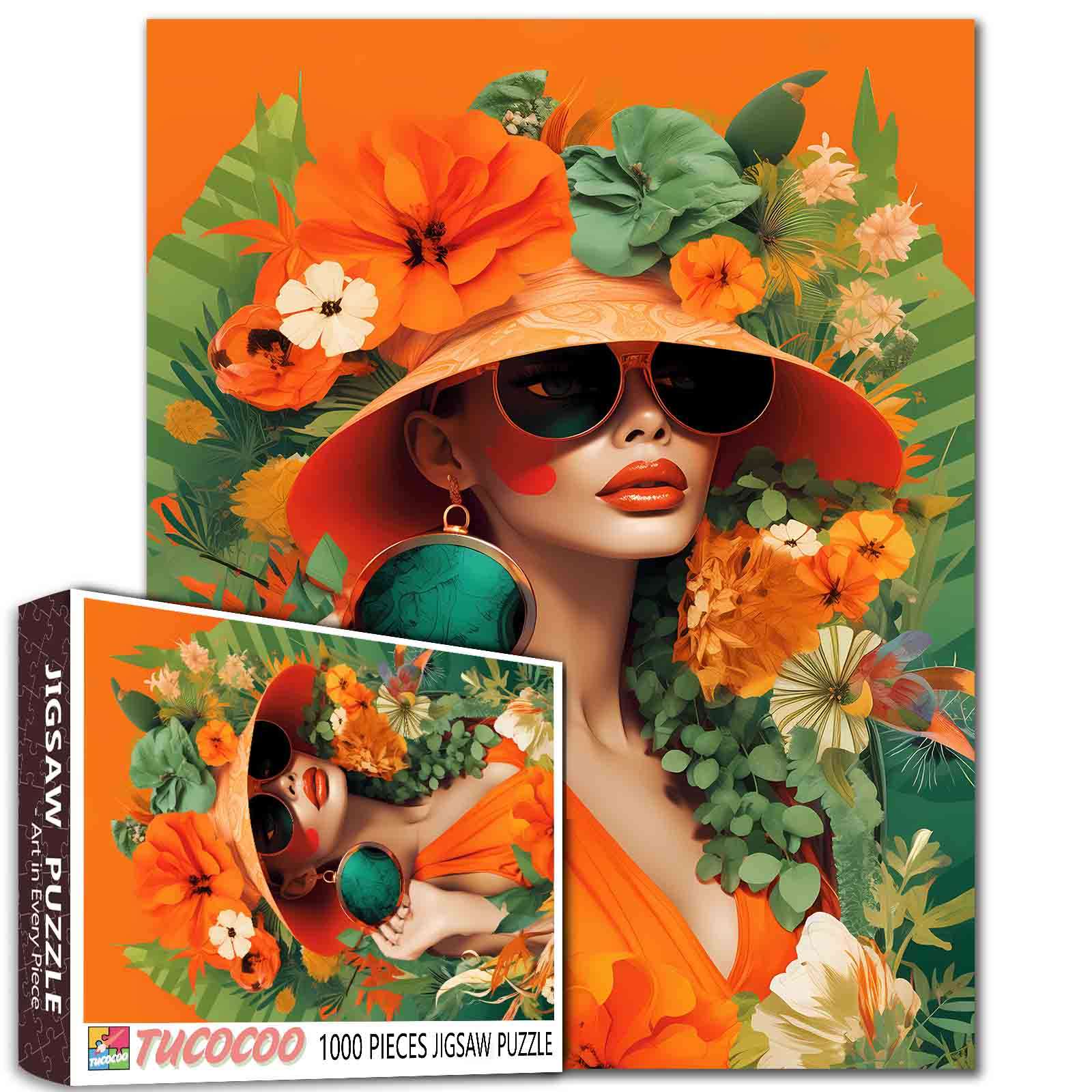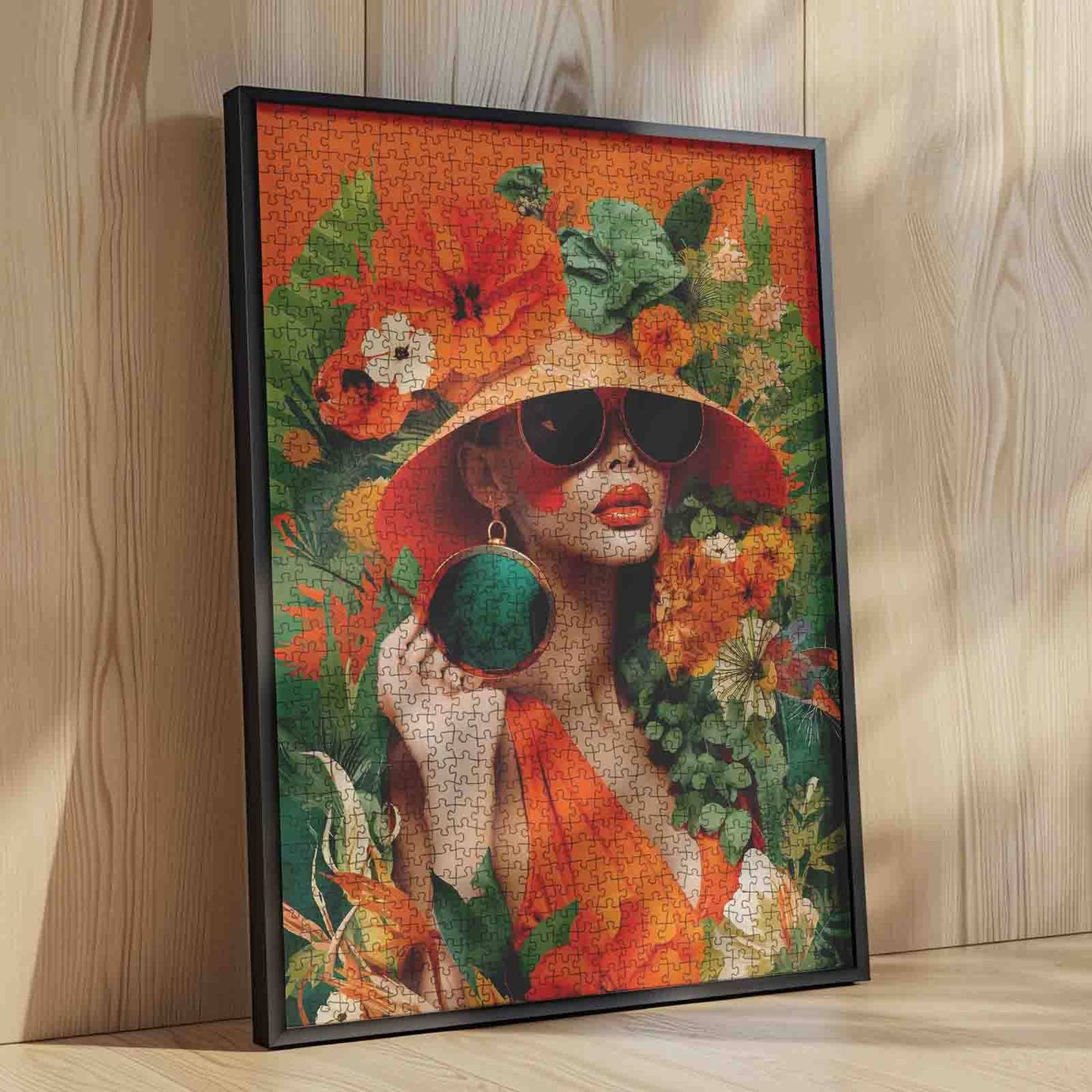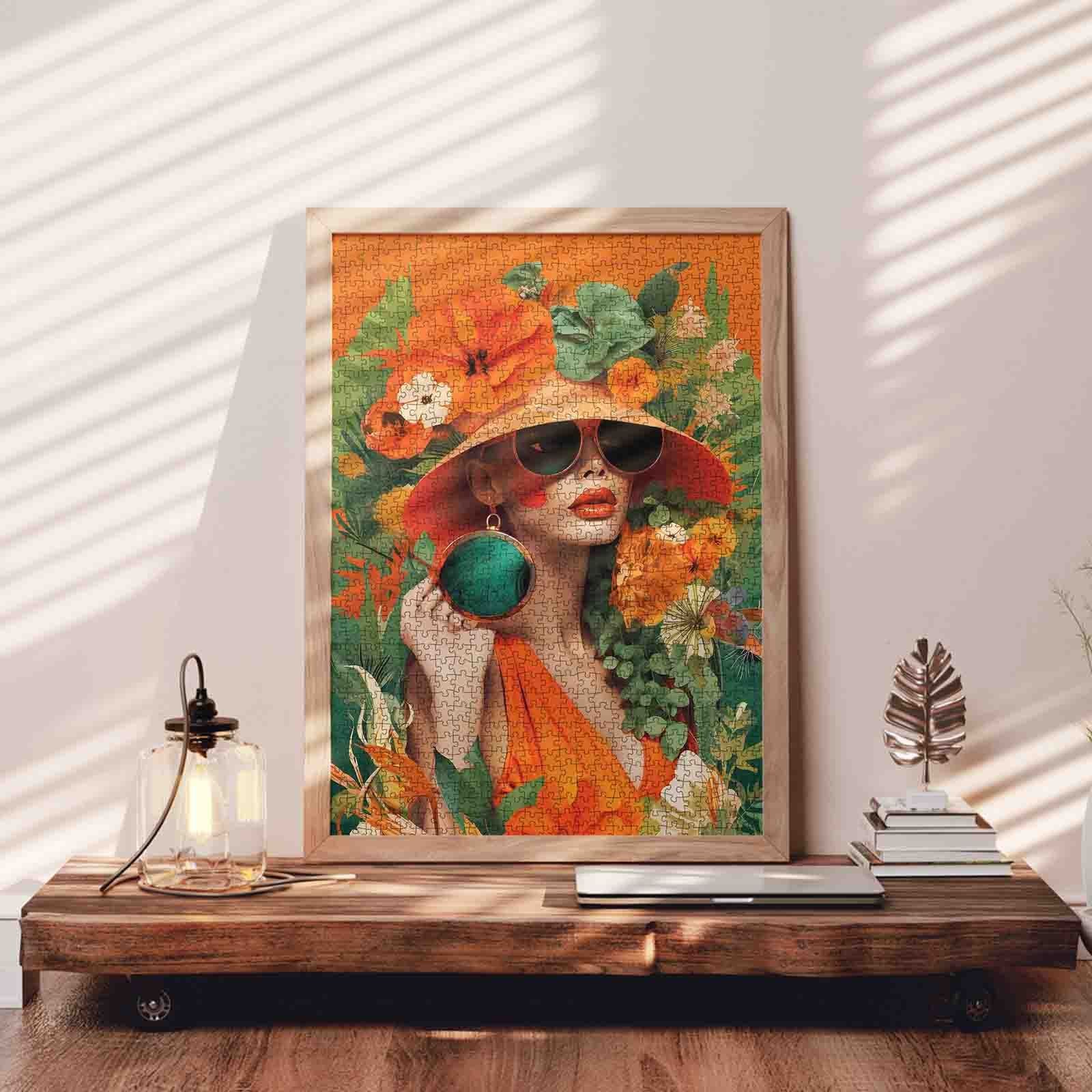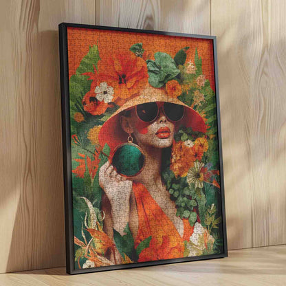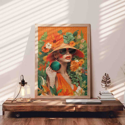 A confident woman in bold orange attire commands attention with her oversized sunglasses, emerald earring, and wide-brimmed floral hat. Tropical leaves and vibrant petals swirl around her like a burst of summer energy, while her red lips and sharp gaze add an edge of glamor. The saturated colors and striking composition make this a stylish challenge for puzzle lovers who adore fashion, flair, and floral fantasy.