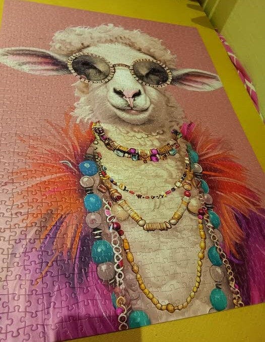 This stylish sheep exudes confidence with its sparkling sunglasses and a vibrant collection of jewelry. Adorned with colorful necklaces and a stunning feathered collar, it’s ready to strut the runway. Its playful yet chic personality shines through, offering a fun and fashionable vibe that adds charm to any space. The intricate details of this fashionable sheep make it a delightful puzzle to piece together, perfect for those who enjoy both animals and stylish designs.