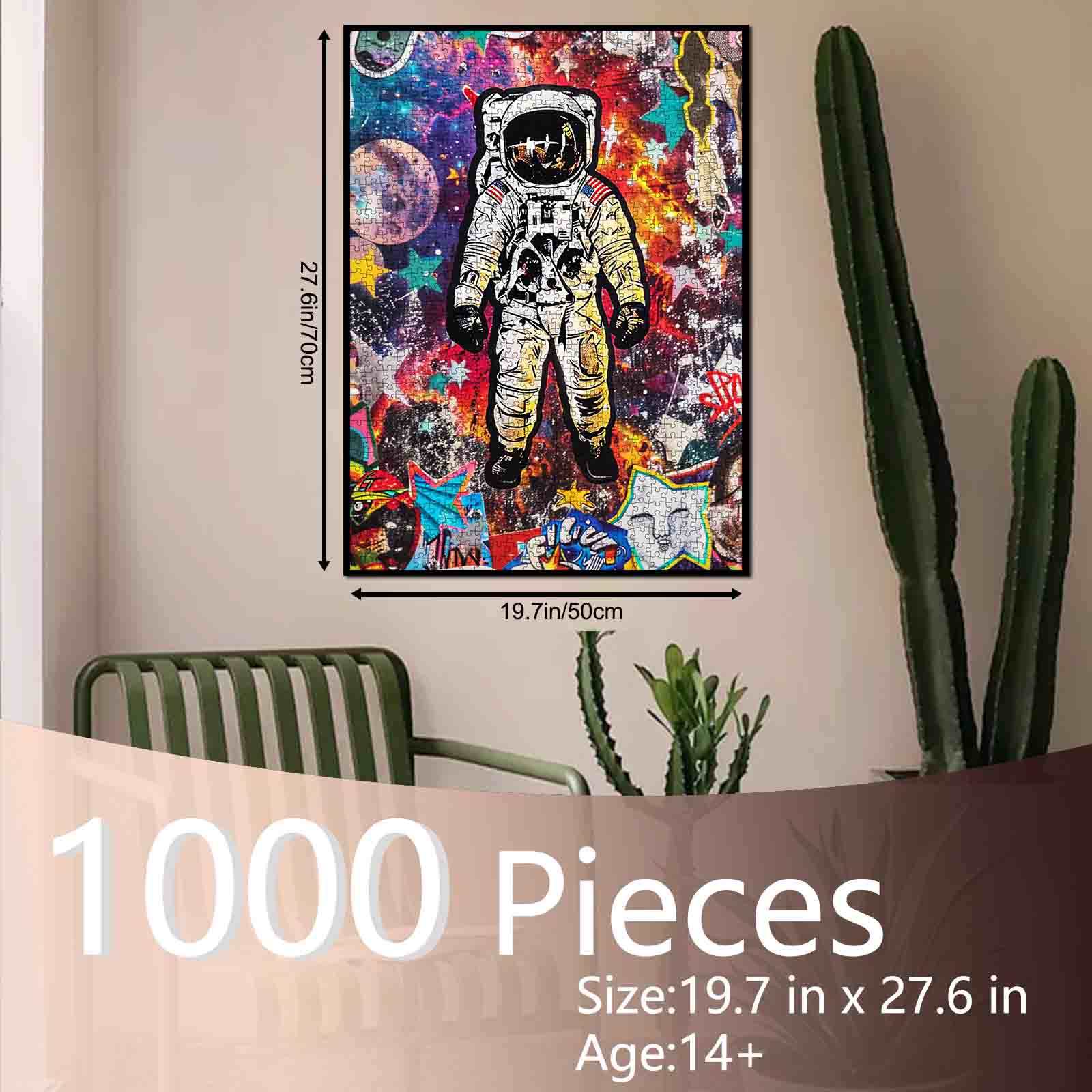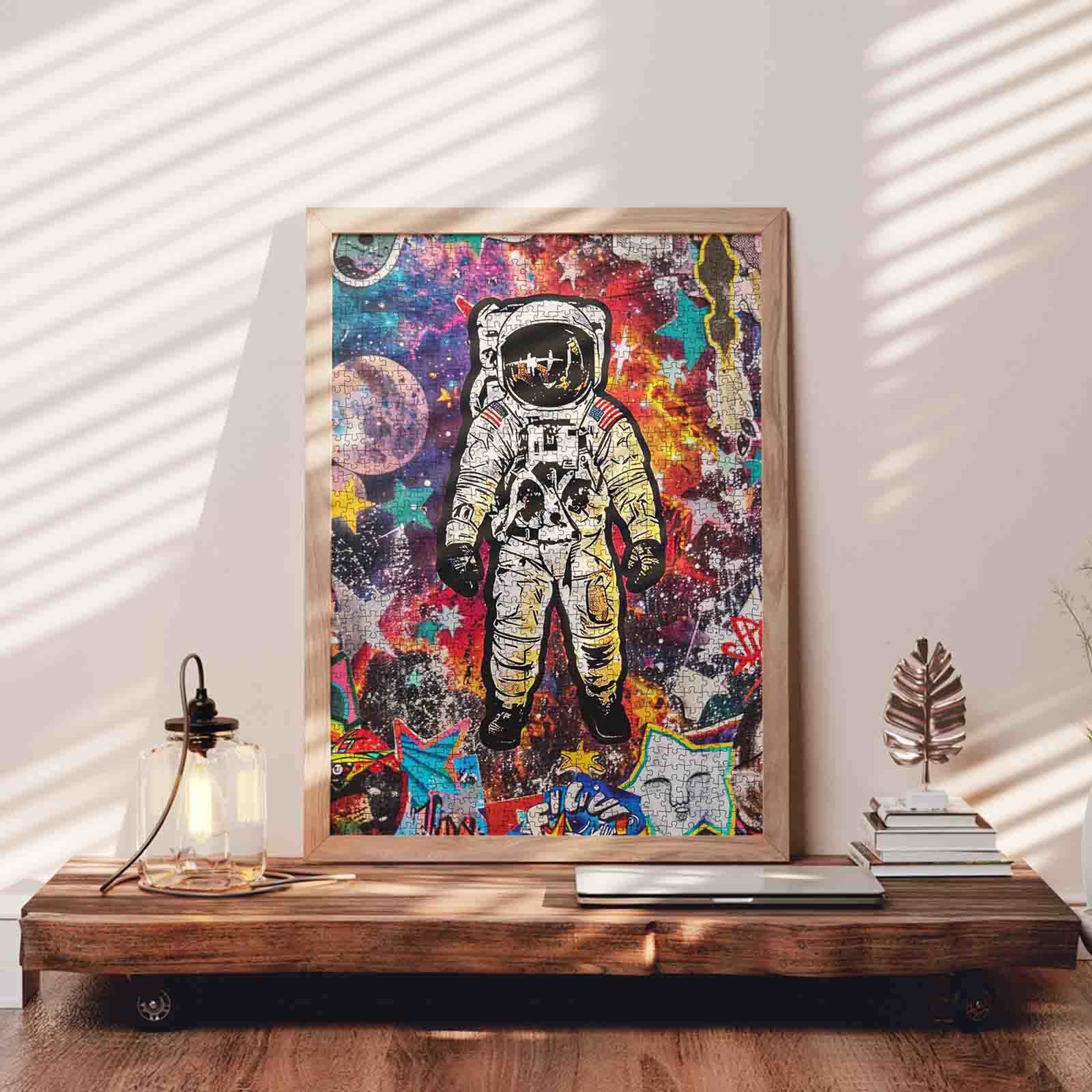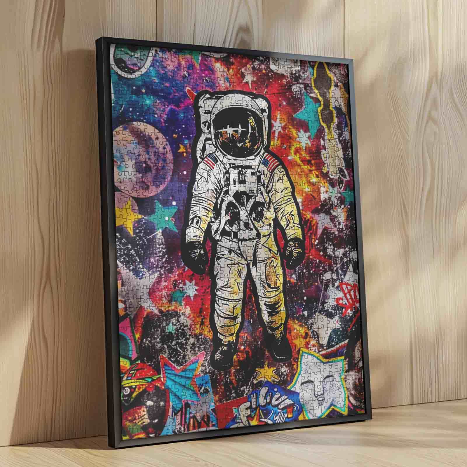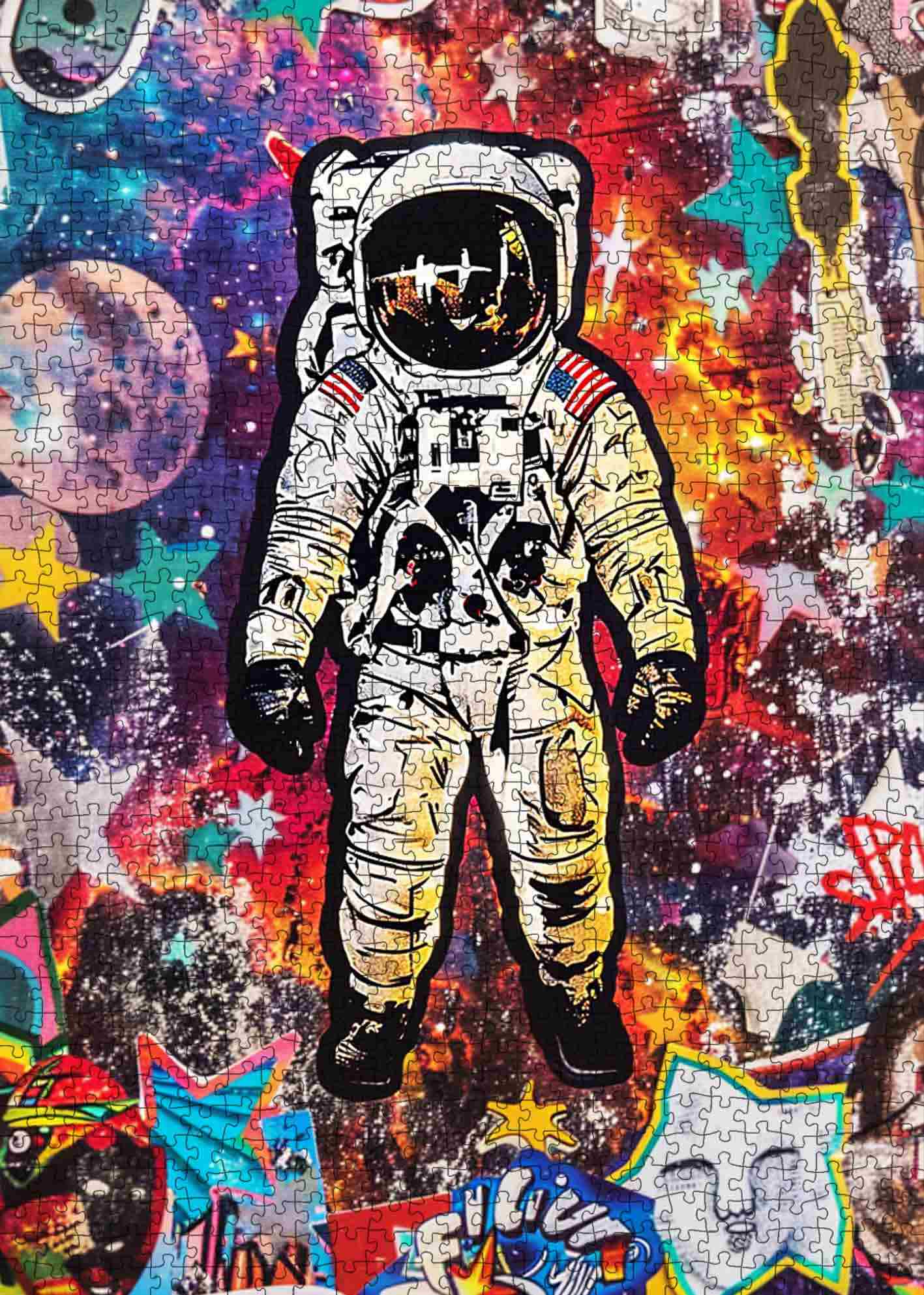 An astronaut floats against a cosmic graffiti wall, his helmet reflecting city lights while stars and neon splashes ignite the space around him. The suit, drawn in thick black outlines and shaded with fiery orange and yellow, pops from the chaotic background of bold tags, planets, and comic-style characters. This puzzle merges street art with space exploration in an energetic visual experience that feels both rebellious and dreamlike.