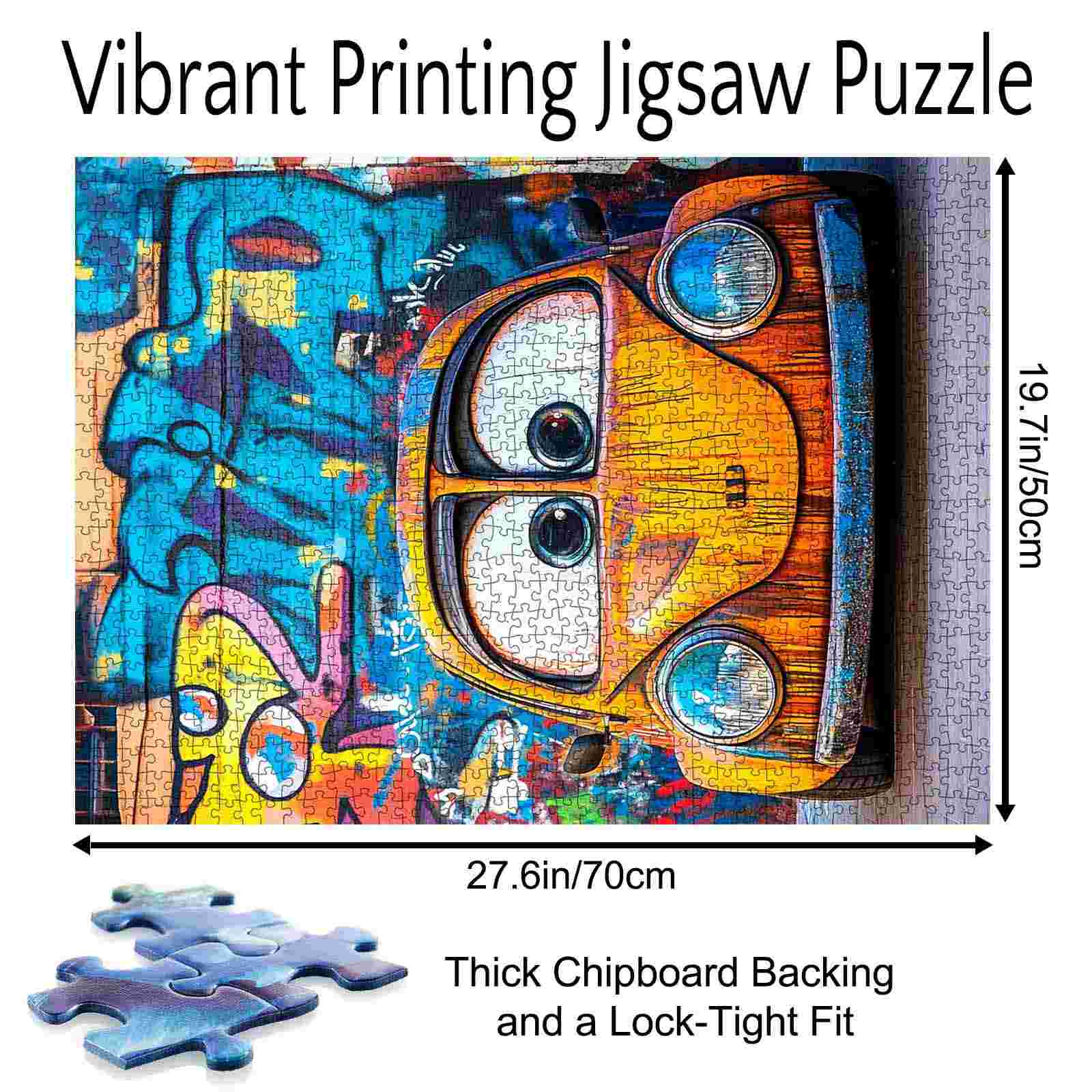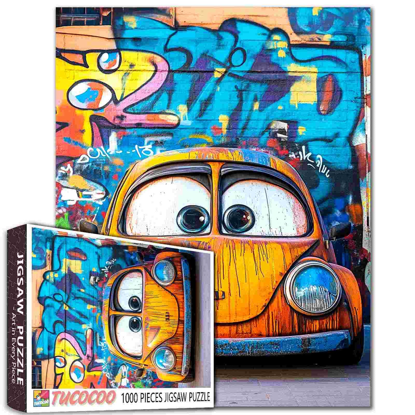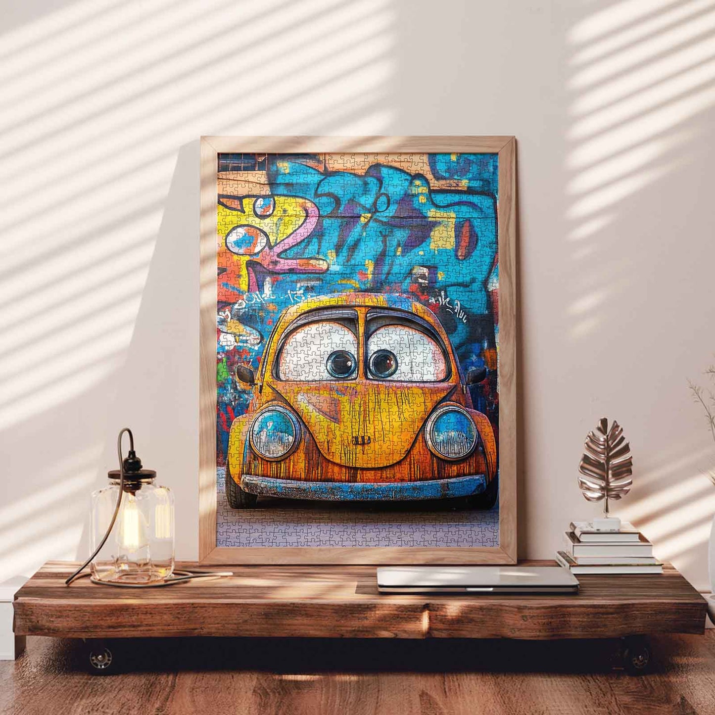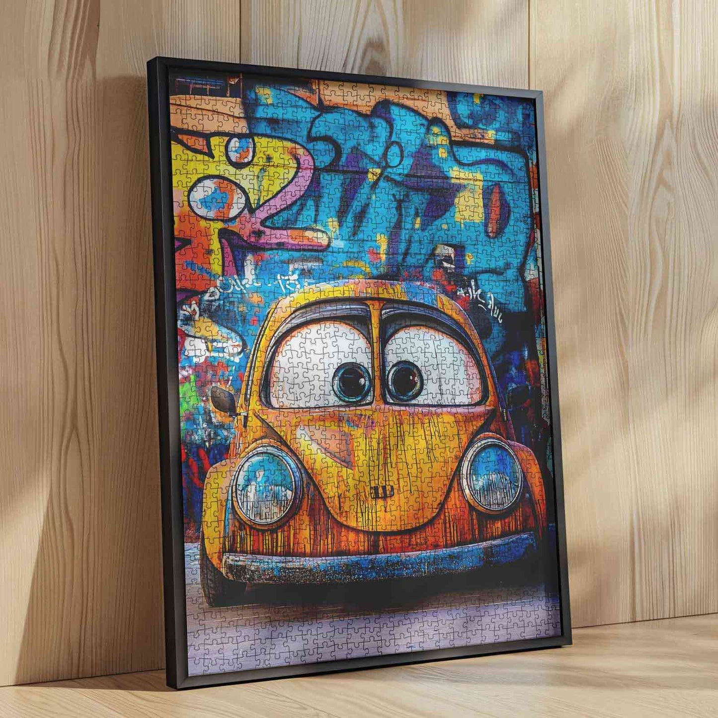 Parked against a wall bursting with street art, a bright yellow Beetle stares back with wide, cartoonish eyes, as if it just rolled out of an animated world. Its rusty streaks and blue-splashed bumper hint at adventures already taken—and more to come. Behind it, a riot of graffiti in electric blue, hot pink, and gold breathes life into the scene, turning an old alley into a whimsical playground. As you piece it together, the little car seems to smile with every connection, inviting you into its world of charm and cheeky fun. A puzzle full of personality and urban spirit.