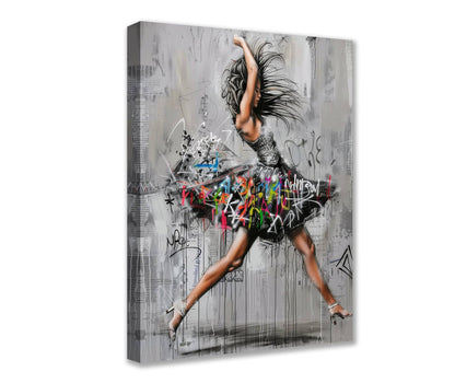 This captivating graffiti artwork showcases a graceful woman mid-dance, surrounded by vibrant street-style tags and colorful splashes. The dynamic lines and expressive strokes capture her energy and elegance, blending urban art with the beauty of movement. Ideal for modern decor, this canvas piece adds a unique touch of passion and vitality to any room. Imagine this bold dancer on your wall, bringing a burst of life and artistic flair into your space.