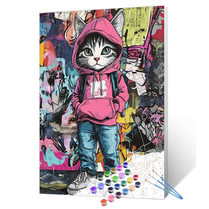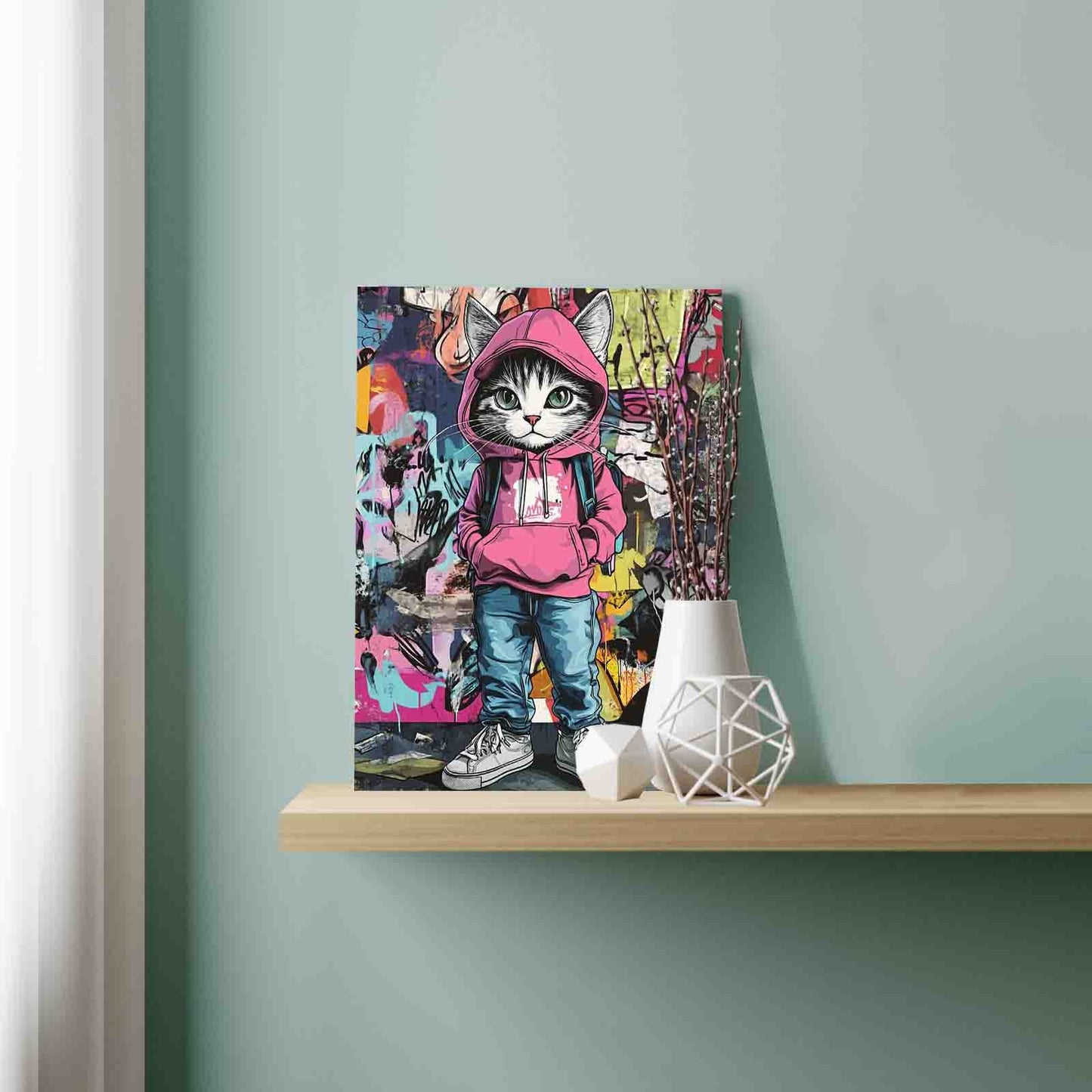A confident cat stands with its paws in the pockets of a bright pink hoodie, wearing sneakers and jeans, set against a wild and expressive graffiti wall. Its sharp green eyes and cool pose bring street style to life in a playful, urban scene. Ideal for fans of edgy art and feline charm.