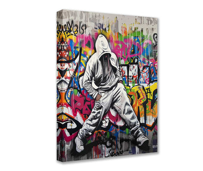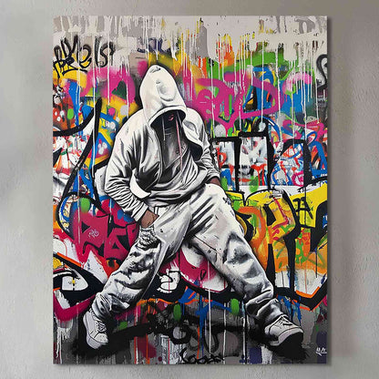 This graffiti artwork captures a mysterious figure in a hoodie, leaning casually against a vibrant backdrop of street art tags and bold colors. The piece exudes an edgy, urban vibe, making it perfect for lovers of street culture and modern decor. The expressive colors and the figure’s stance bring attitude and personality to any space. Imagine this canvas on your wall, adding a unique blend of mystery and creativity to your decor.