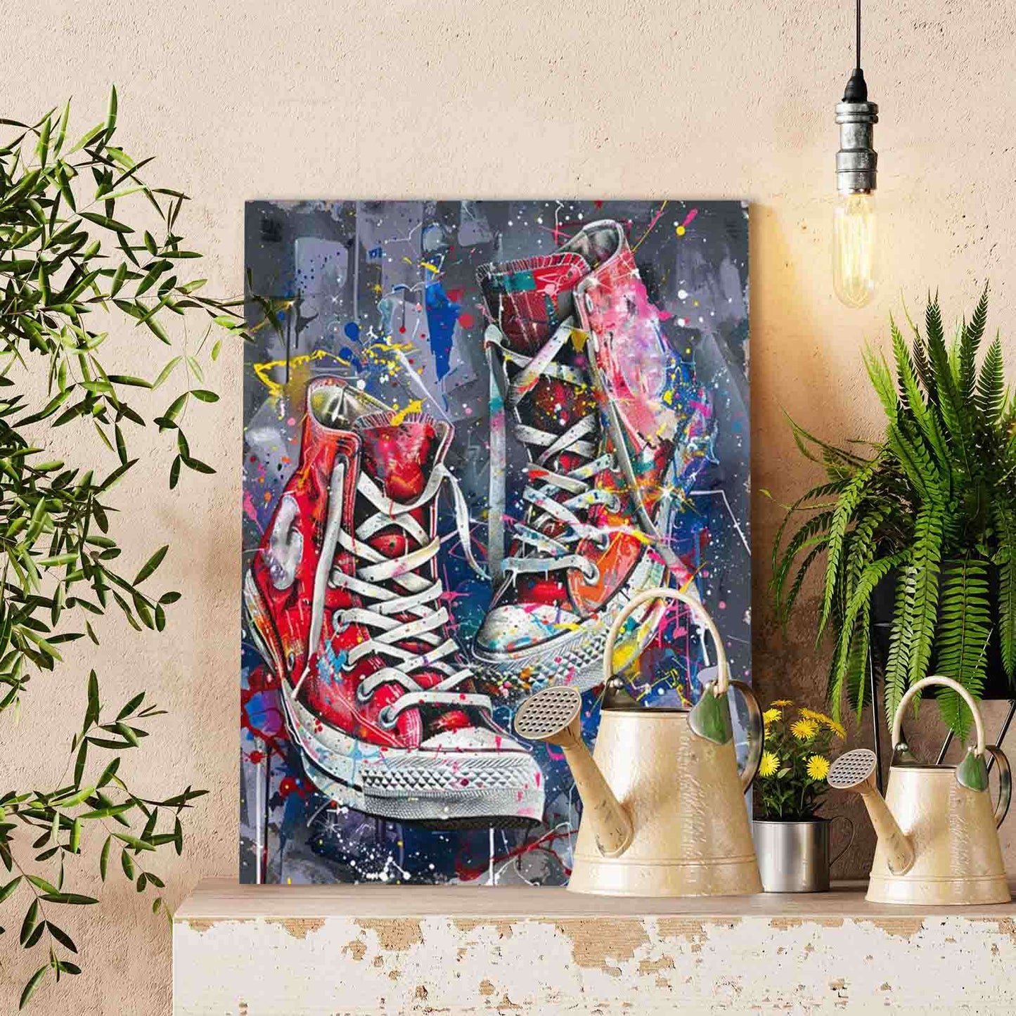 A pair of red high-top sneakers hangs in mid-air, covered in wild graffiti splashes of blue, yellow, white, and pink. Thick laces twist loosely, giving the shoes a rebellious, carefree vibe. Paint drips trail down the soles, while a grey-toned backdrop keeps the energy raw and streetwise. Each stroke feels like a step through the city—untamed and full of life. Ideal for streetwear fans and artists alike, this kit captures the bold style of sneakers that speak louder than words.