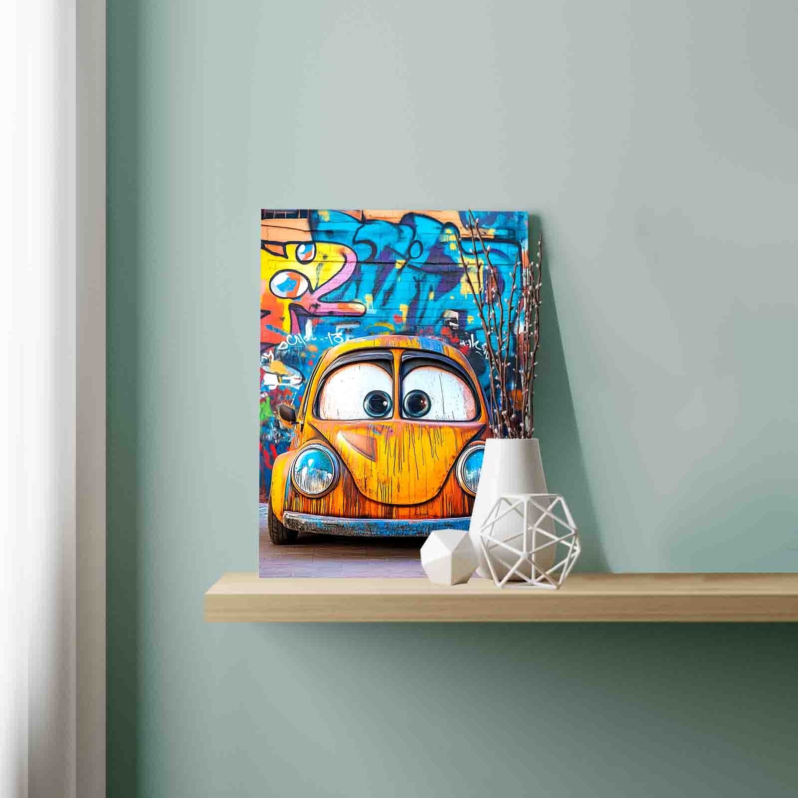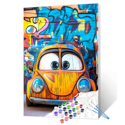 An old-school Beetle covered in vibrant graffiti stands parked along a city wall, its oversized cartoon eyes brimming with curiosity. Behind it, a kaleidoscope of symbols and splashes turns the brick wall into a visual diary of street culture. This scene isn’t just about color—it’s a playful mix of childhood whimsy and urban rebellion. As you fill in each numbered section, it feels like you’re adding your own tag to the mural. No painting skills needed—just follow the numbers to bring this quirky, bold image to life.