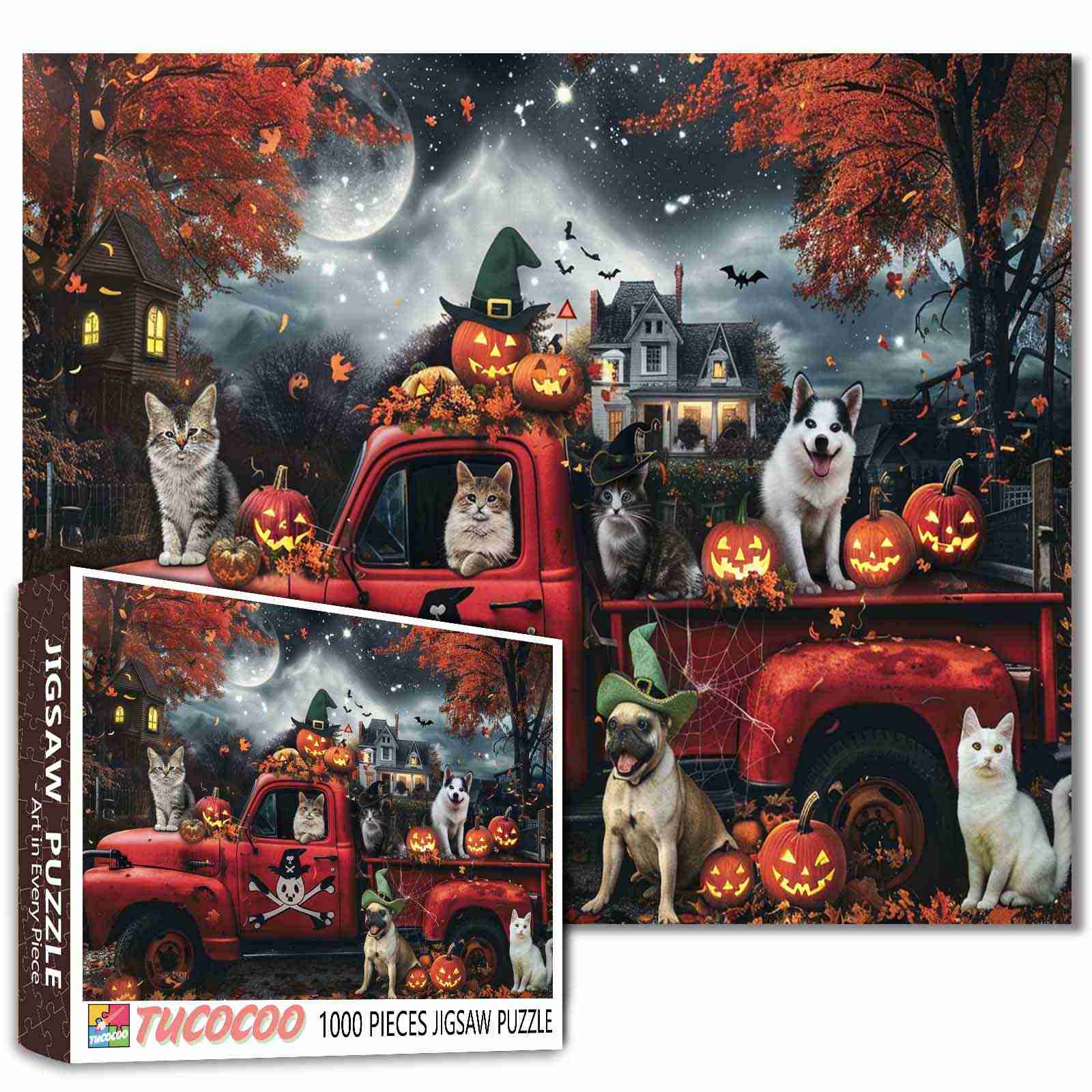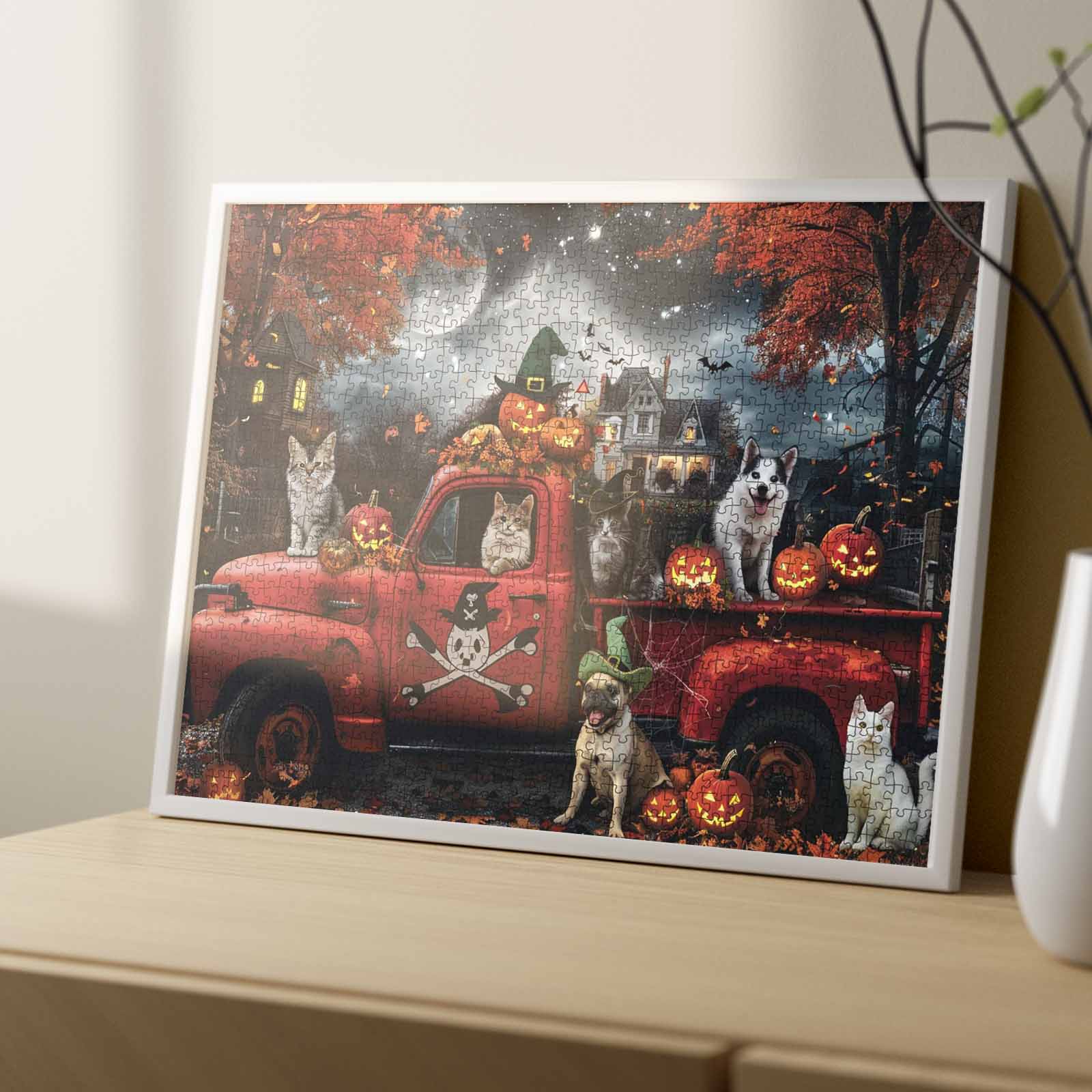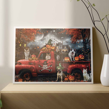 Get ready for spooky fun with this playful Halloween puzzle! A red vintage truck is loaded with adorable cats, a happy dog, and glowing jack-o'-lanterns, all set against a haunted house and eerie autumn night sky. Pirate flags, witch hats, and falling leaves add even more festive charm, making this a must-have for pet lovers and Halloween fans.