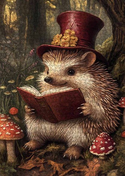 Embark on a whimsical journey with our Hedgehog’s Tale Jigsaw Puzzle. This charming 1000-piece puzzle depicts a sophisticated hedgehog engrossed in a book, donned in a top hat, amidst a magical forest setting. The rich, autumnal hues and playful imagery of mushrooms and forest floor detail add layers of enchantment to the scene. Ideal for those who love animal characters with a touch of fantasy, this puzzle provides a delightful and imaginative escape.