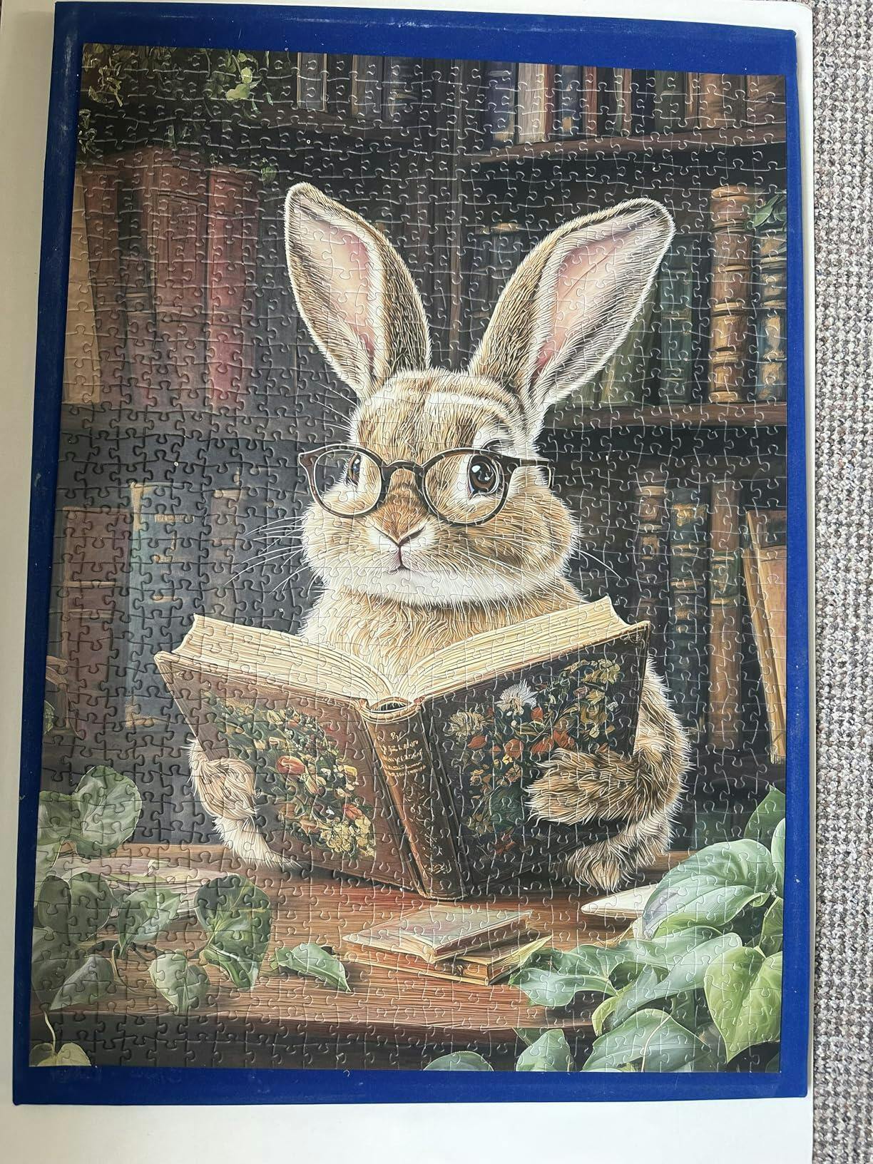A charming rabbit, wearing glasses, is absorbed in a book in front of an ancient bookshelf filled with classic literature. Its focused expression and the serene library setting make this puzzle a delightful challenge. Each piece uncovers the detailed, heartwarming scene, capturing the essence of curiosity and wisdom.