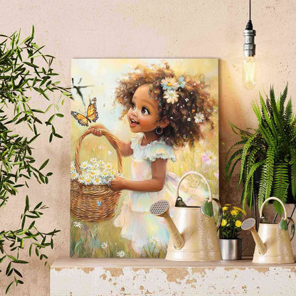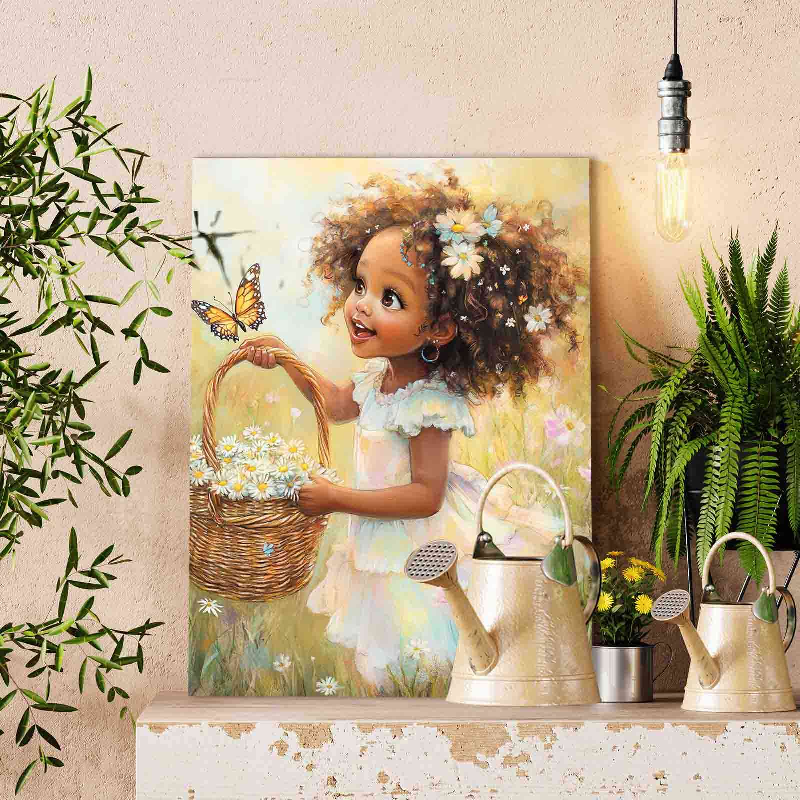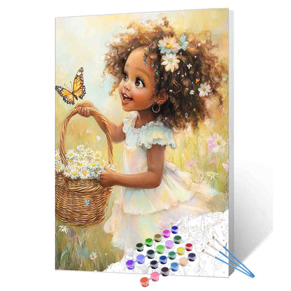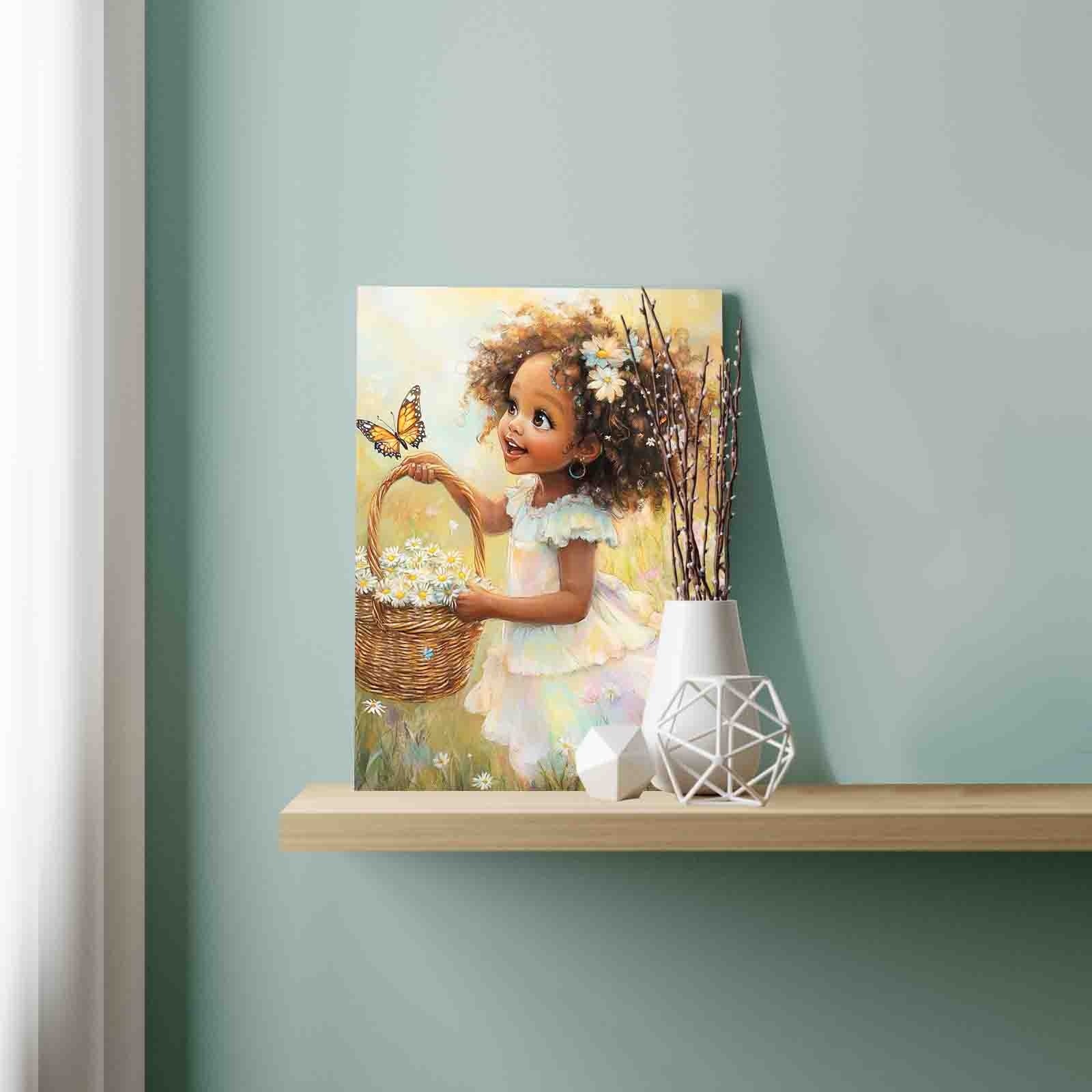 In a field glowing with soft sunlight, a curly-haired girl in a flowing white dress beams with delight. Her basket overflows with fresh daisies, and a butterfly hovers nearby as if caught in the magic of the moment. Her eyes sparkle with wonder, capturing the essence of carefree childhood joy. Bring this heartwarming scene to life stroke by stroke, and relive the purity of summer afternoons.