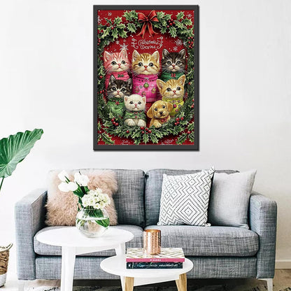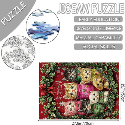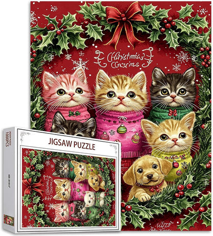 - This adorable Christmas jigsaw puzzle features six adorable kittens and a puppy wearing festive sweaters, surrounded by a holly wreath. It's the perfect way to get into the holiday spirit and a beautiful piece of artwork for your home. Enjoy hours of fun putting it together and then display it proudly!