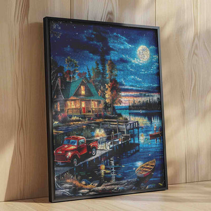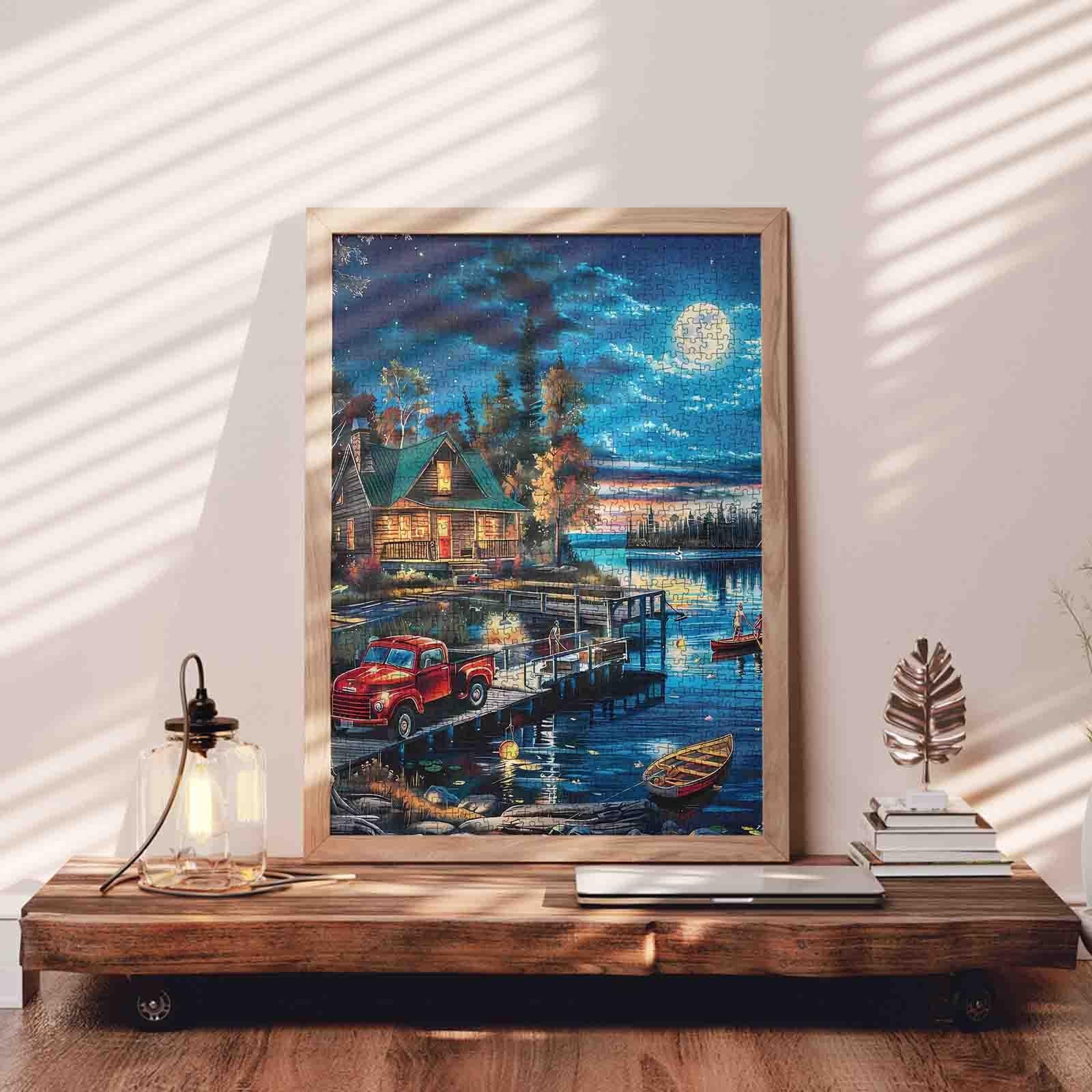 A peaceful lakeside cabin glows under the moonlight, nestled among autumn trees. A red vintage truck is parked by the dock, where people unwind and fish. Small boats float gently in the water, reflecting golden light from the porch. The scene invites you to slow down, breathe in the cool night air, and savor this quiet escape. Piece by piece, the warm lights and shimmering lake pull you into a nostalgic night where time seems to pause.