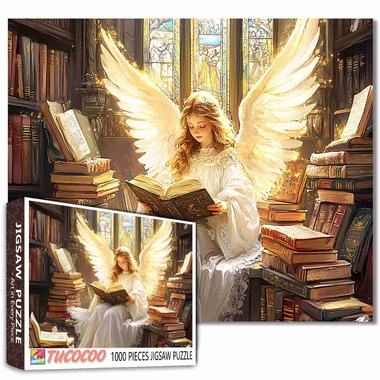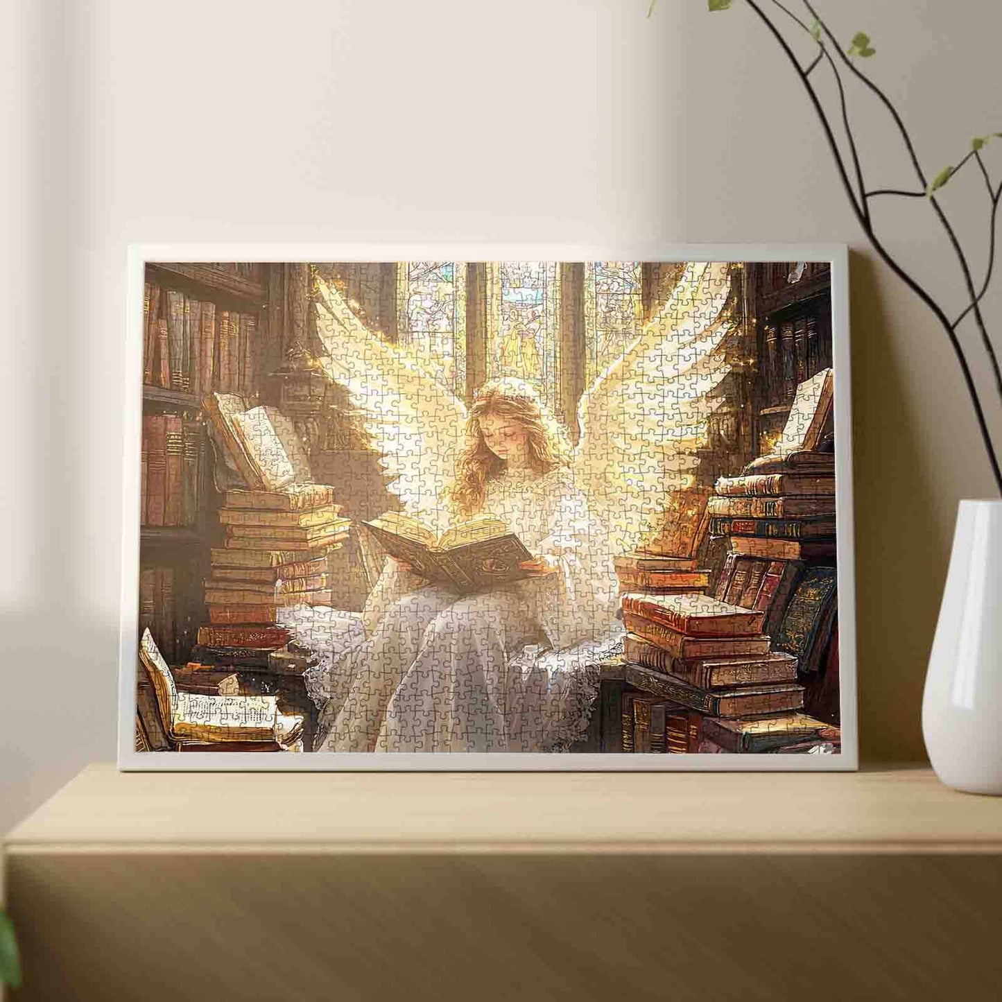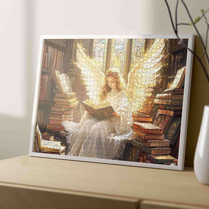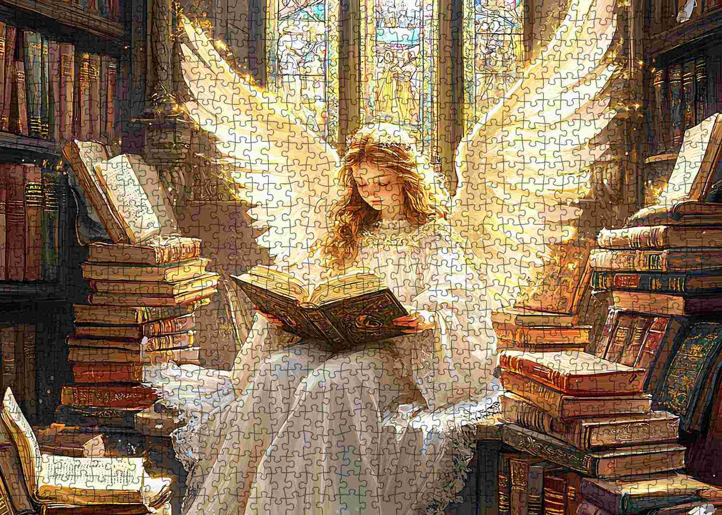 A radiant angel reads quietly in a golden-lit library, surrounded by towers of ancient books and glowing stained glass. This puzzle captures a divine moment of knowledge and peace—perfect for dreamers and book lovers alike.