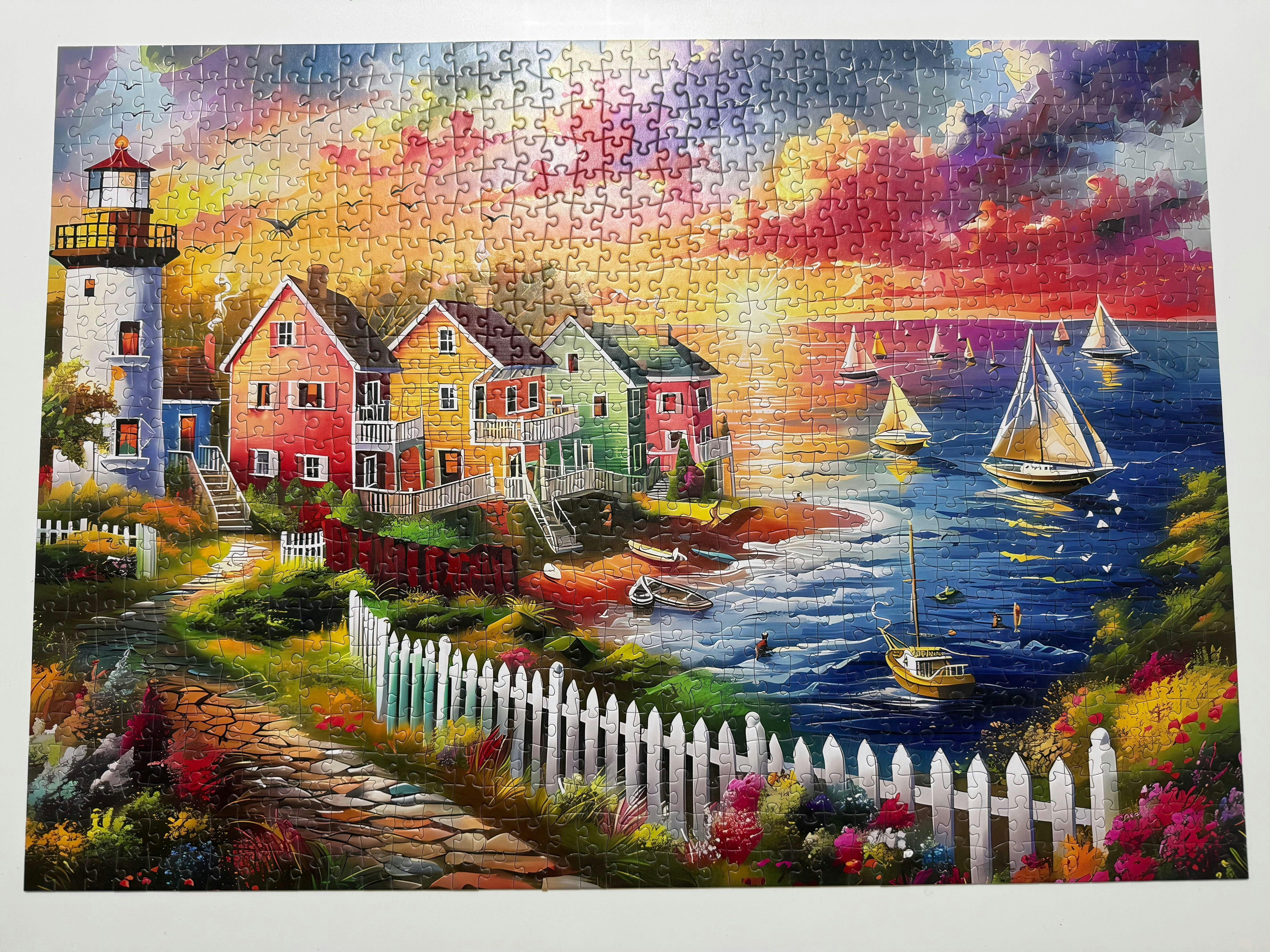 A quaint coastal village glows in the warm light of the setting sun. Vibrant cottages in shades of red, yellow, green, and blue stand near a tall white lighthouse, overlooking a sea dotted with graceful sailboats. A white picket fence winds through blooming gardens, leading to a stone path that guides you toward the horizon. The golden sky reflects in the shimmering waves, making it feel like time has paused in this peaceful moment. Ideal for puzzle lovers who dream of oceanside serenity.