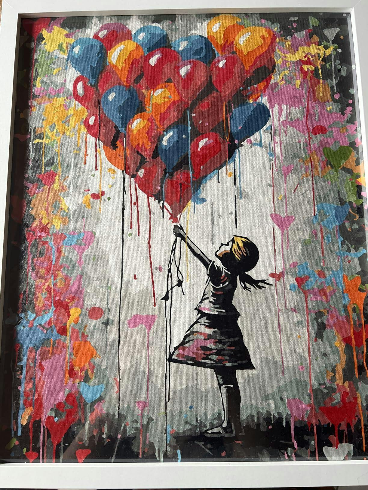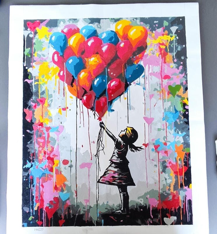A little girl stretches up with joy, clutching a colorful bunch of balloons that form the shape of a heart. Each balloon gleams with bold reds, blues, and oranges, lifting into a sky filled with dripping paint and dreamy splashes. The background melts into a spray of hearts, like the world is cheering her on. This piece captures a moment of hope, innocence, and pure love—perfect for bringing warmth and color to your creative time.