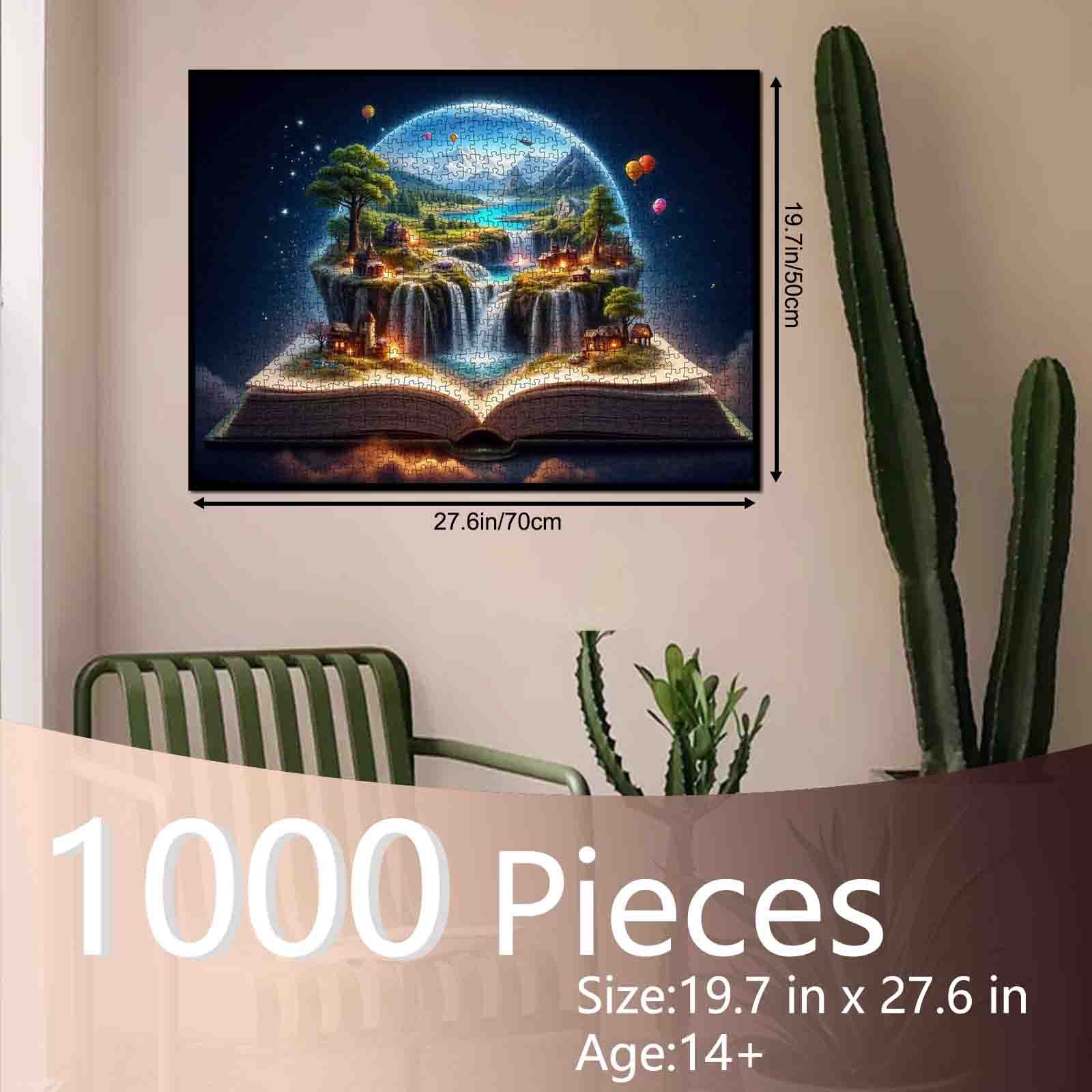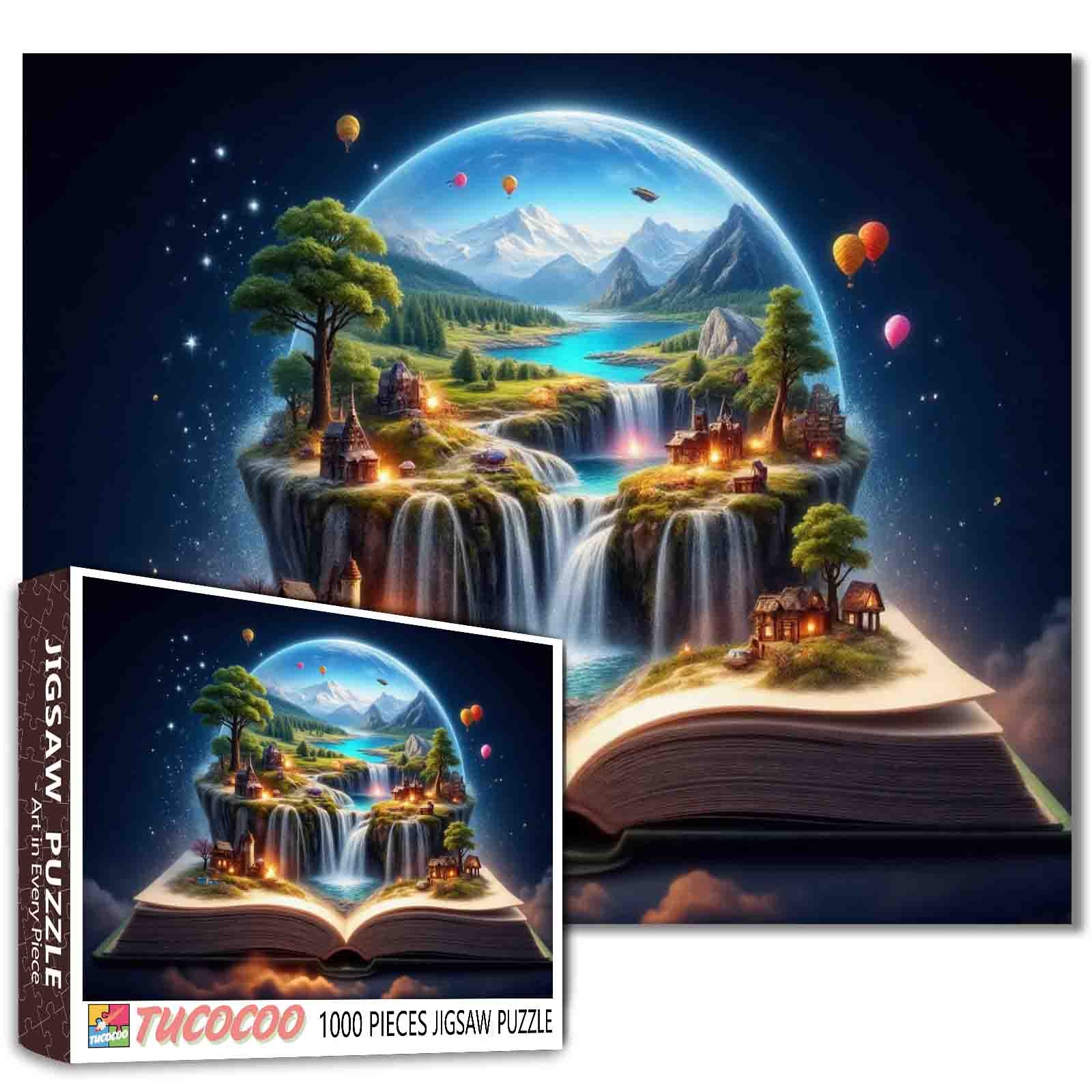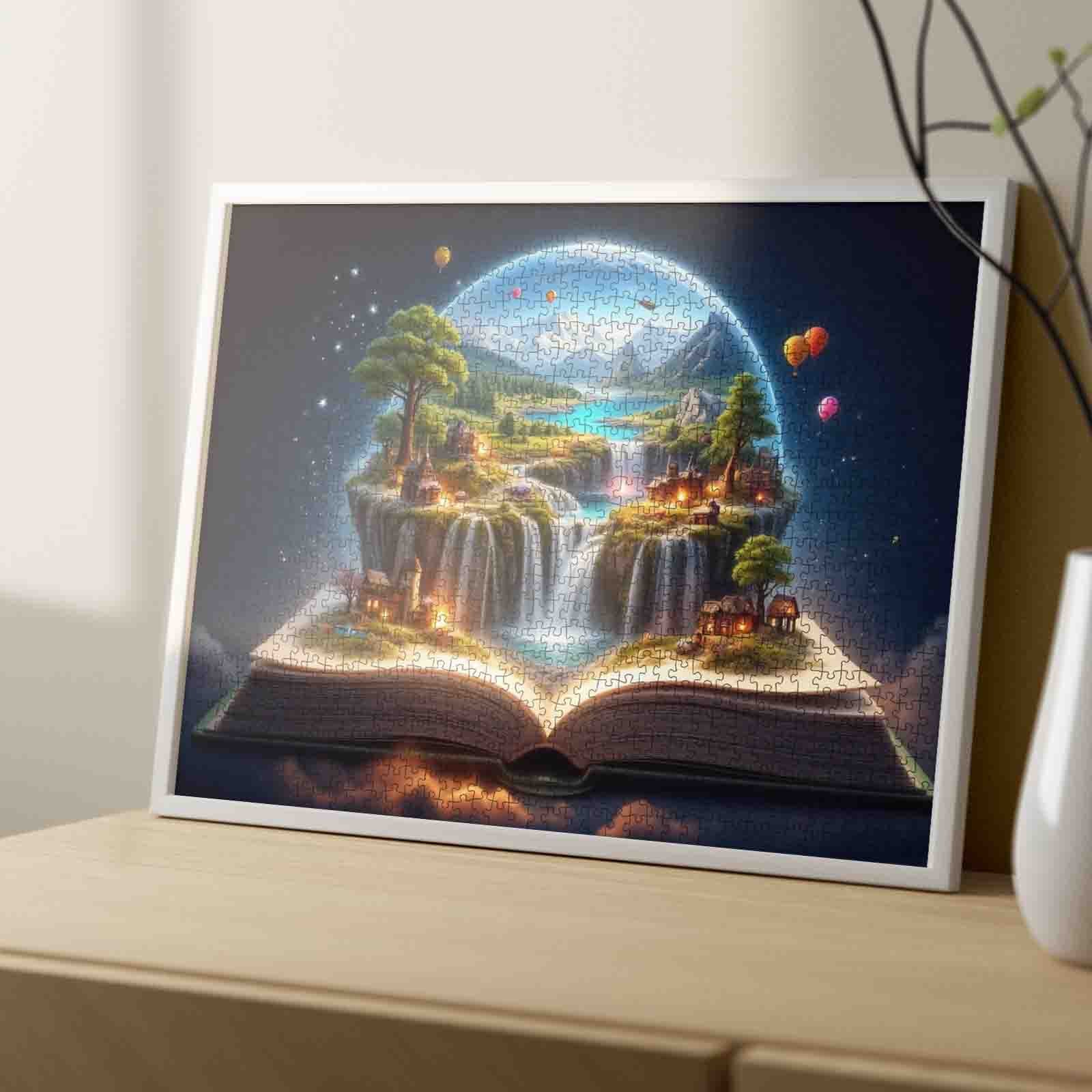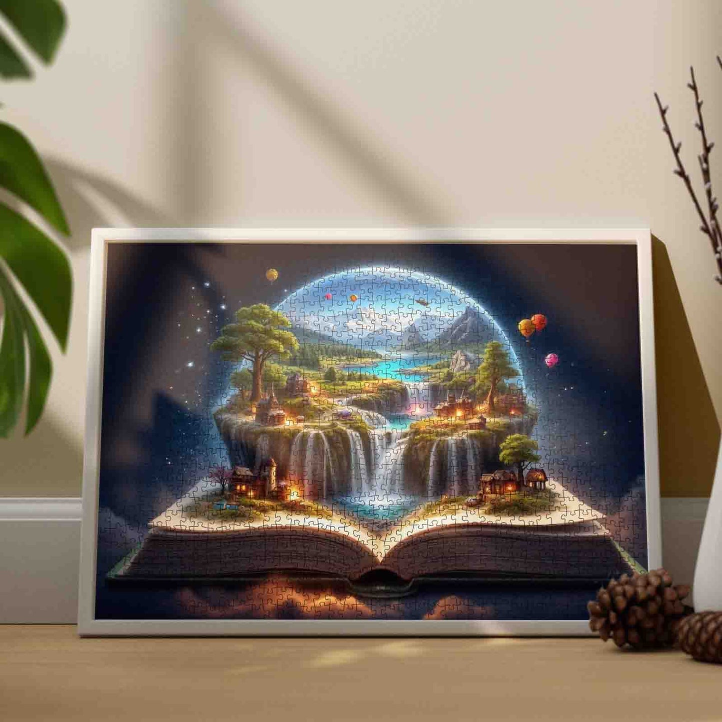 Open the pages of imagination and find a miniature fantasy world bursting to life from a storybook. Waterfalls tumble from grassy cliffs, tiny houses glow with warm lights, and a bright blue river winds through the heart of the scene. Balloons float into a sky protected by a magical dome, and distant mountains promise adventure. As you assemble each piece, you’ll discover hidden stories and charming details that make this puzzle a true celebration of creativity. Perfect for dreamers and storytellers, this enchanting puzzle is an invitation to journey into a realm where every corner hides a new surprise.