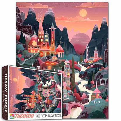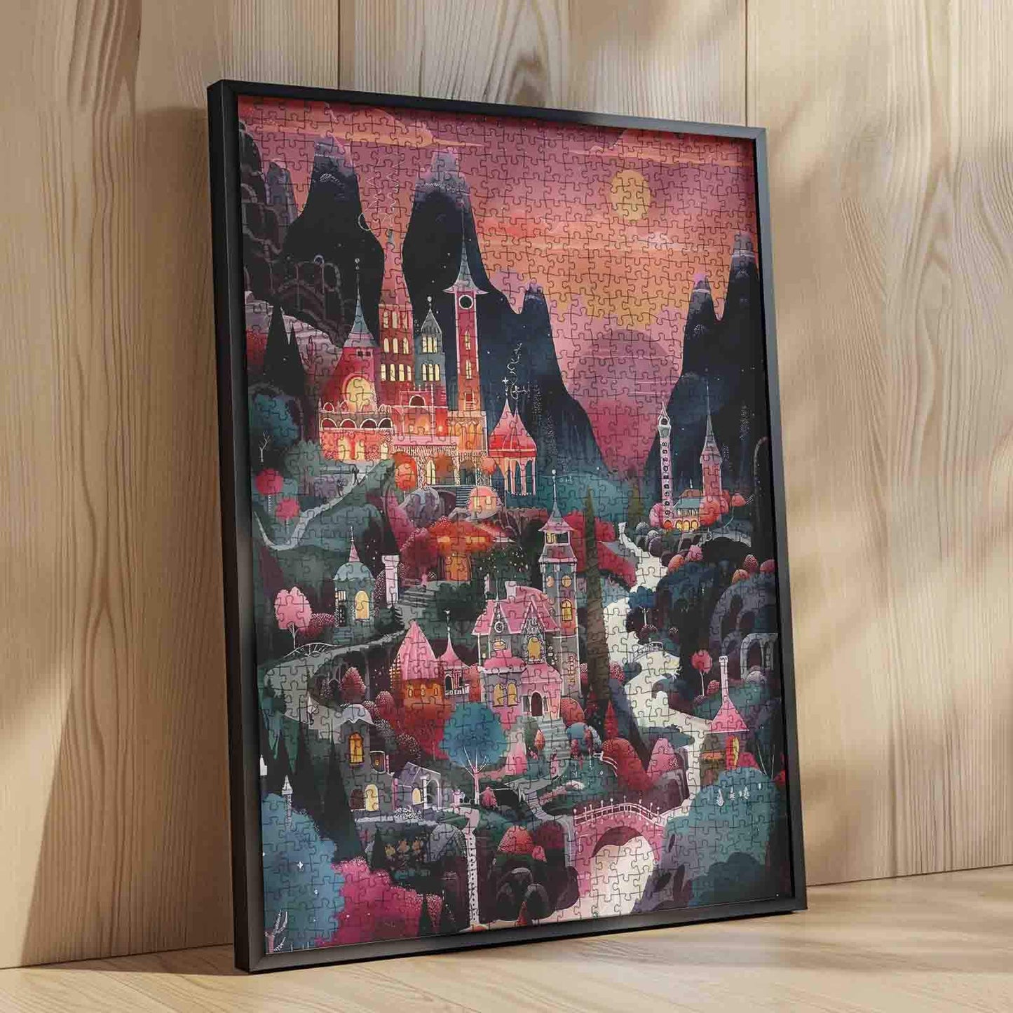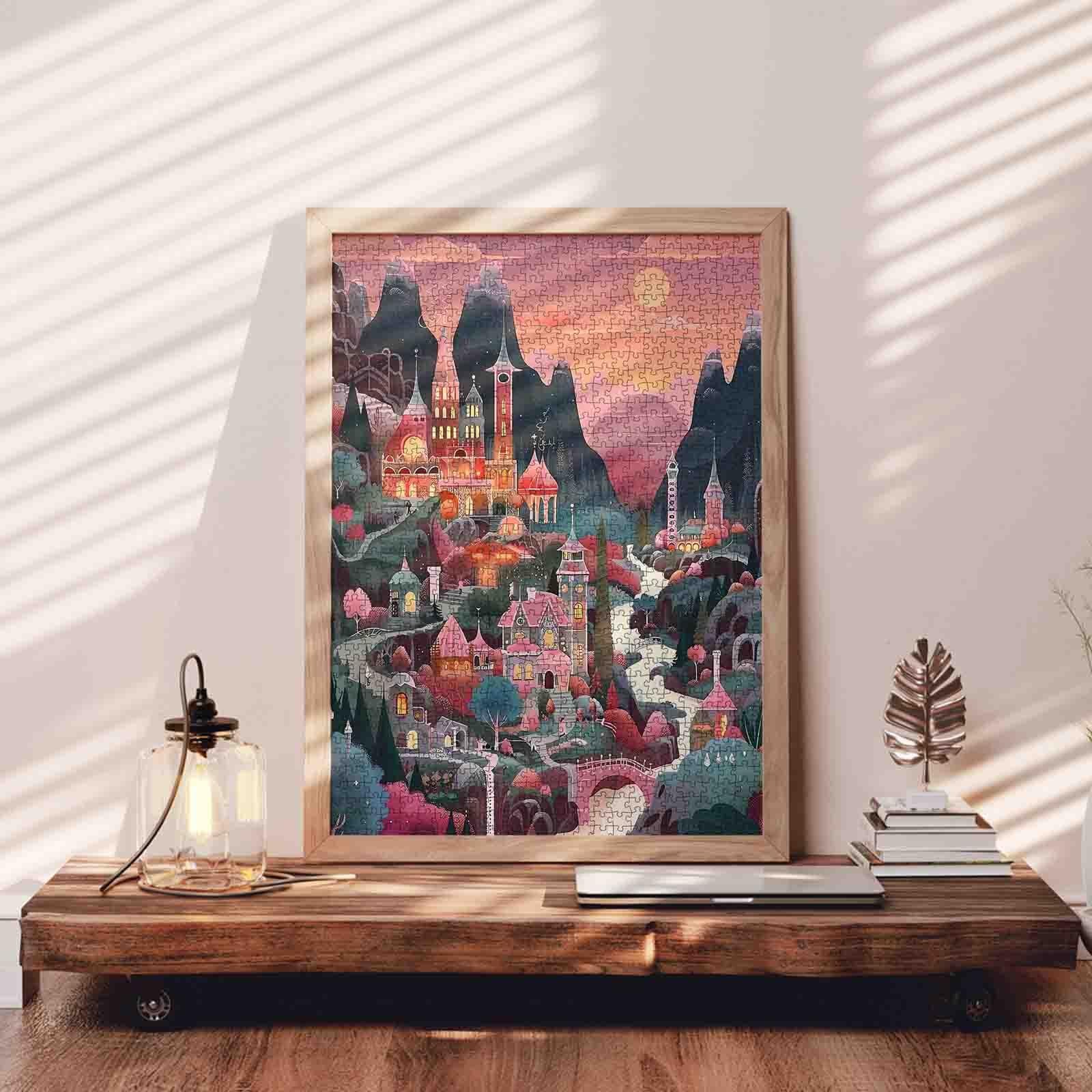 Step into a dreamy fairytale world where pink castles glow under a setting sun and winding rivers snake through enchanted valleys. The scene is alive with whimsical architecture, flickering lights, and charming towers nestled in fantasy forests. Solving this puzzle feels like unlocking a hidden storybook village full of wonder, mystery, and magical peace.